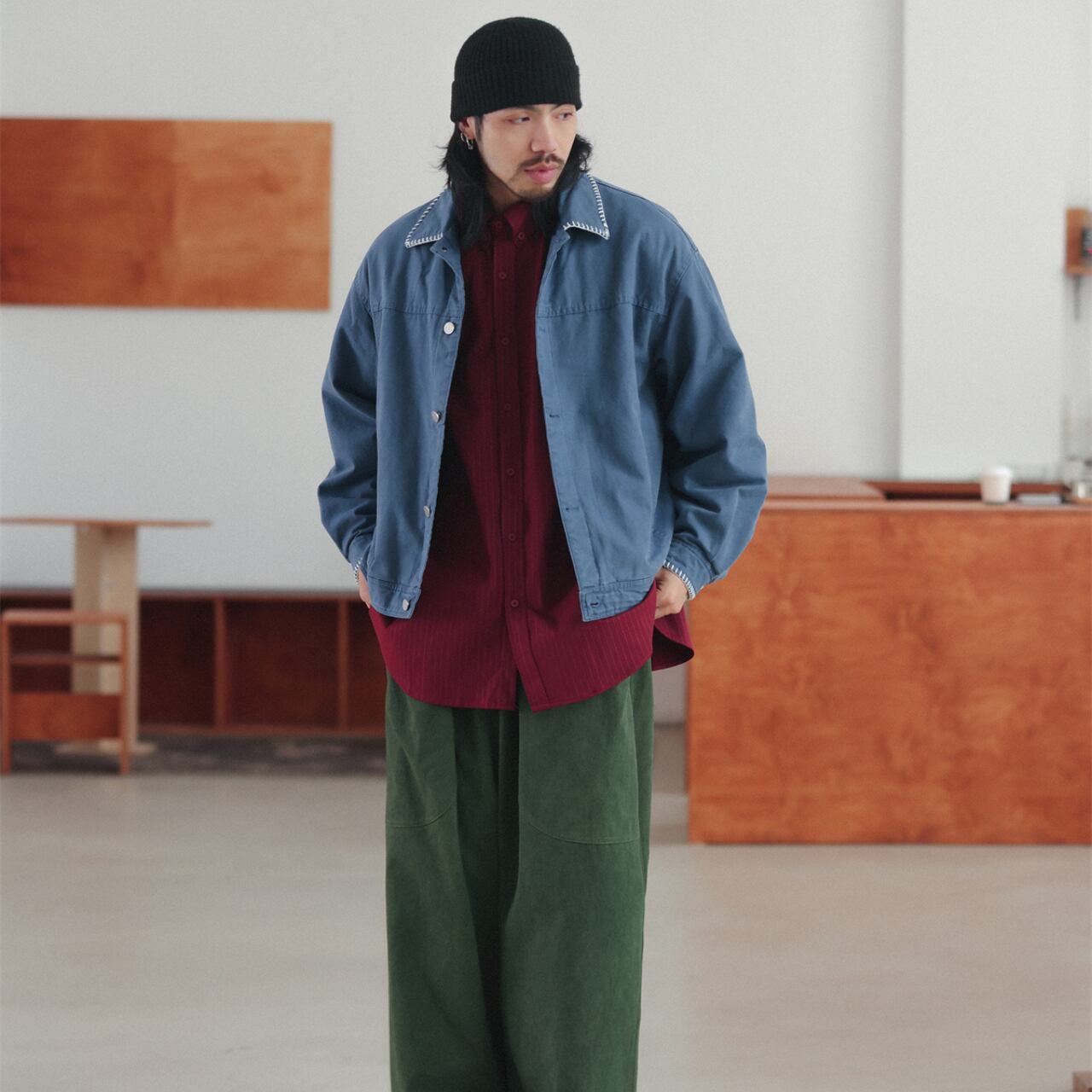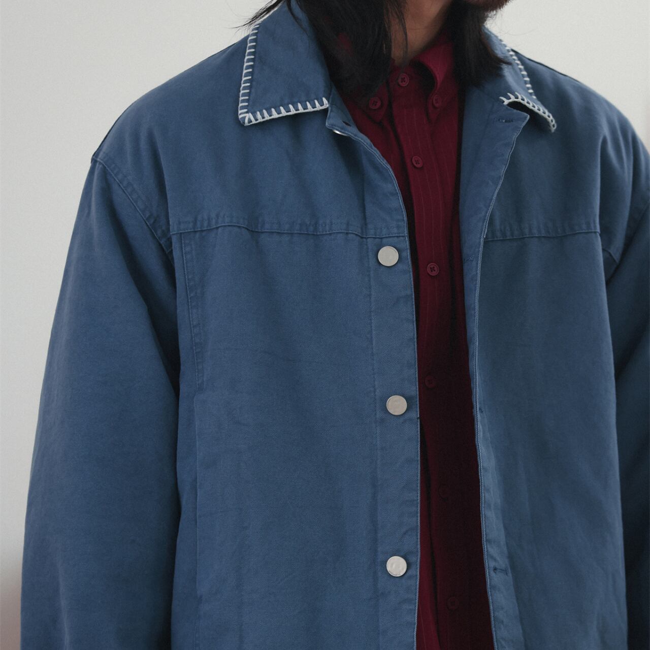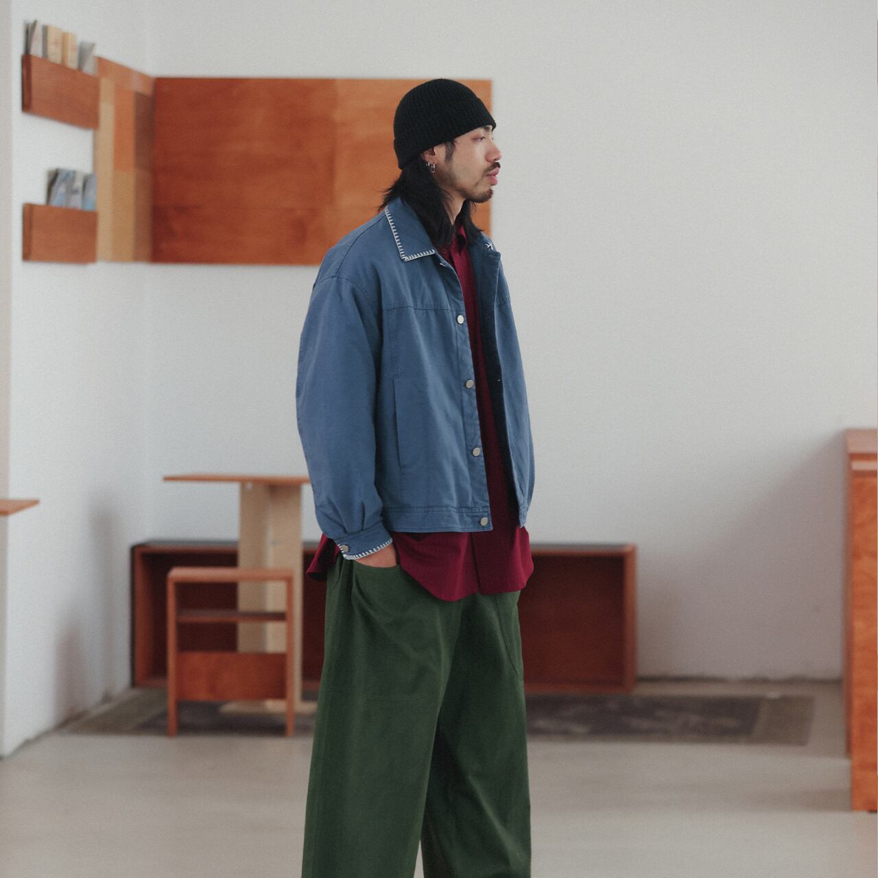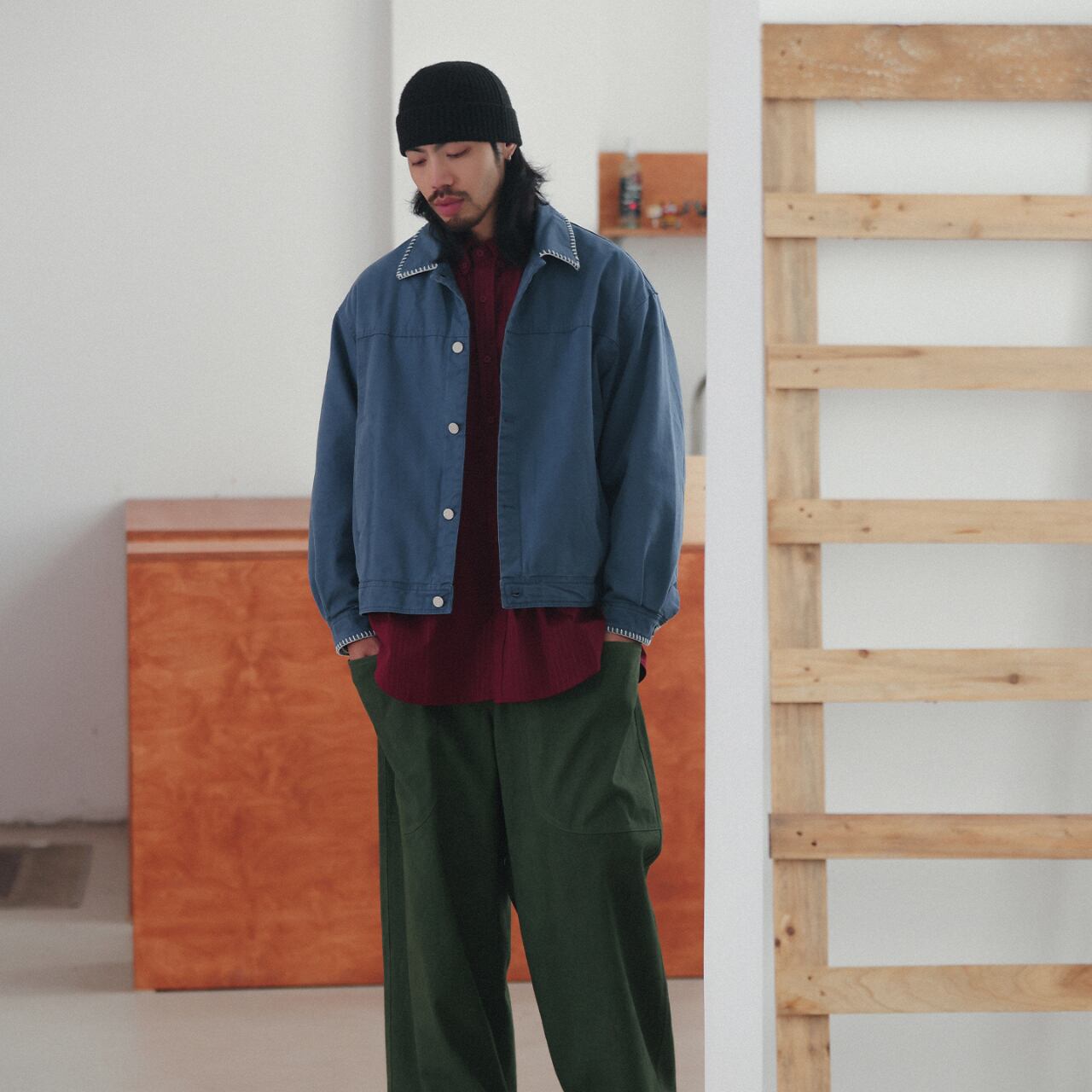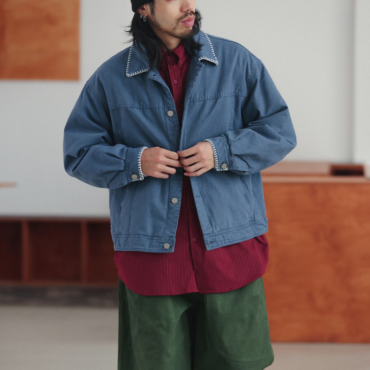 襟や袖口に施された配色のトリムがアクセントのコットンジャケット。程よく肉厚な100%コットン素材は、しっかりとした着心地とナチュラルな風合いが魅力。裏地付きで風を通しにくく、秋冬のライトアウターとして最適です。