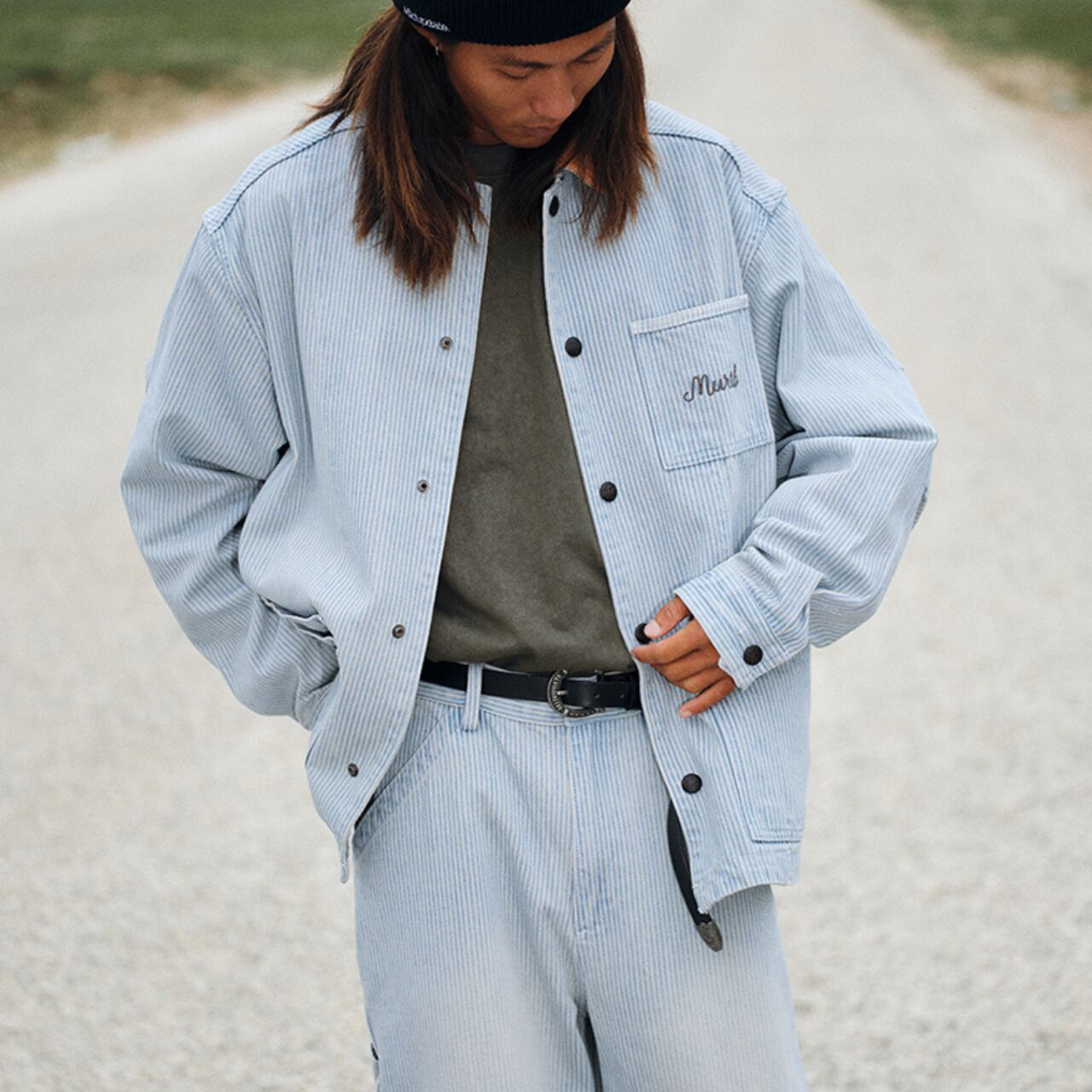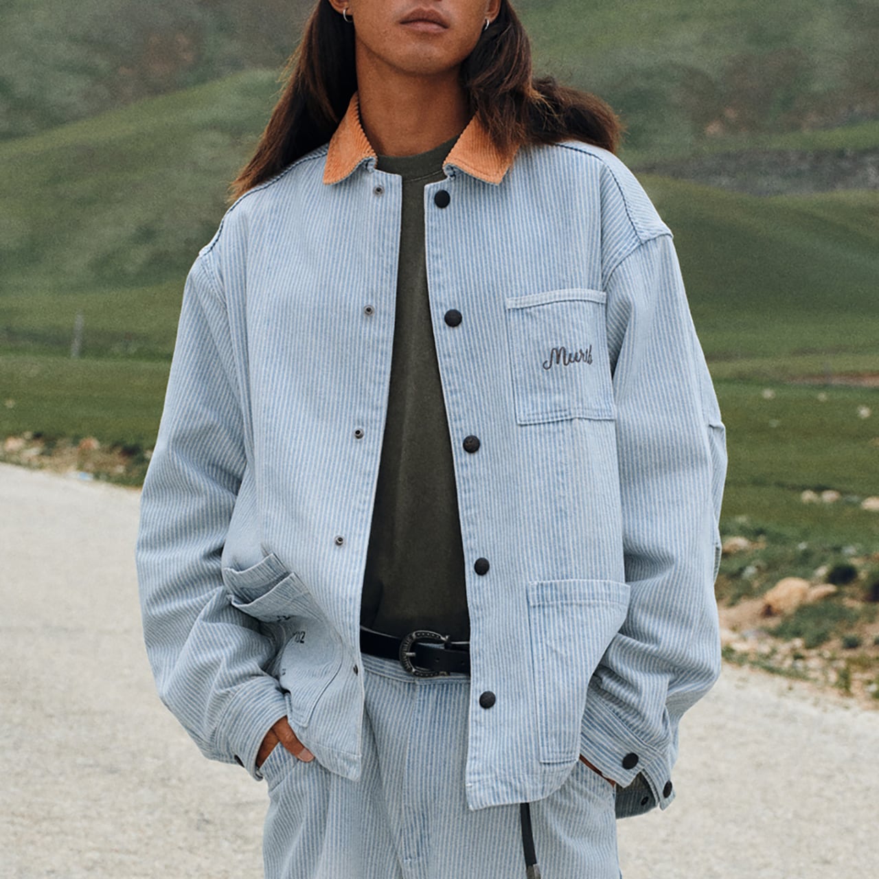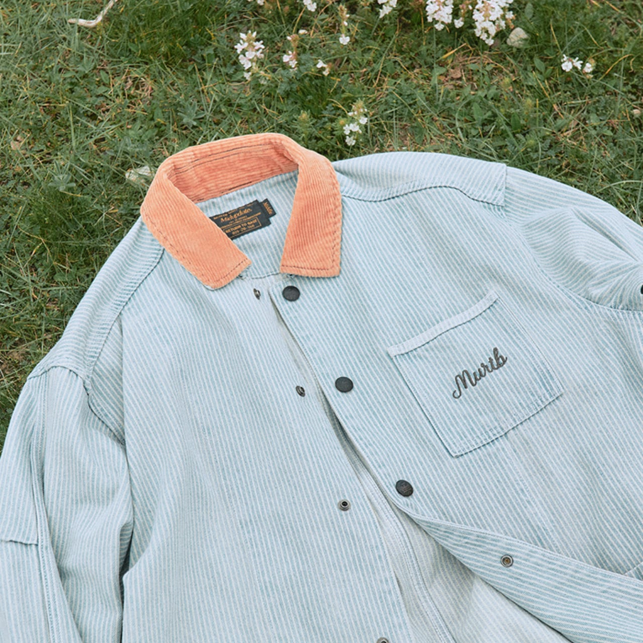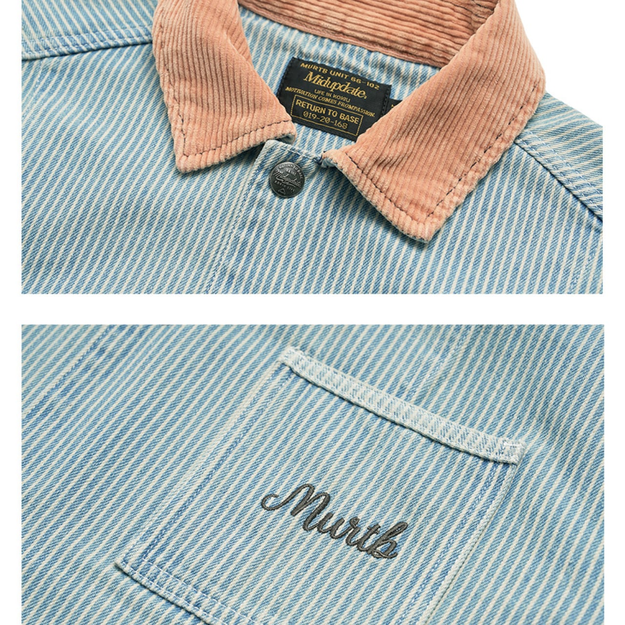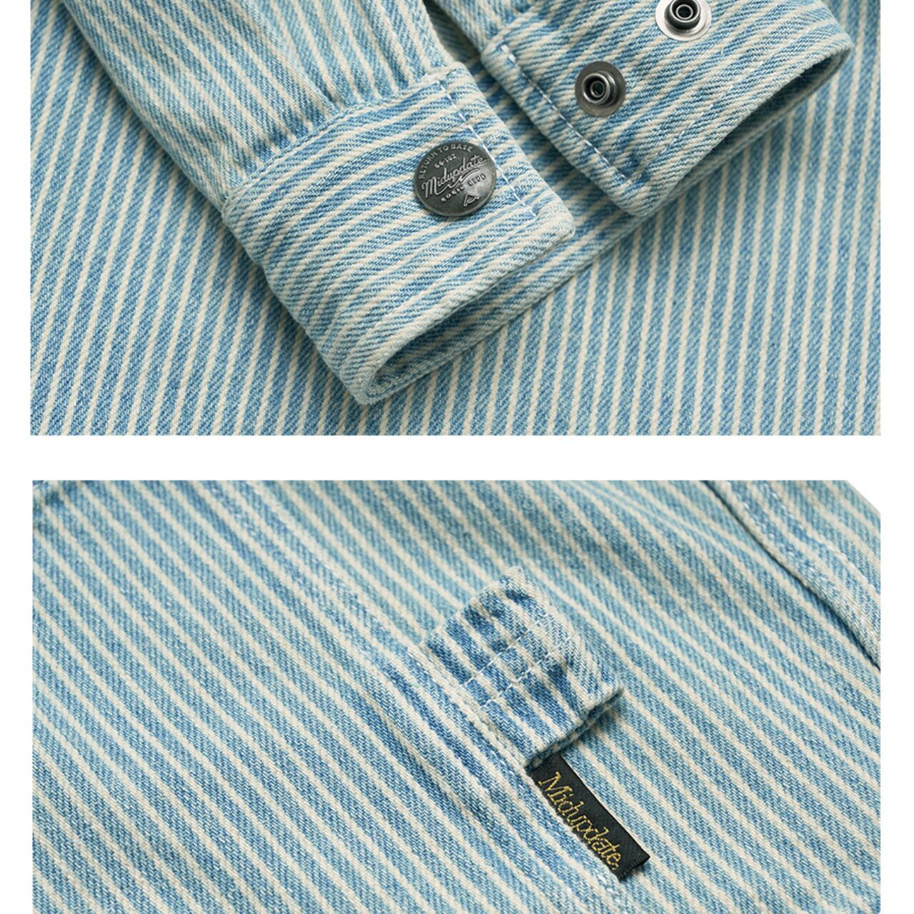 くすんだブルーストライプにフェード加工を施した、リラックス感漂うワークシャツジャケット。ポイントは、ヴィンテージ感あるコーデュロイの切替え襟と、胸元の刺繍ロゴ。軽い羽織り心地で、シャツとしてもアウターとしても着回せる万能アイテム。