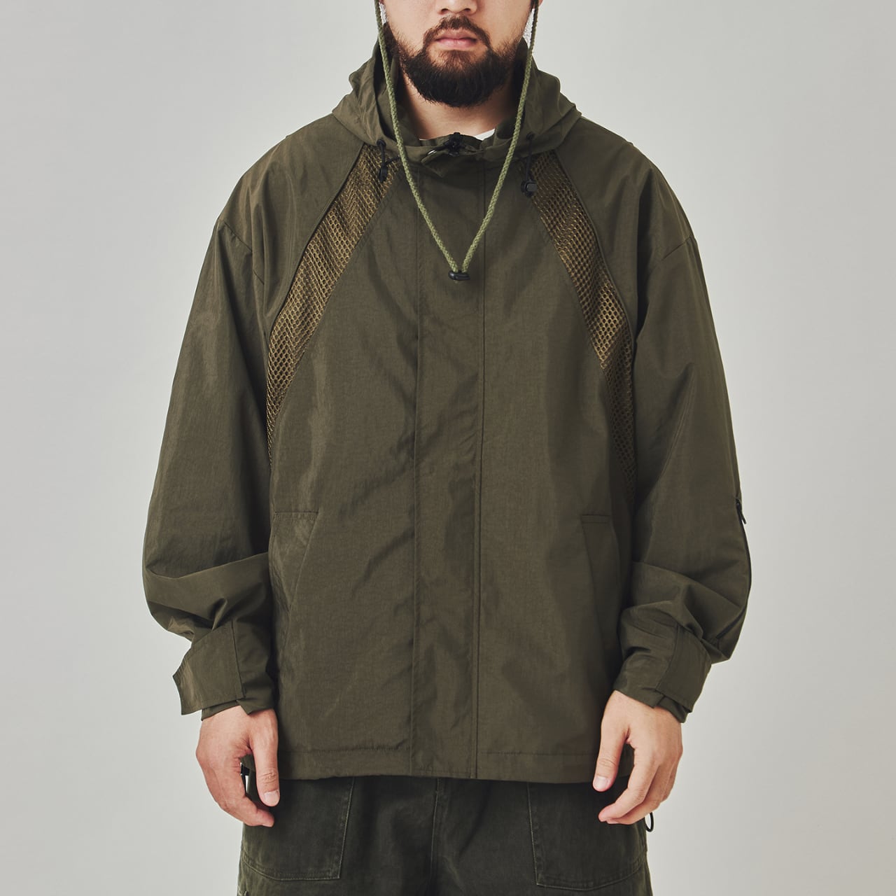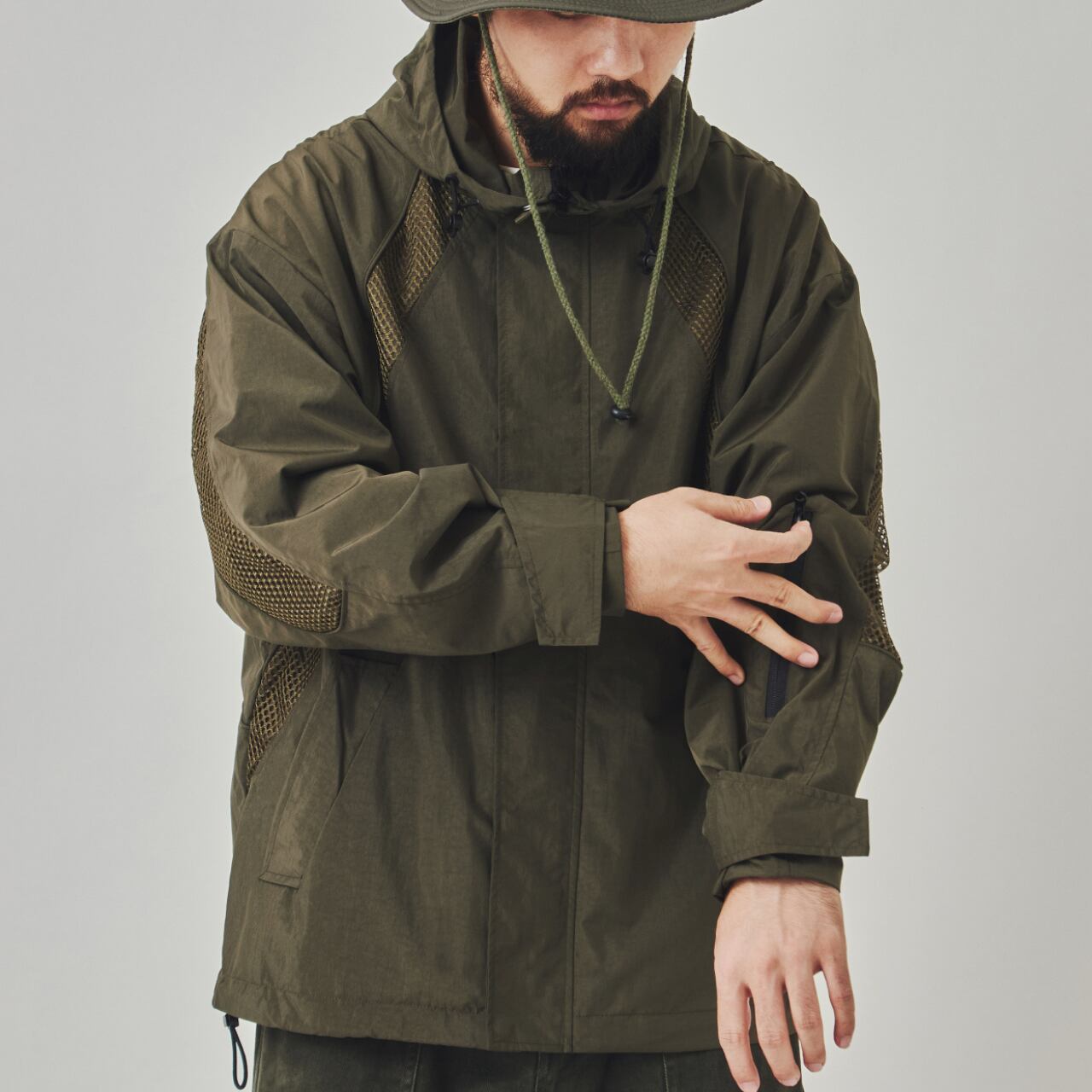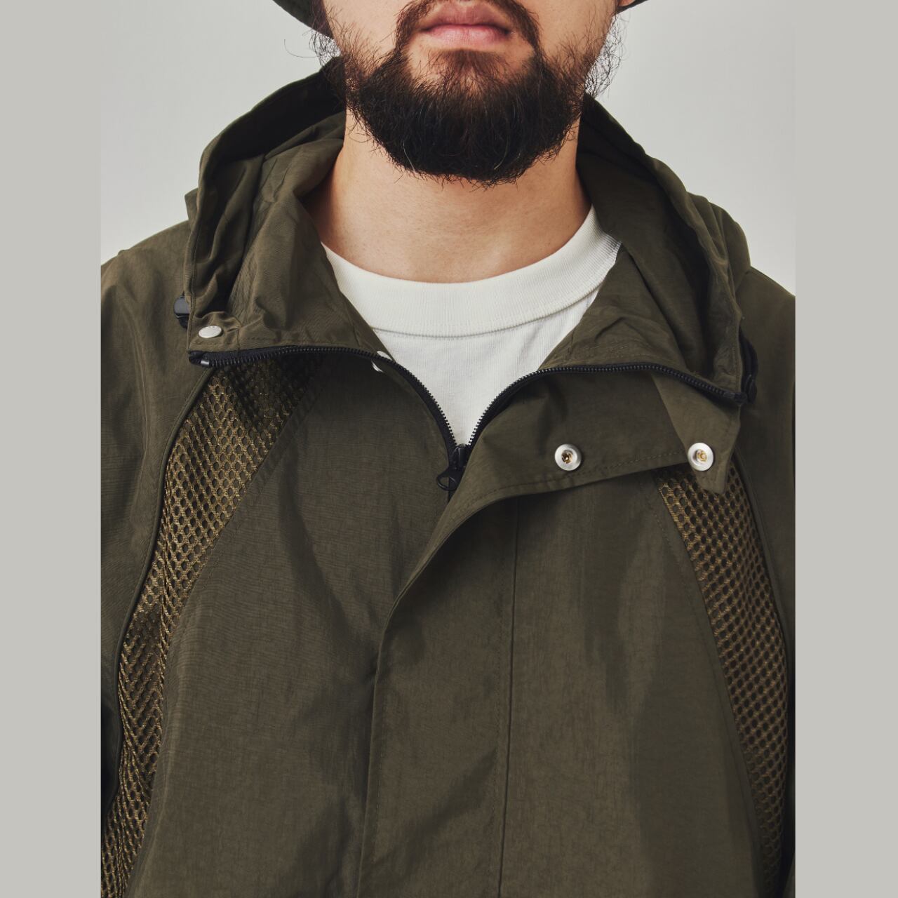 軽量でシャリ感のある生地に、肩〜脇にかけて大胆に配置されたメッシュベンチレーションが特徴のシェルパーカー。