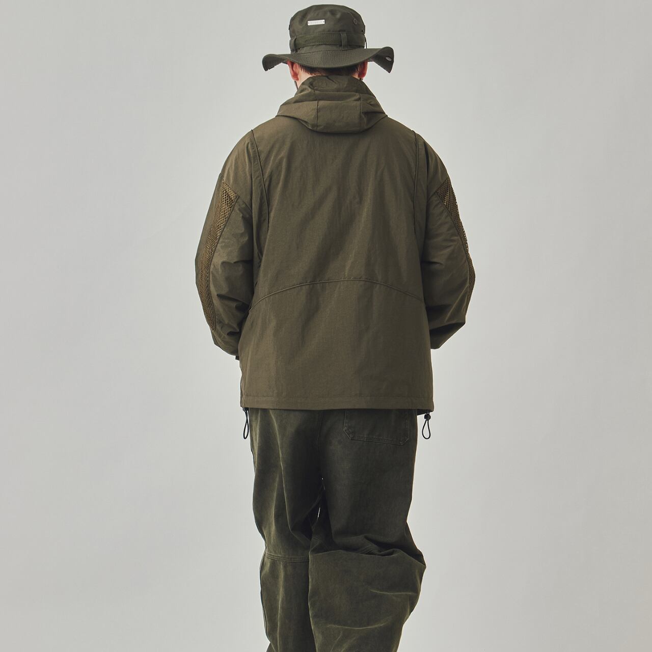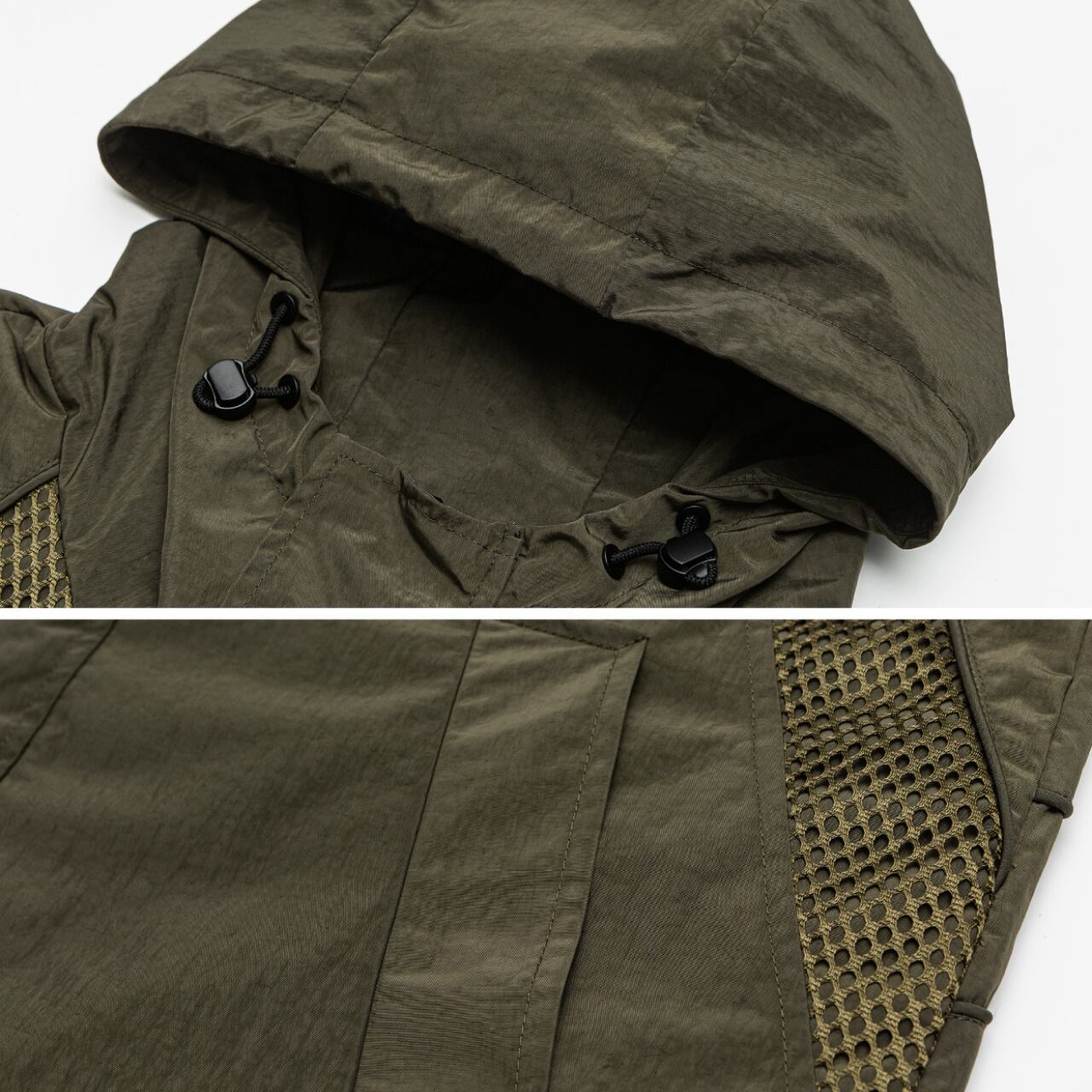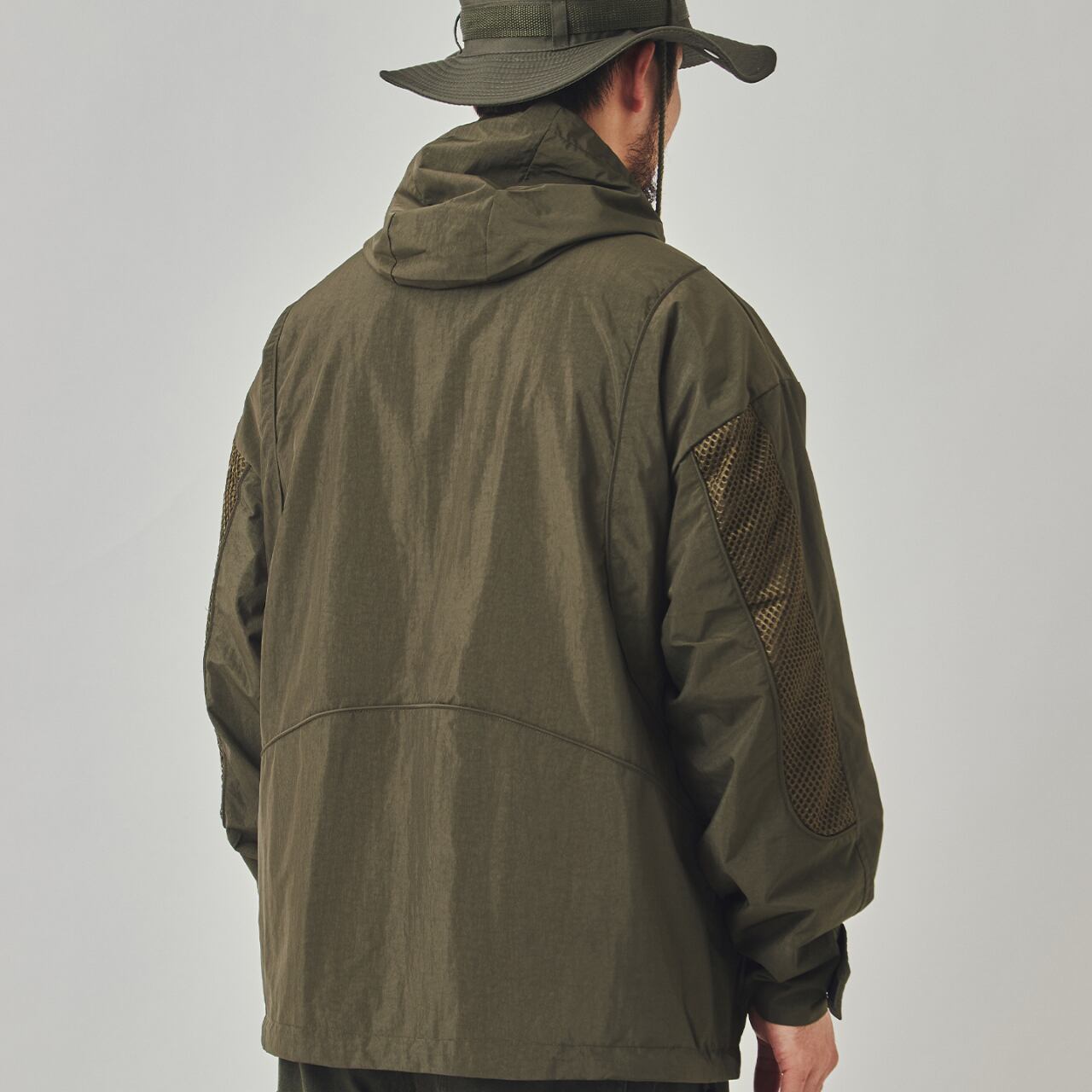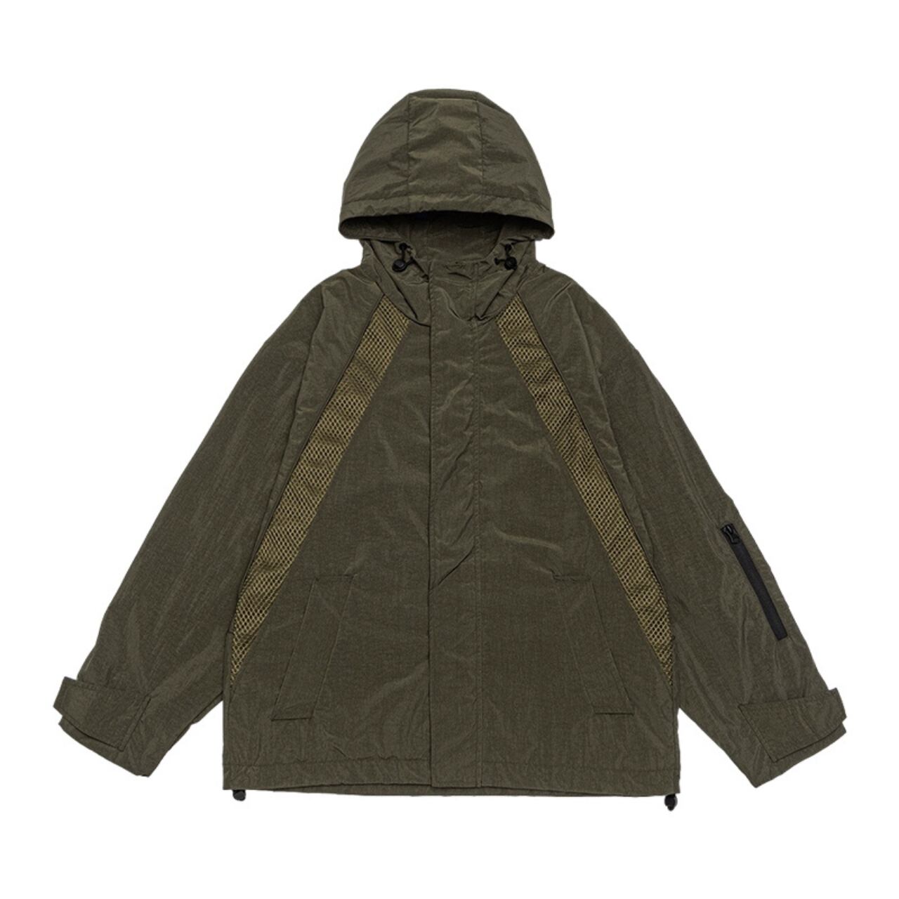 軽量でシャリ感のある生地に、肩〜脇にかけて大胆に配置されたメッシュベンチレーションが特徴のシェルパーカー。