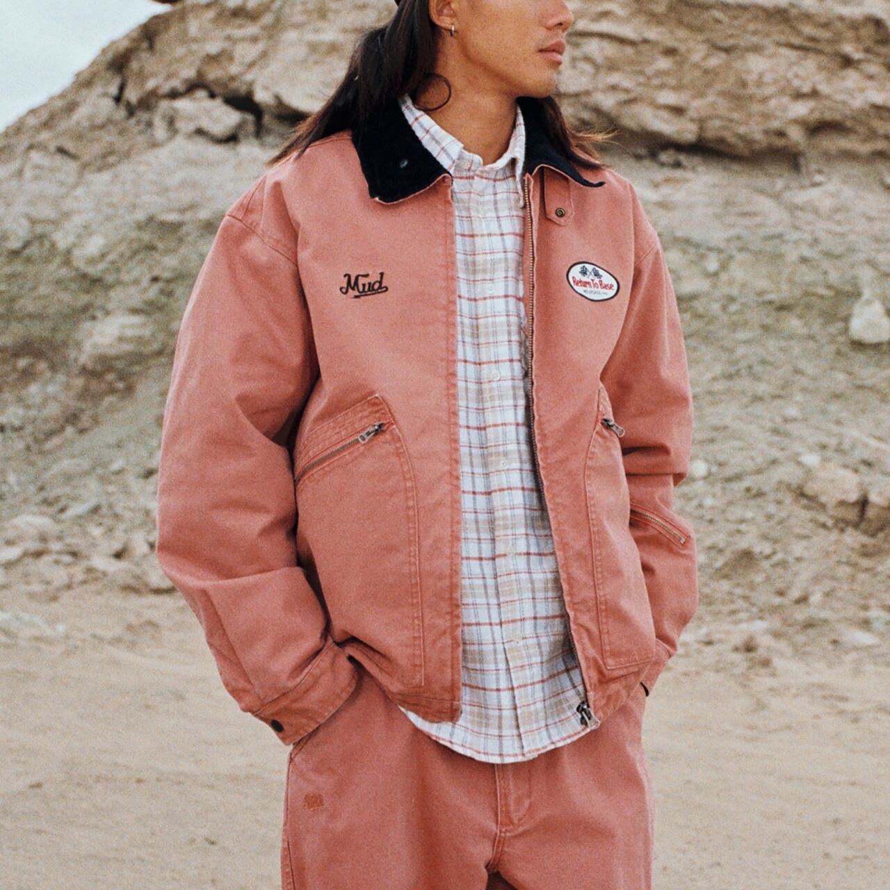 同素材のワイドパンツとのセットアップスタイルは、無骨ながらも洗練された印象に。