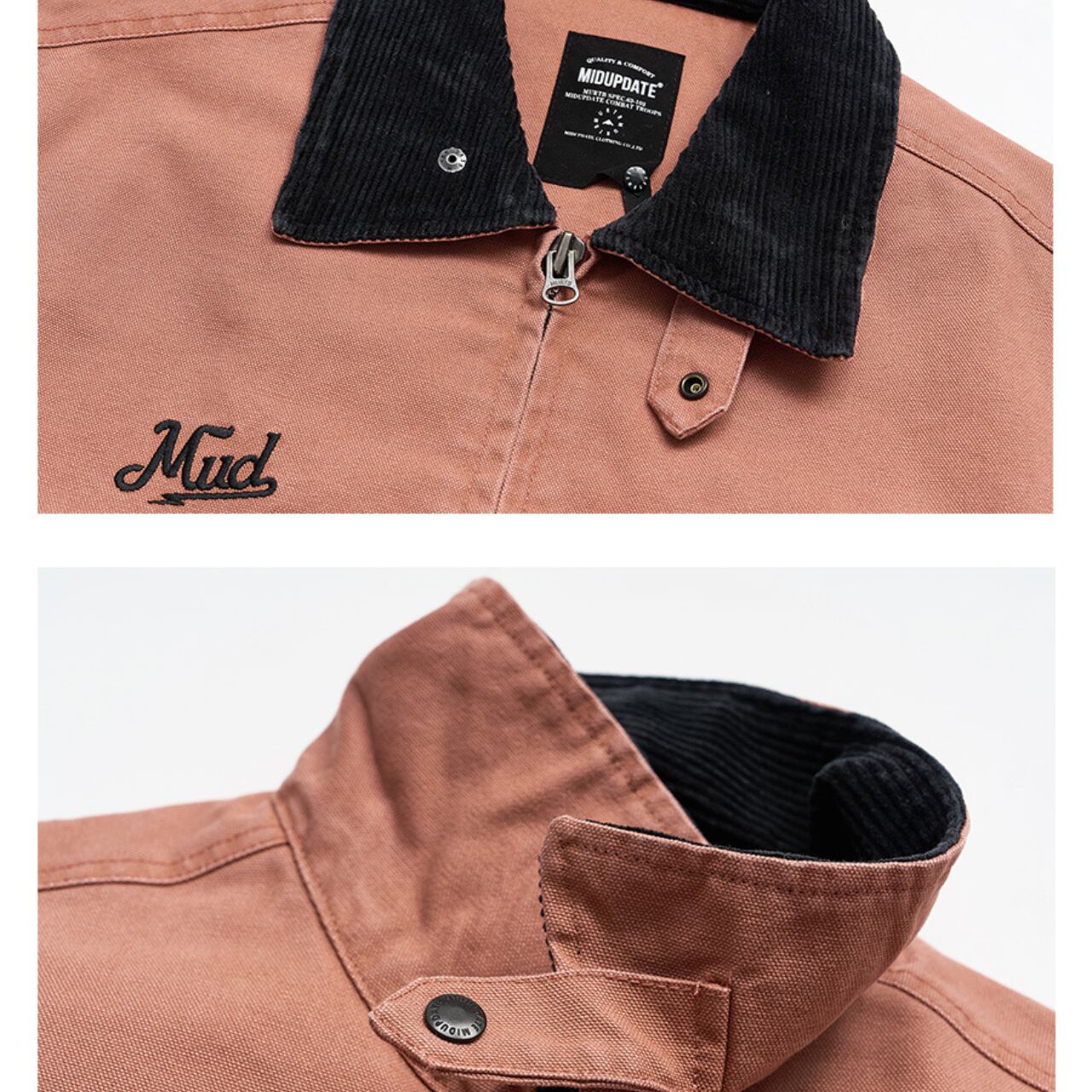 襟はコーデュロイ切替でアクセントをプラス。フロントにはブランドロゴの刺繍とワッペンでアメリカンなムードを演出。後ろ腰部分のボタンでシルエット調整も可能です。