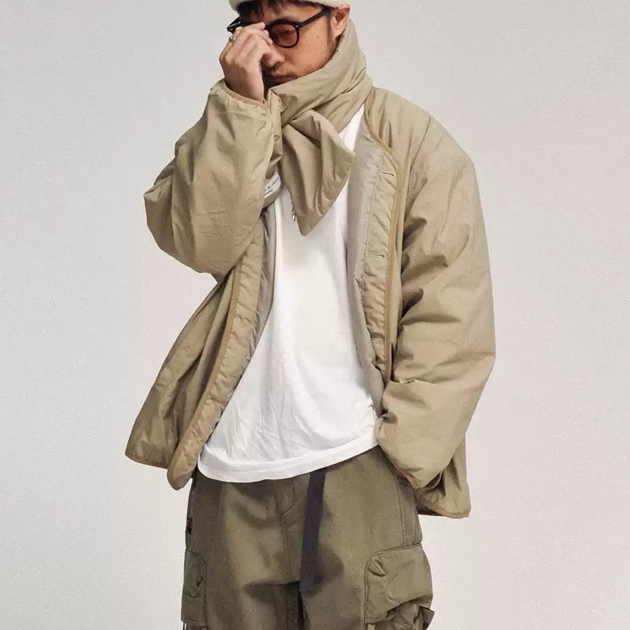 #ノーカラージャケット #ミリタリーテイスト #レイヤードスタイル #春秋アウター #コットンジャケット