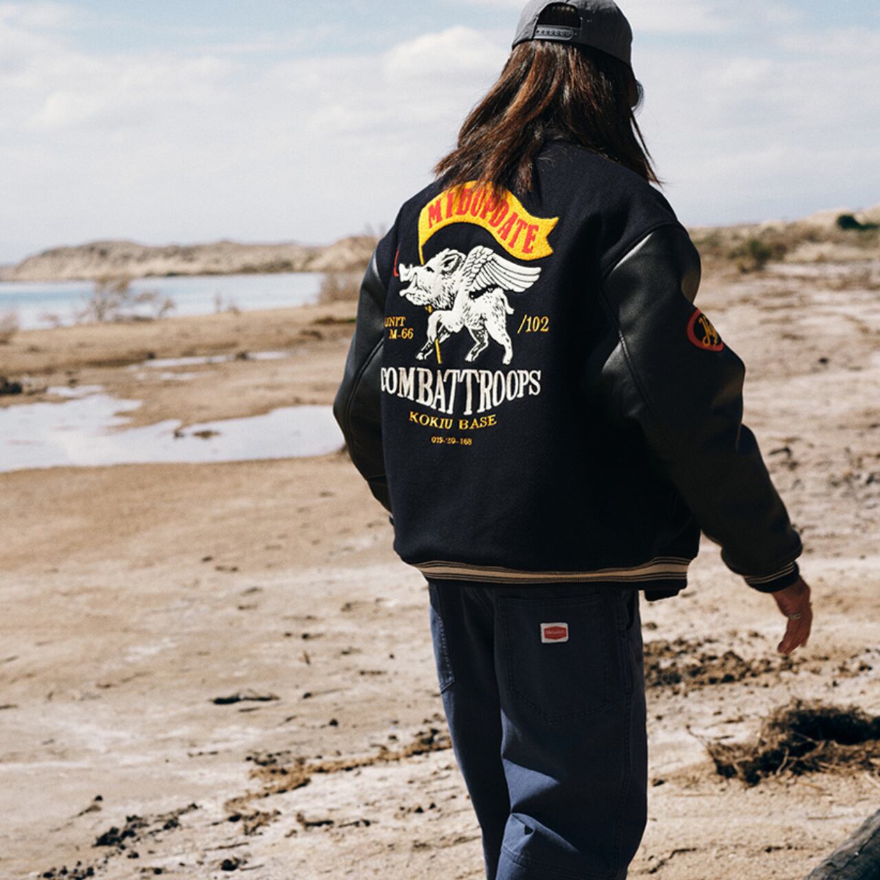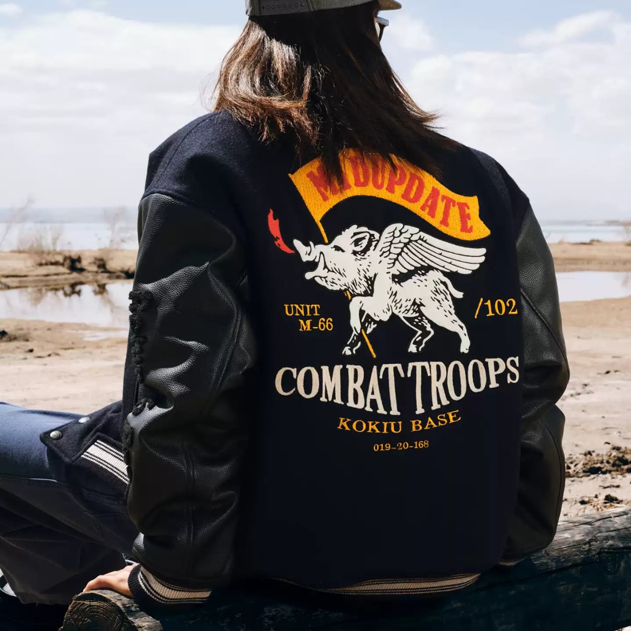 80年代のアメリカンヴィンテージスタイルにインスパイアされたレザースタジャン。胸元や背中のインパクトのあるグラフィック刺繍が特徴的で、古き良き時代のクラシックなエッセンスを現代に落とし込んだ一着です。フロントのブランドロゴとバックの戦闘機、翼を広げた豚のデザインがユニークで、スタイリングにアクセントを加えます。