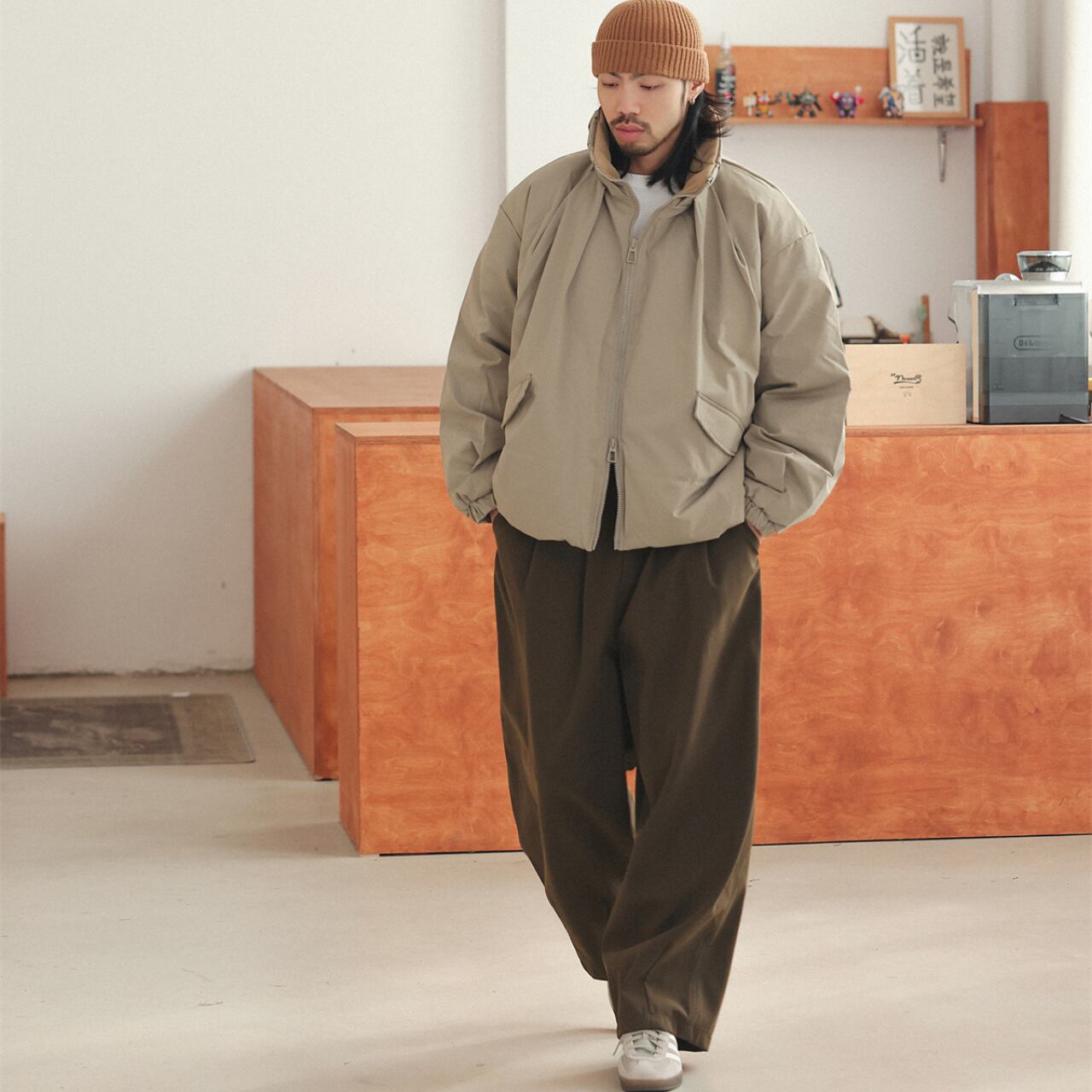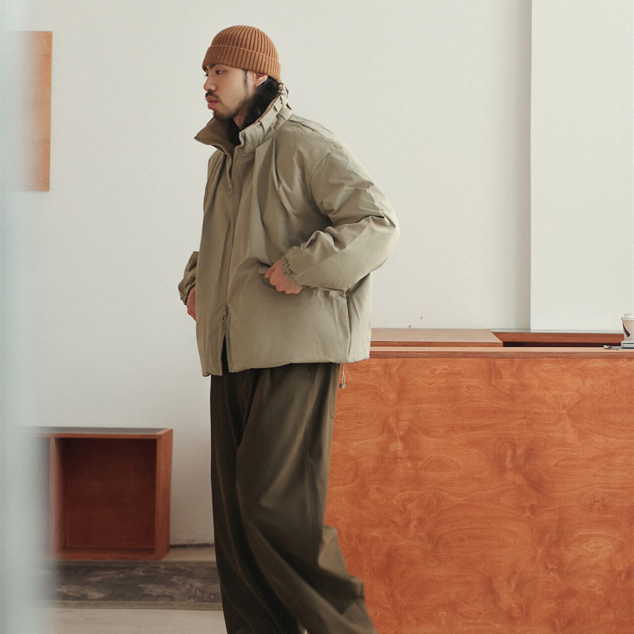 ソリッドな表情に隠された、機能性と快適さ。ゆとりあるボリュームシルエットと、首元まで暖かいモックネック仕様が特徴のパデッドブルゾン。裾にはドローコード付きでシルエットの調整も自在。裏地は肌触りの良いスエード調で保温性も抜群。大きめの立体ポケットがアクセントになりつつ、実用性も確保。ミニマルなデザインながら、冬の主役アウターとして申し分ない存在感を放ちます。ワイドパンツとの相性も抜群で、都会的なスタイルが完成します。
