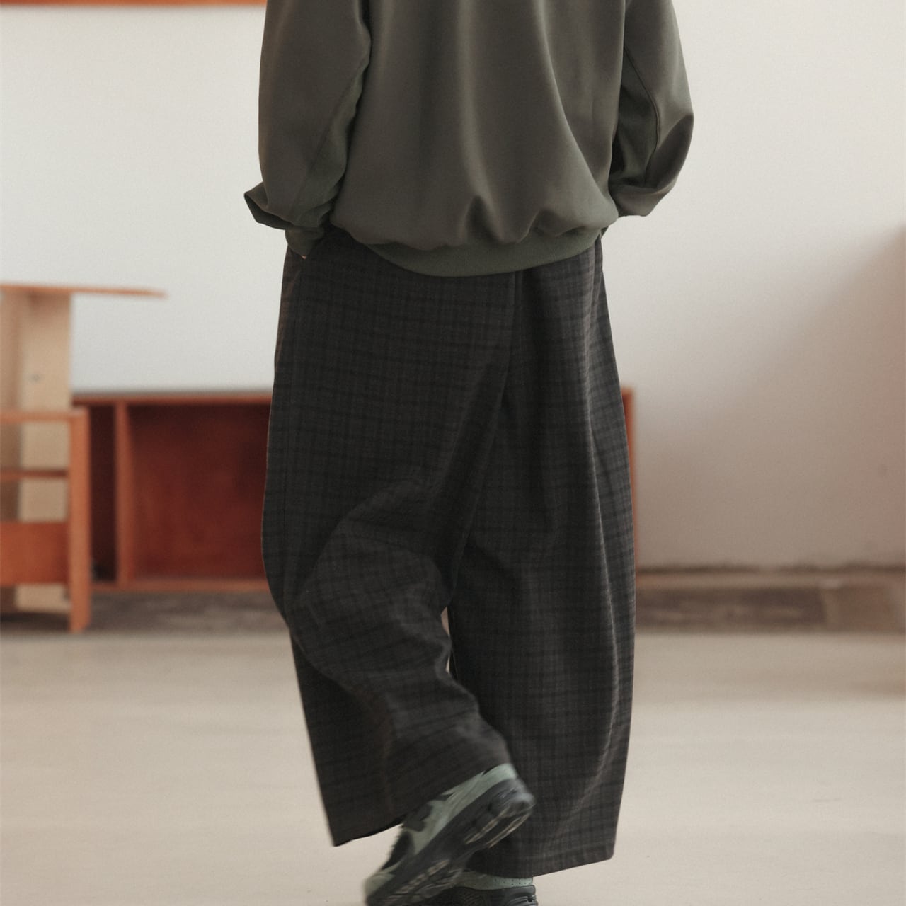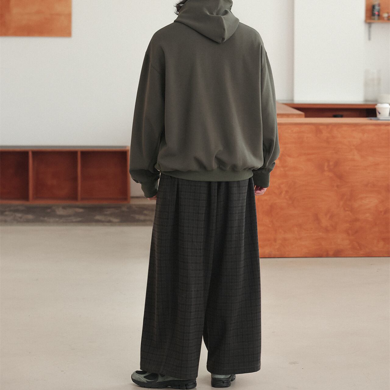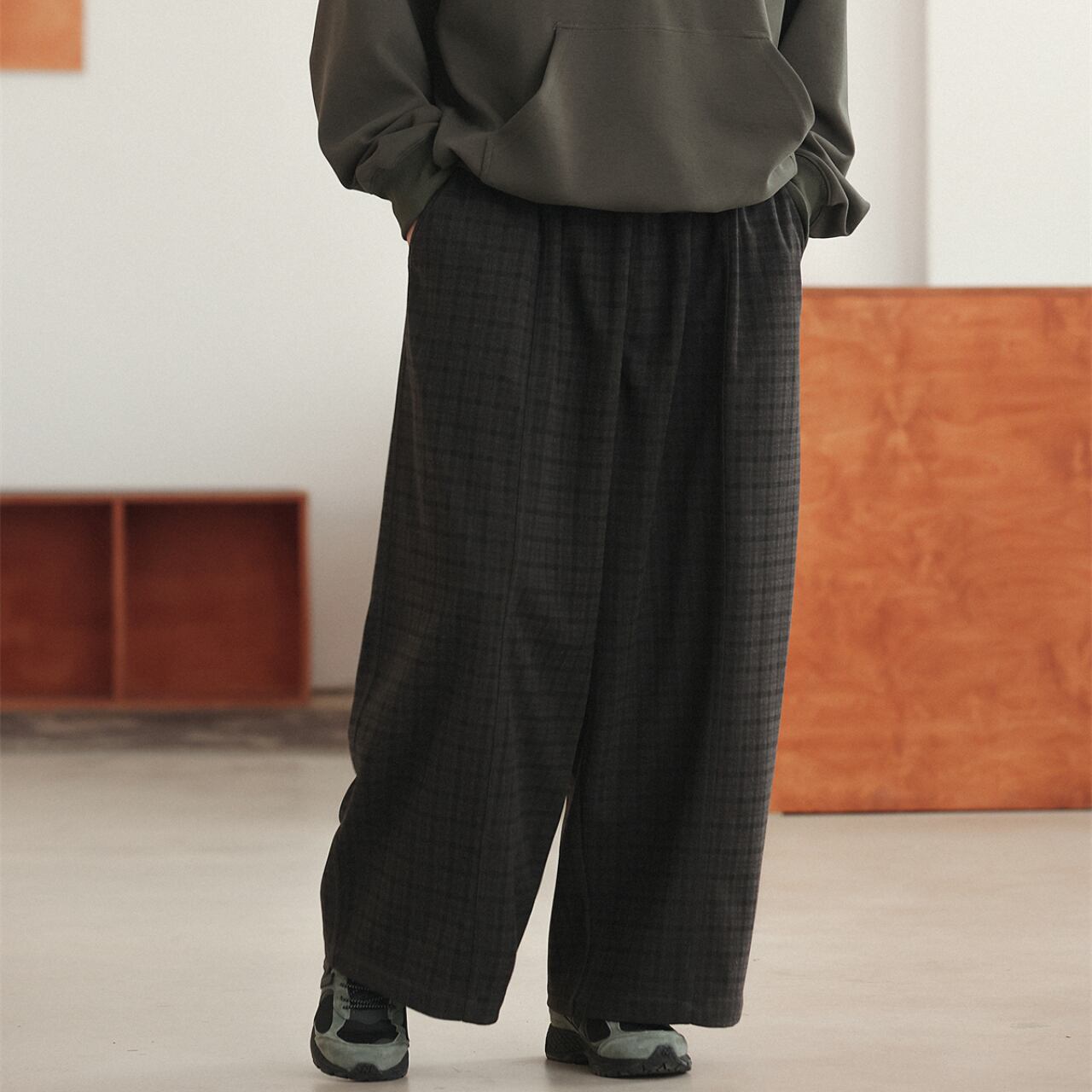 秋冬スタイルを格上げする、繊細なチェックパターンが魅力のワイドパンツ。柔らかく、軽やかなフリースタッチの生地で仕立てられており、肌当たりも心地よく暖かさも十分。リラックスしたシルエットとウエストゴム仕様で、着用時のストレスもゼロ。ドローコードも内蔵しており、フィット感の調整も自由自在。トップスはスウェットやフーディと合わせて、ストリートからカジュアルまで幅広く対応可能。ダークトーンに微かに浮かぶチェック柄が、控えめながら個性を演出してくれます。