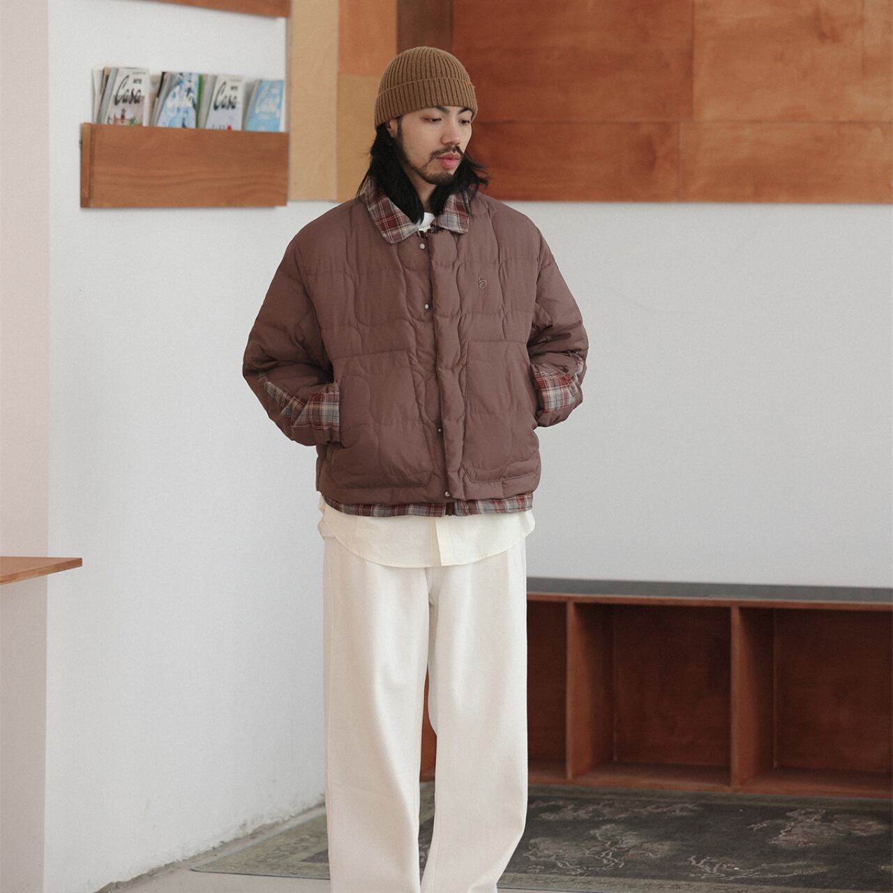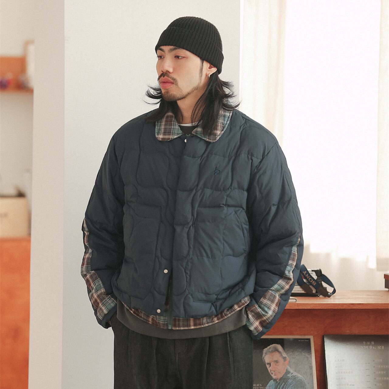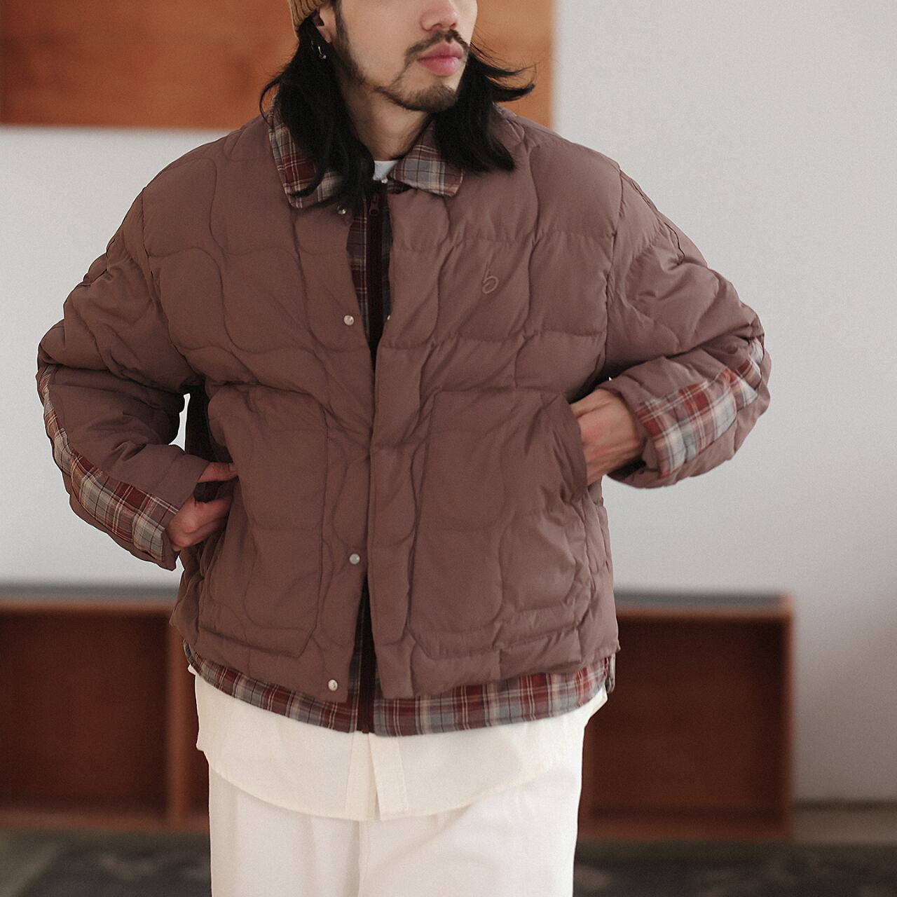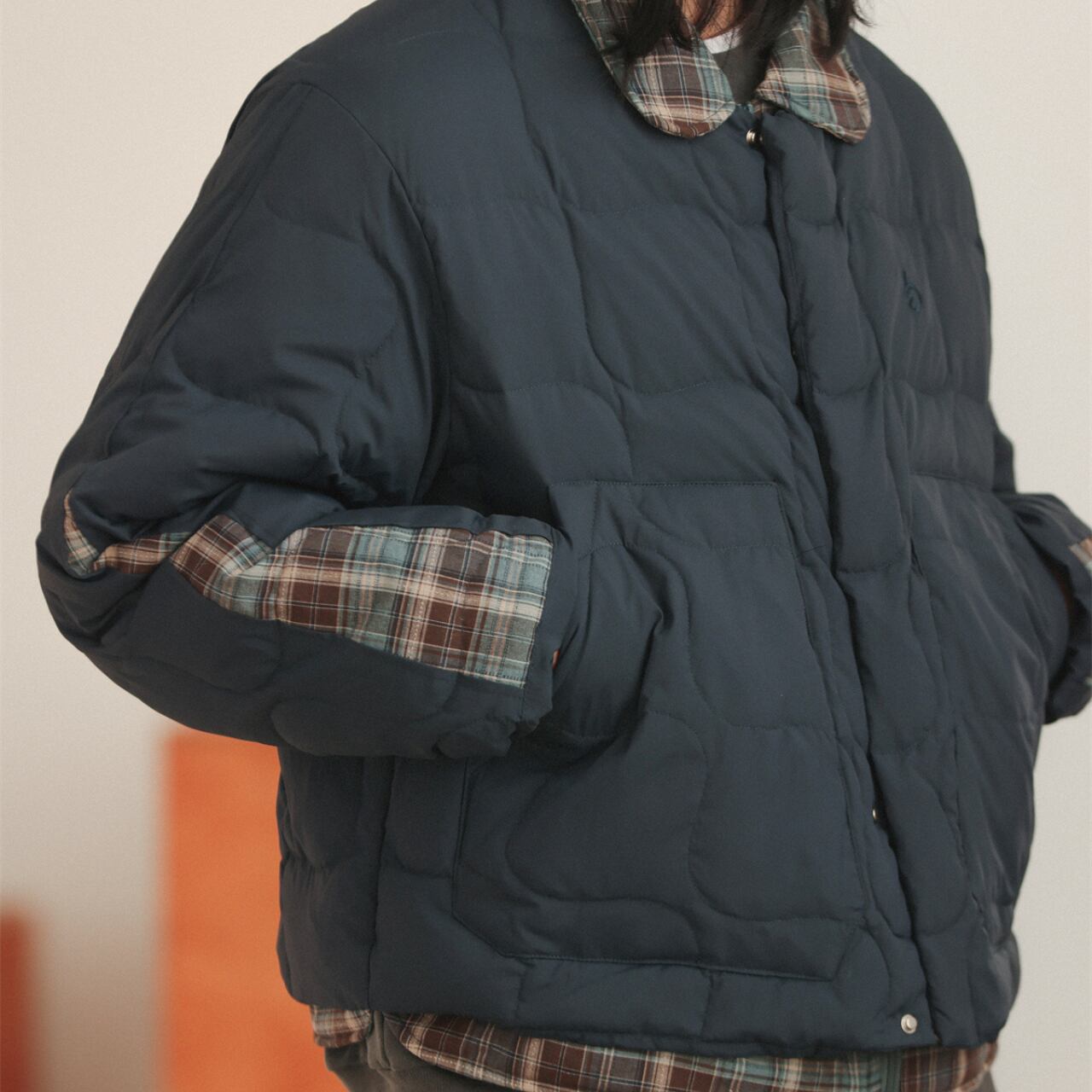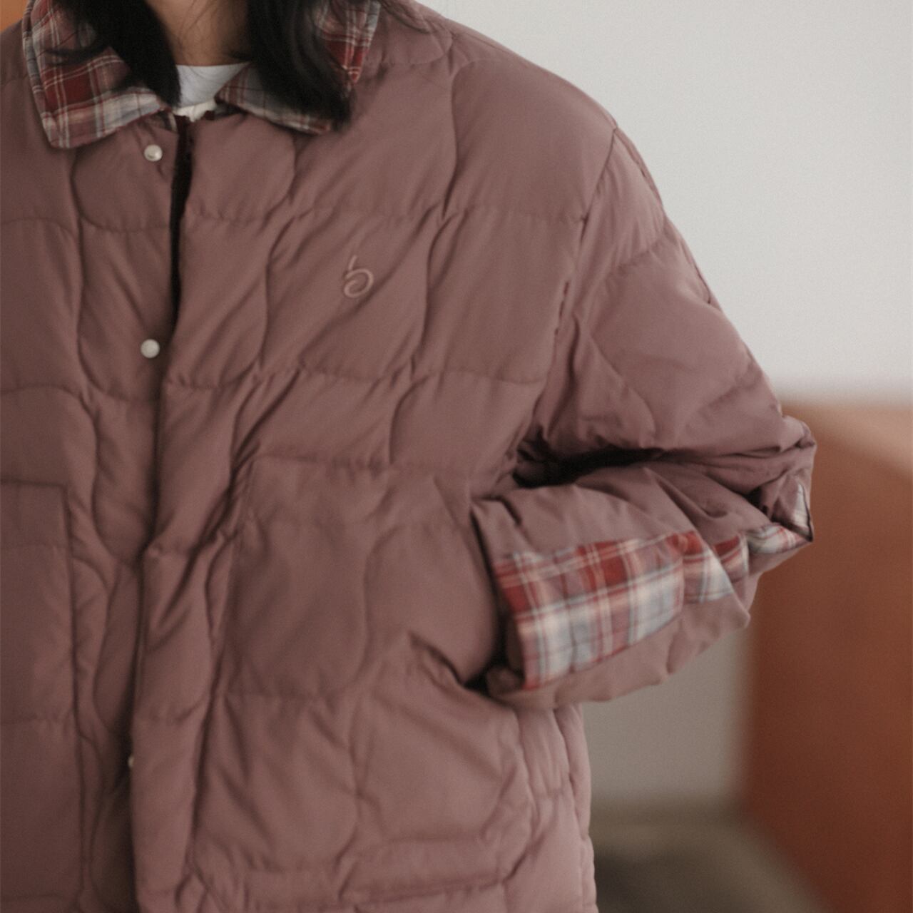 落ち着いたヴィンテージ感と、現代的なバランスが魅力のキルティングジャケット。裏地のチェック柄が袖口や襟元からさりげなく覗き、レイヤード感を演出。どこか懐かしさを感じさせる丸みのあるステッチパターンが、優しい表情に仕上げてくれます。リラックスしたシルエットでインナーに厚手のスウェットやニットも楽に着込めて、秋冬にぴったりな一着。カラーは柔らかく、どの色もスタイリングに自然に馴染みます。