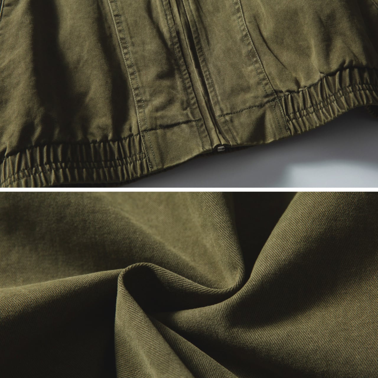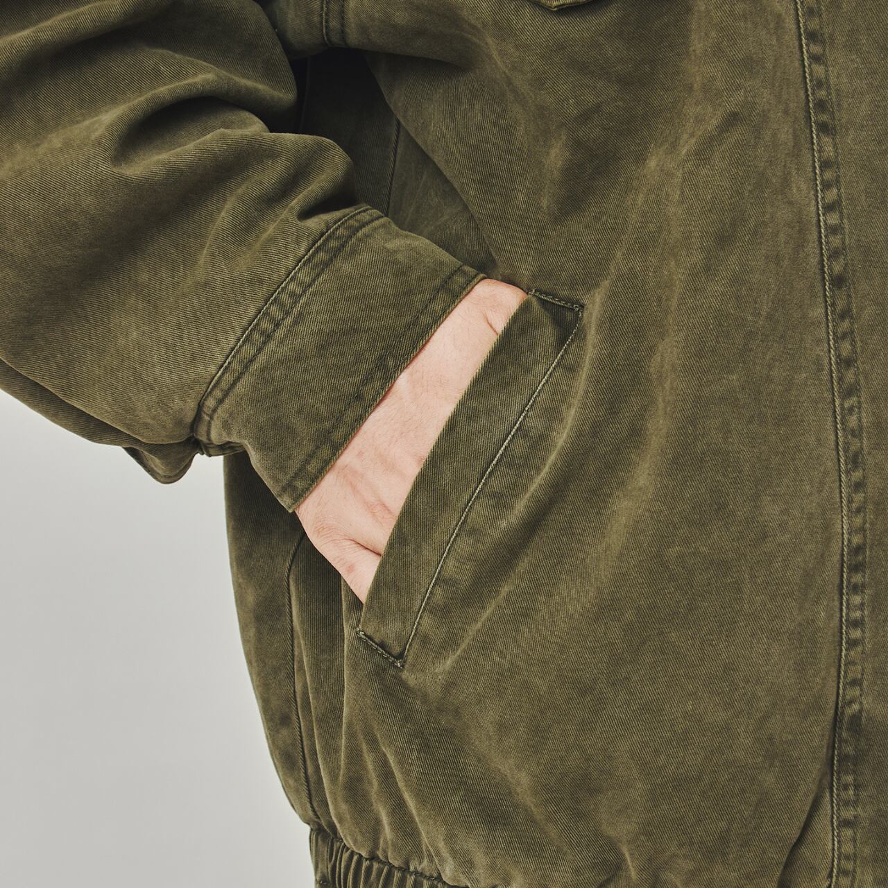 ミリタリー由来のディテールに、タウンユースにも馴染む現代的なバランスを落とし込んだスタンドカラーブルゾン。程よくフェード感のあるピグメントダイ加工が魅力で、シンプルながら存在感のある仕上がりに。肩の落ちたリラックスシルエットと、裾や袖のシャーリング仕様により、丸みのある立体感が自然と生まれます。