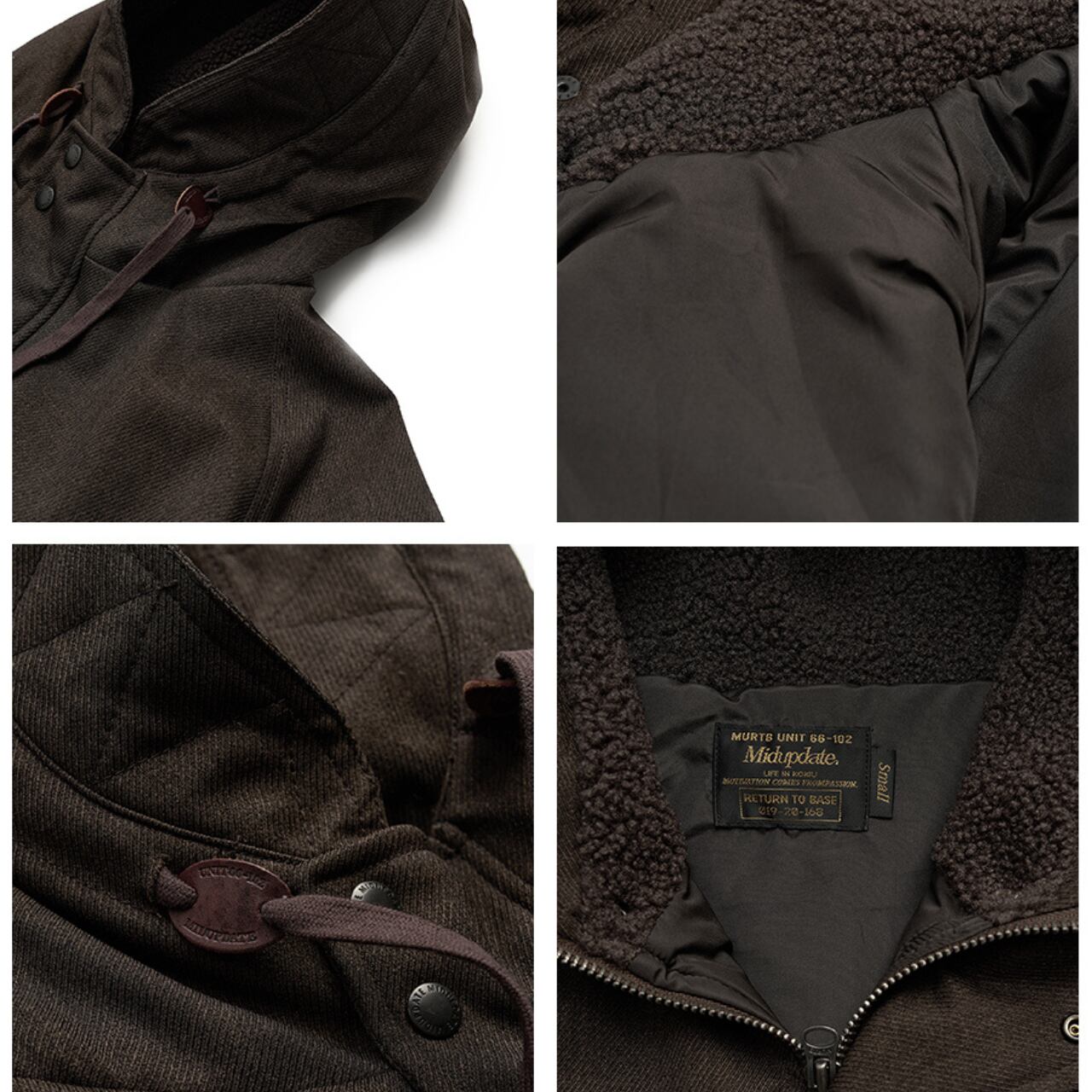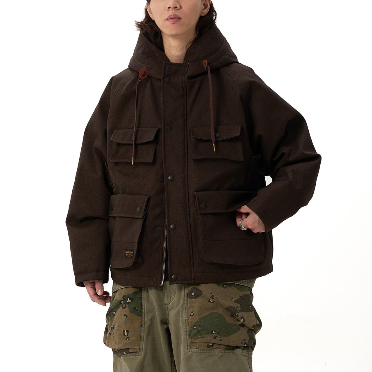 大容量の立体フラップポケットがアクセントとなり、機能美とミリタリーテイストを両立。フード一体型デザインで、アウトドアユースからタウンユースまで幅広く対応。ワイドなシルエットが、インナーに厚手のスウェットやニットを仕込んだレイヤードにもぴったり。カラーは深みのあるブラウンで、大人の余裕を感じさせる仕上がりです。