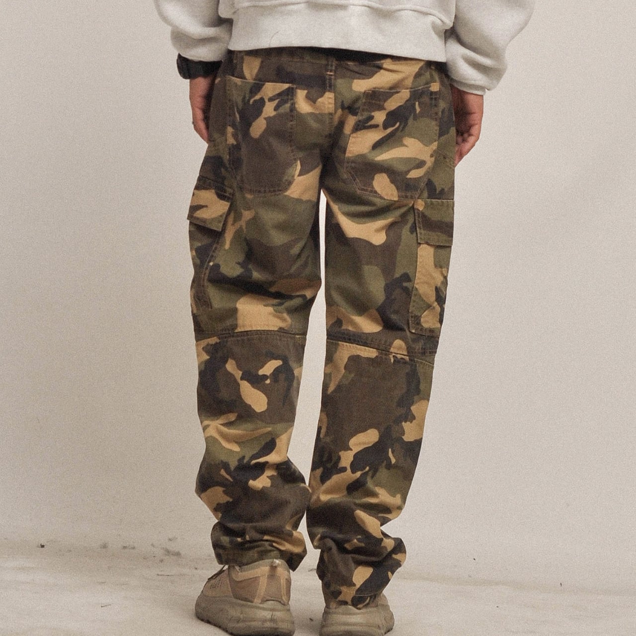 大胆なカモフラ柄が目を引く、ミリタリーテイストのカーゴパンツ。程よくルーズなシルエットと、膝部分の切り替えデザインが個性を演出。タフなコットン100%素材で、アウトドアからストリートまで幅広く活躍。スウェットやジャケットと合わせれば、抜け感のあるシティボーイスタイルが完成します。