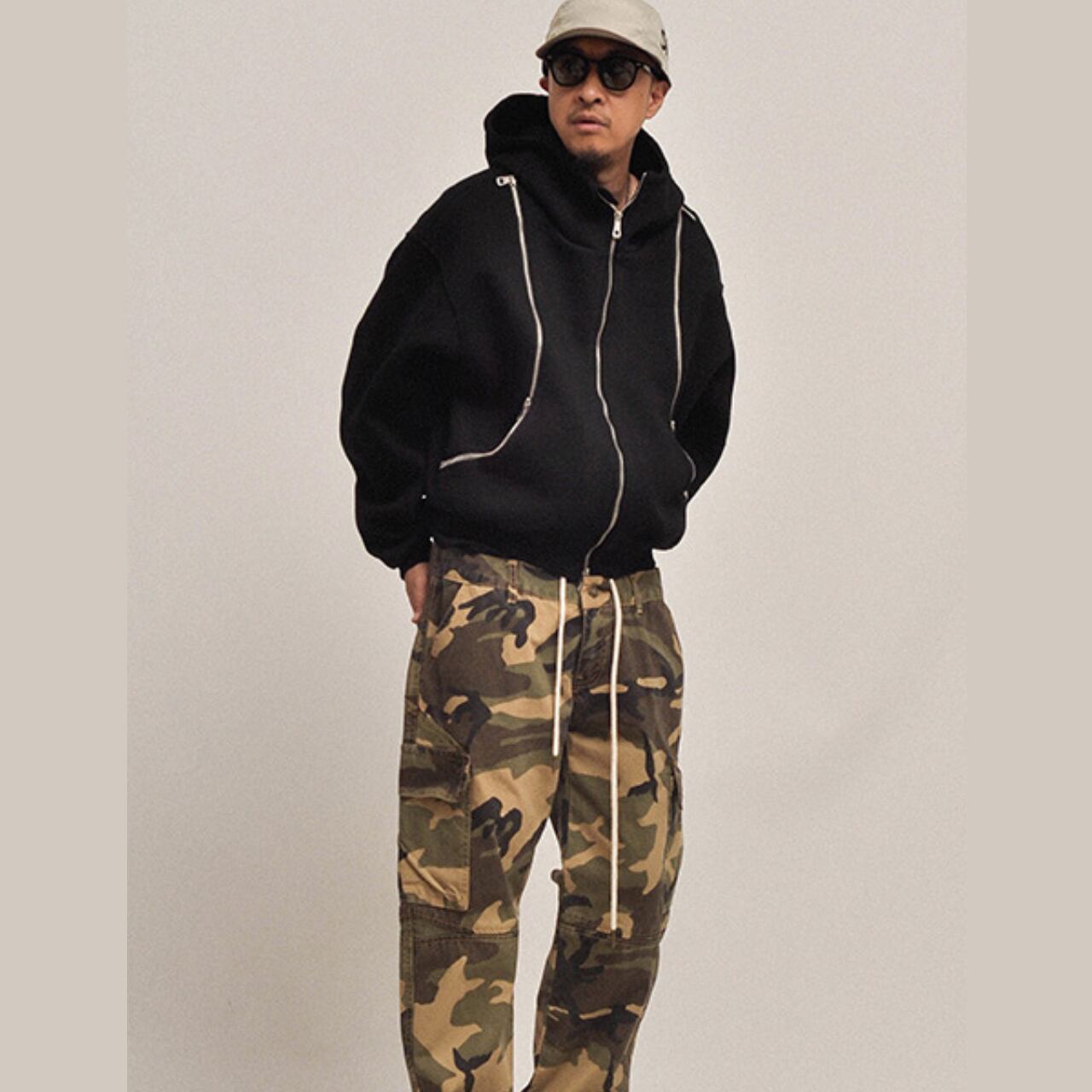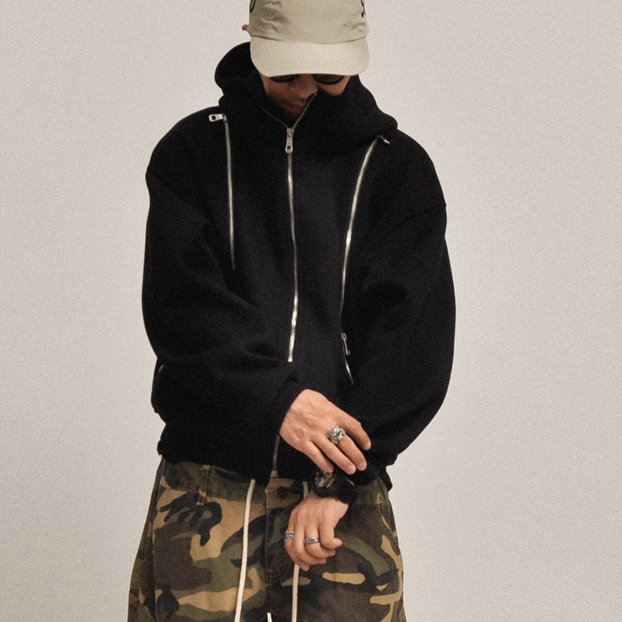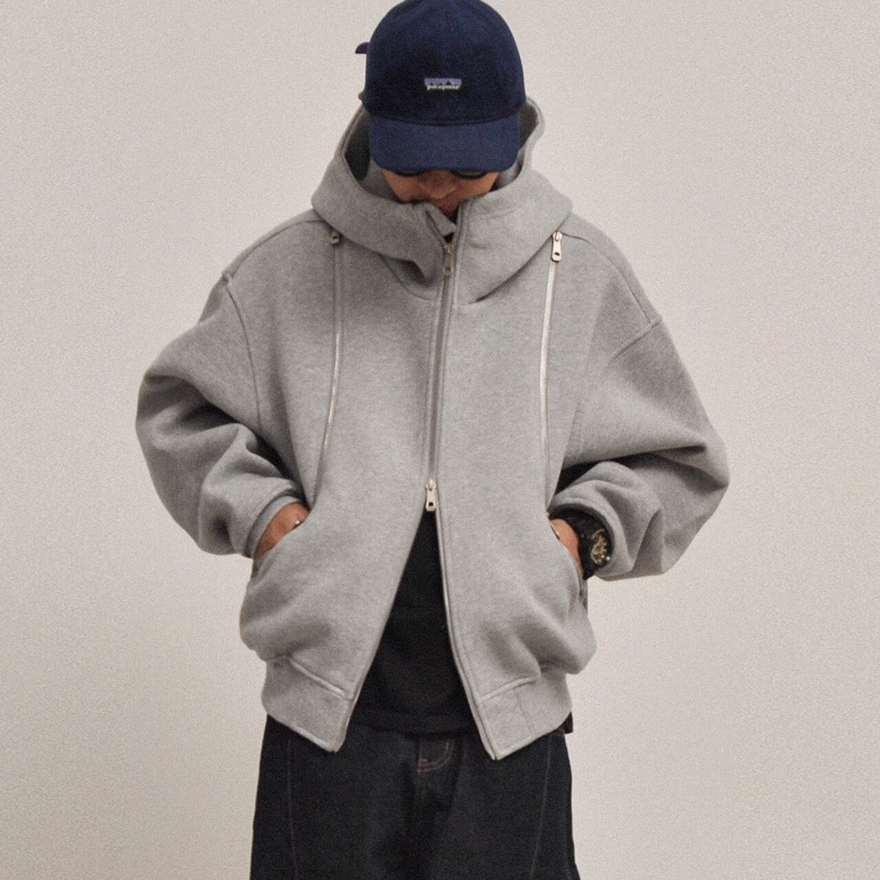 大胆な立体シルエットとフロントのダブルジップが特徴。短丈でワイドな身幅がスタイルアップを叶えつつ、インナーとのレイヤードも楽しめる設計。やや肉厚の裏毛スウェット素材で、秋冬の主役アウターとしても活躍します。フードは立ち上がりのあるデザインで、横顔まで洒脱に。ストリートにもシティにもハマる万能アイテムです。