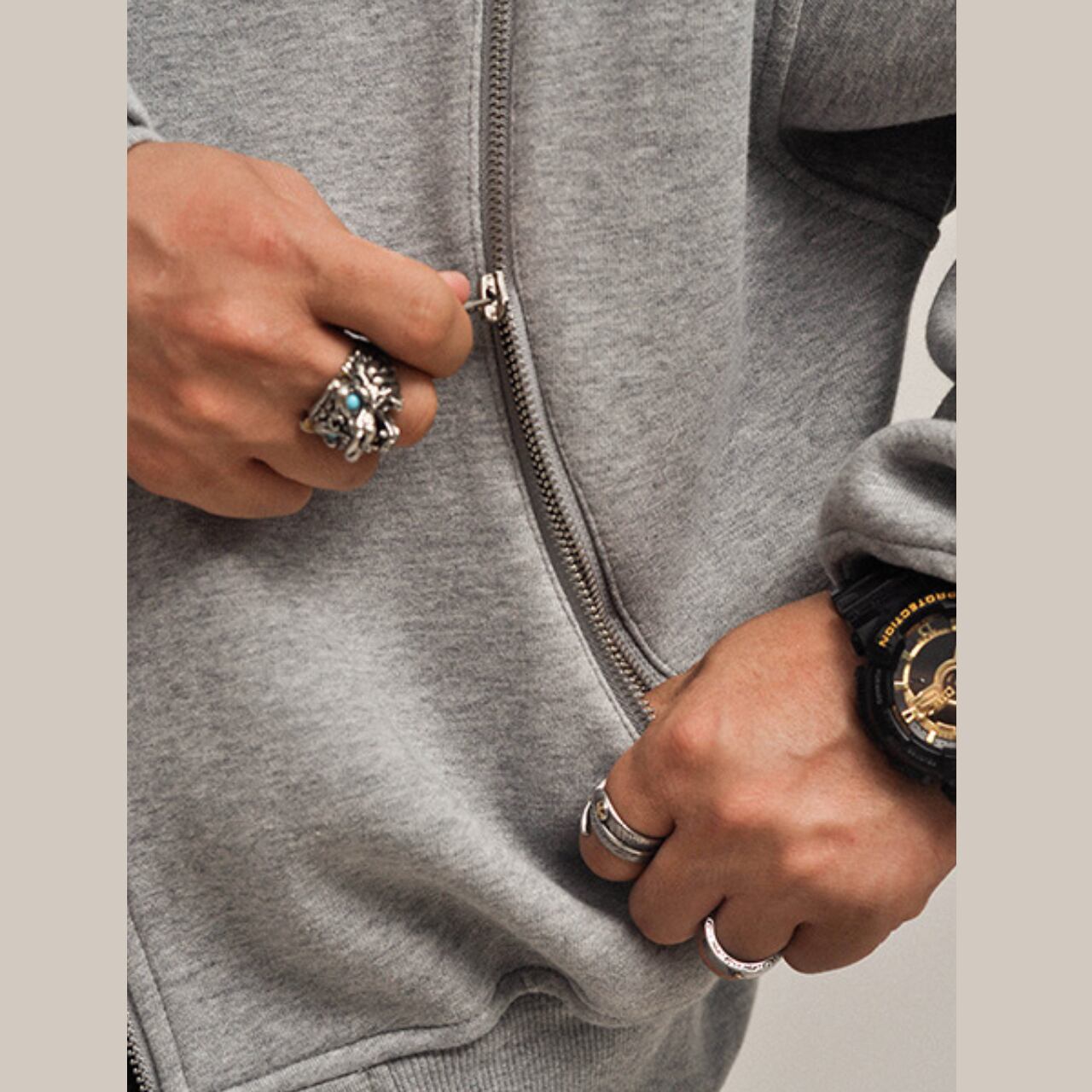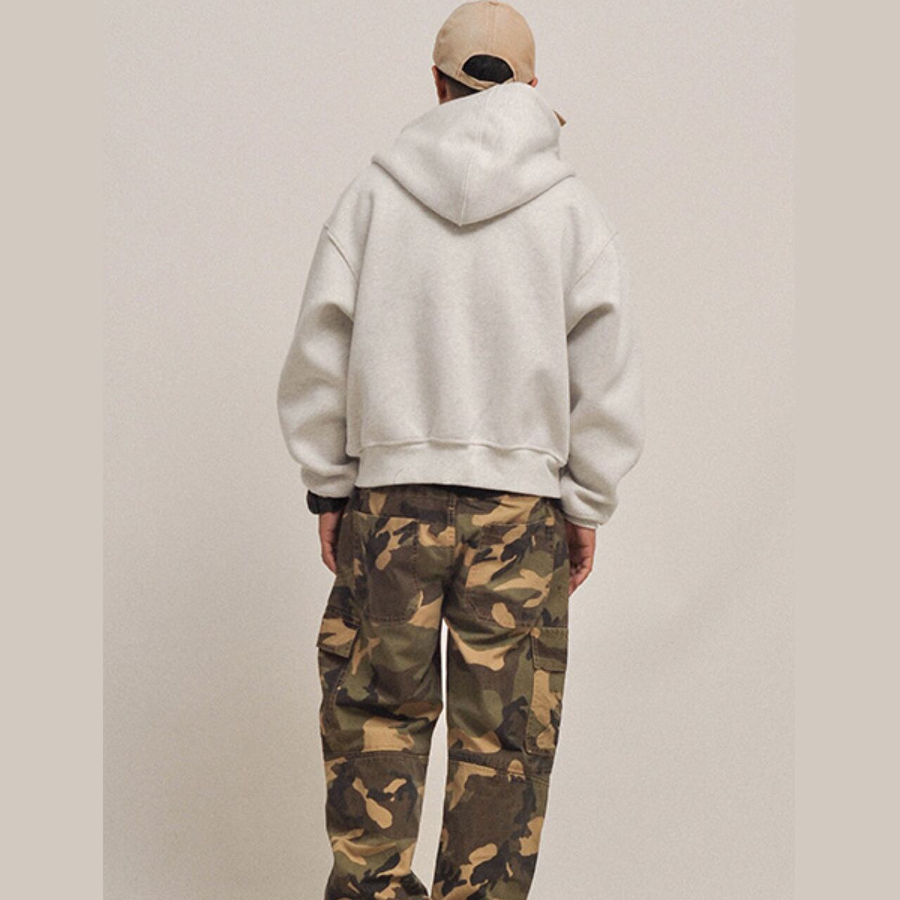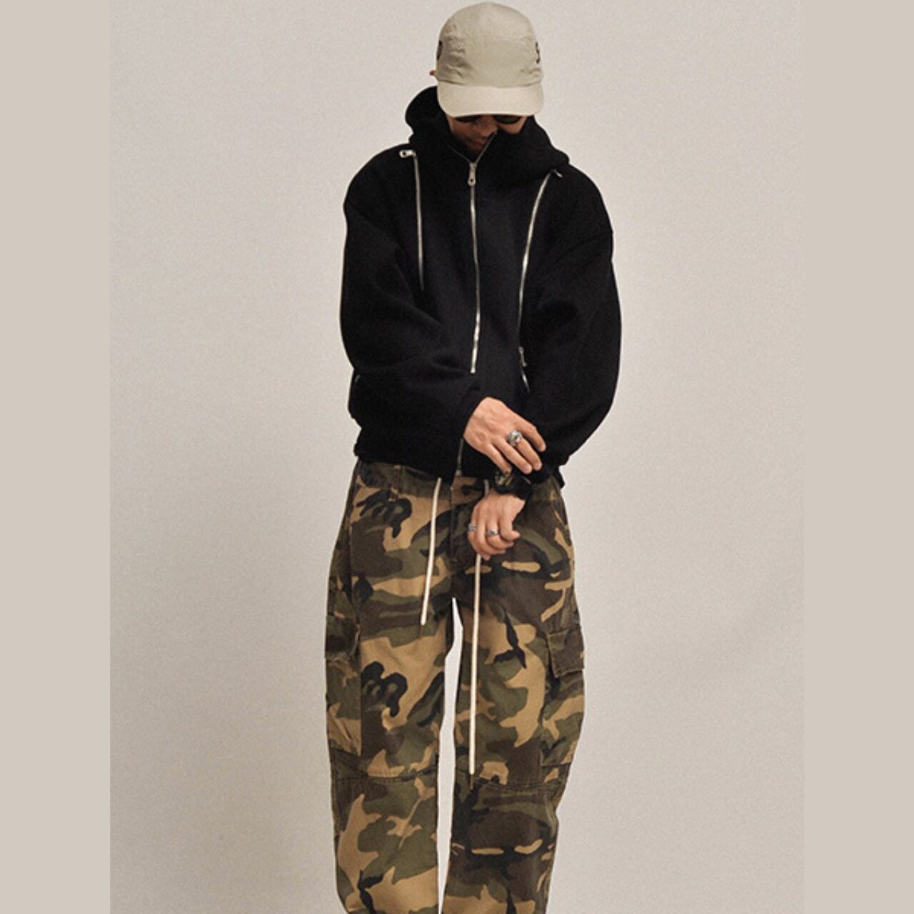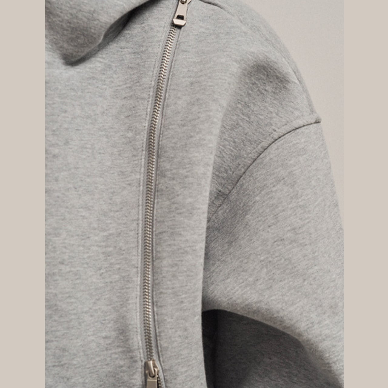大胆な立体シルエットとフロントのダブルジップが特徴。短丈でワイドな身幅がスタイルアップを叶えつつ、インナーとのレイヤードも楽しめる設計。やや肉厚の裏毛スウェット素材で、秋冬の主役アウターとしても活躍します。フードは立ち上がりのあるデザインで、横顔まで洒脱に。ストリートにもシティにもハマる万能アイテムです。