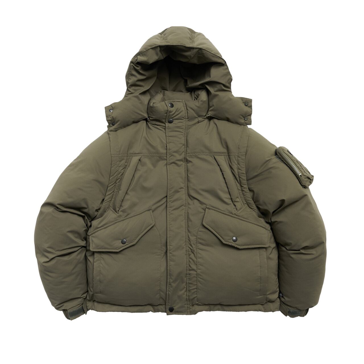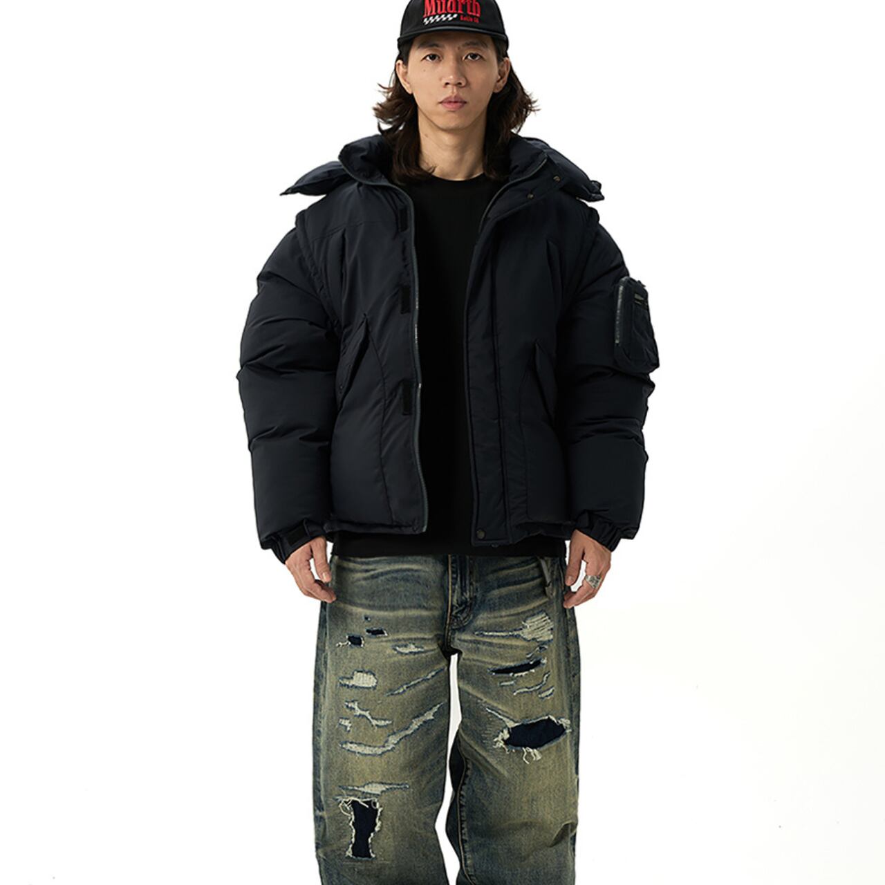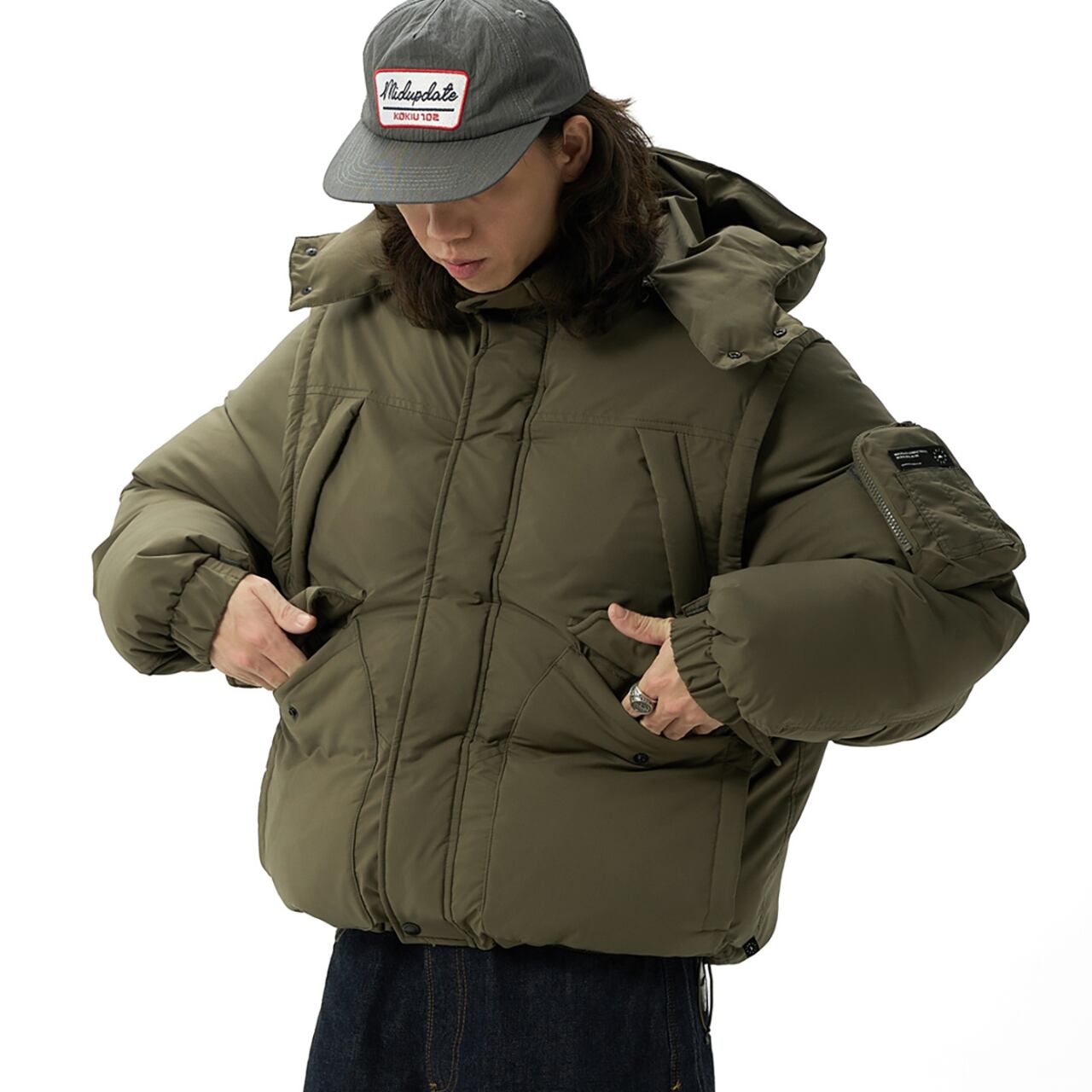 フード、袖、ポーチすべて取り外し可能な多機能ダウンジャケット。モジュラー設計で、ベストとしても、インナーダウンとしても着用できる3WAY仕様。袖には戦術的デザインのジップポケット付きで、見た目もギアライク。中綿には高密度ダウンを採用し、真冬でも対応可能な高い保温性を確保。ベーシックながらも現代的なワイドシルエットが、シティからアウトドアまでシームレスに馴染みます。