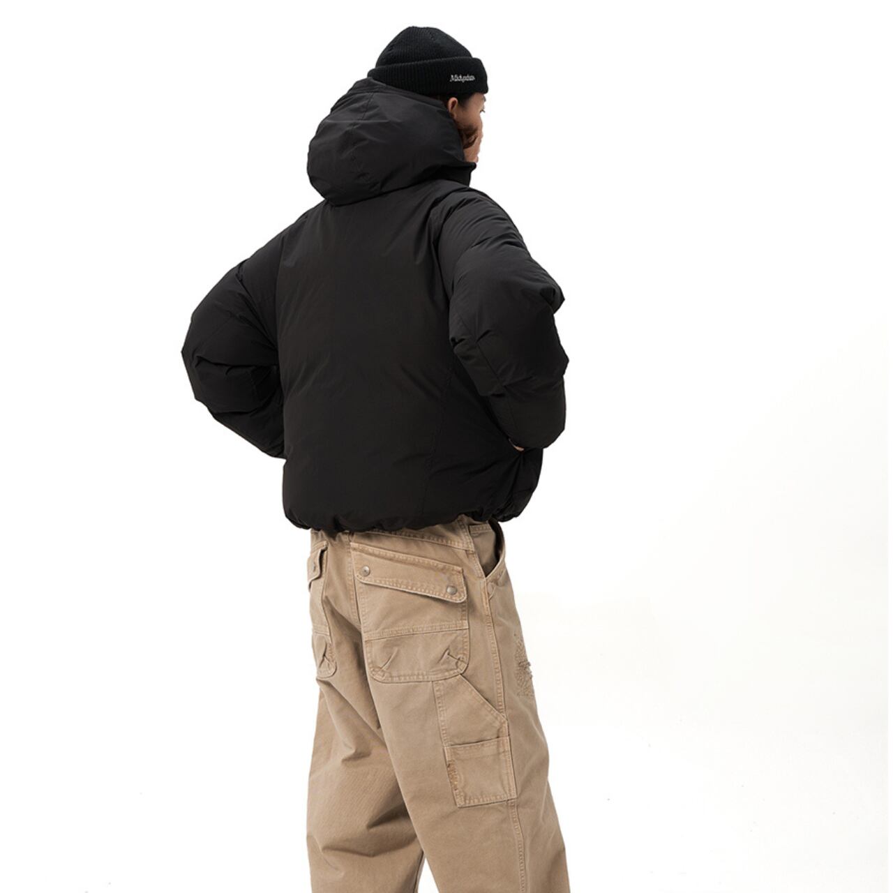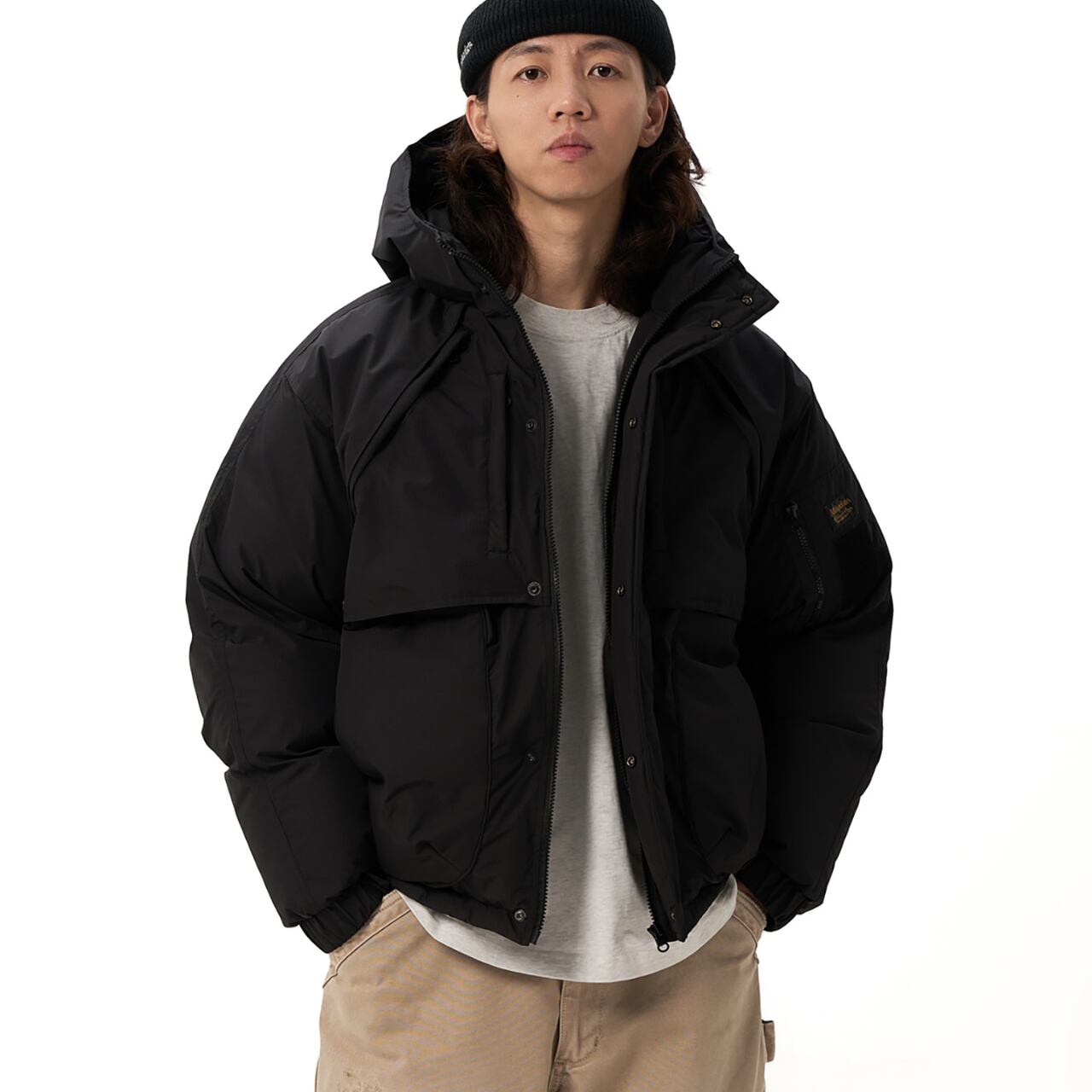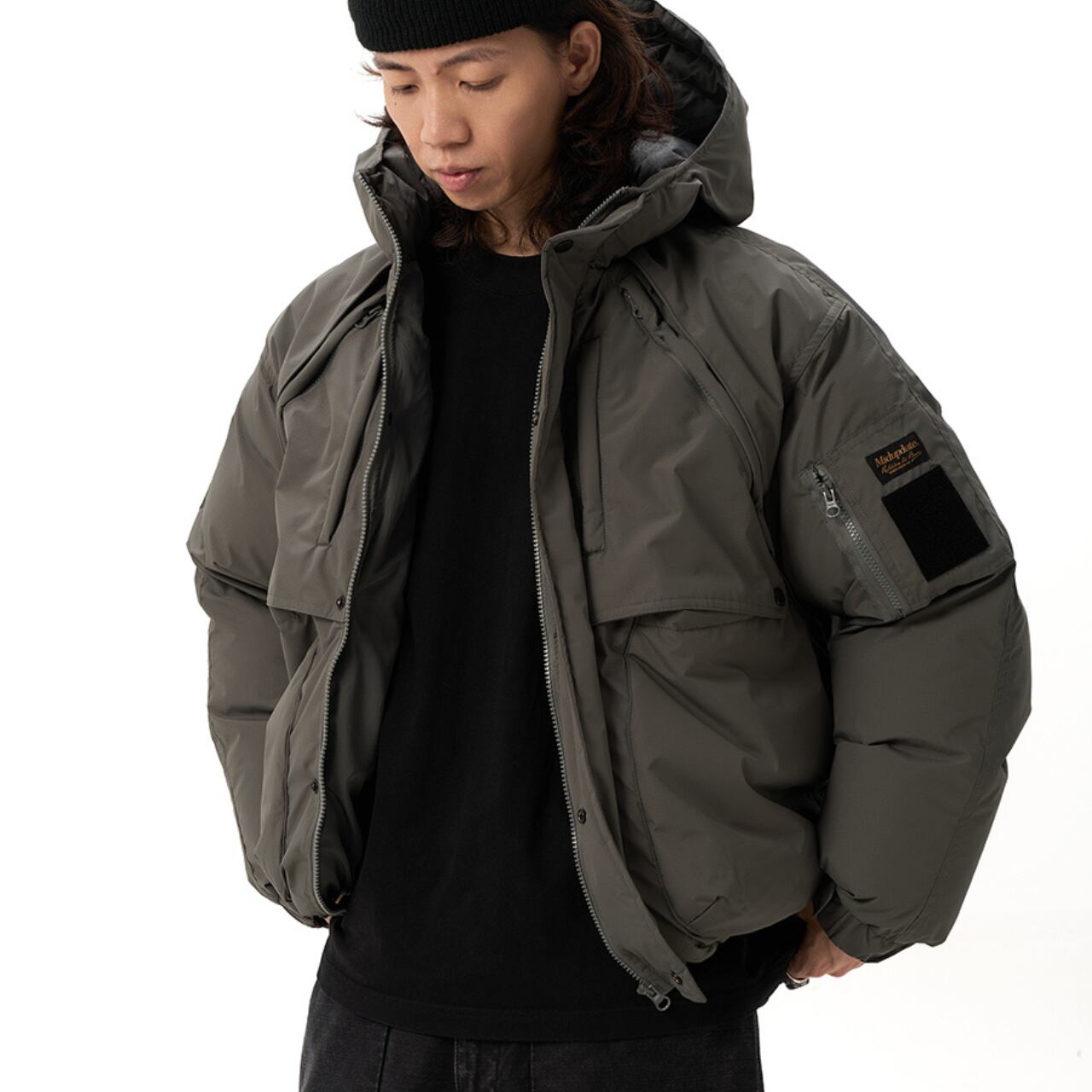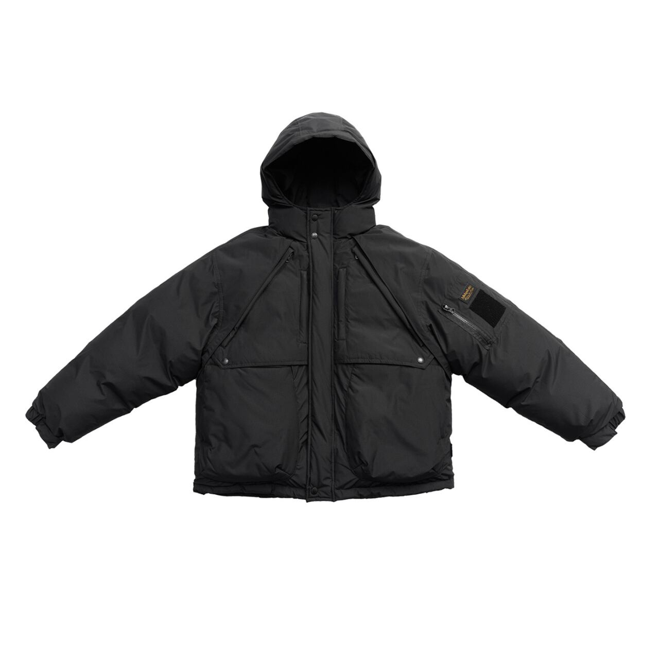 タフな印象を放つ高密度ポリエステル生地に、ダウンコットンをたっぷりと封入。極寒対応の高い保温性を備えつつ、斜めに配置されたジップポケットやフラップポケットが機能美を演出。フード一体型のショート丈ボックスシルエットは、防風性も高く、アウトドアユースだけでなく、都市生活にもマッチ。左腕にはベルクロ付きワッペンがあしらわれ、ミリタリーテイストをプラス。どんなアイテムとも合わせやすいのも魅力。