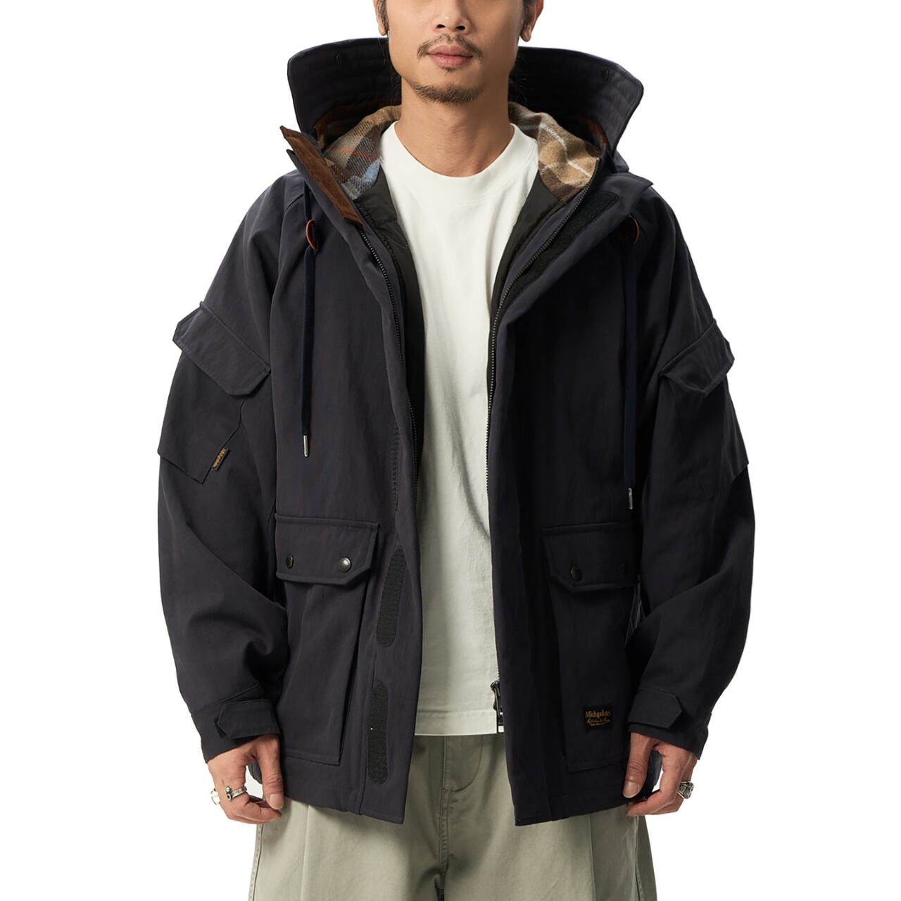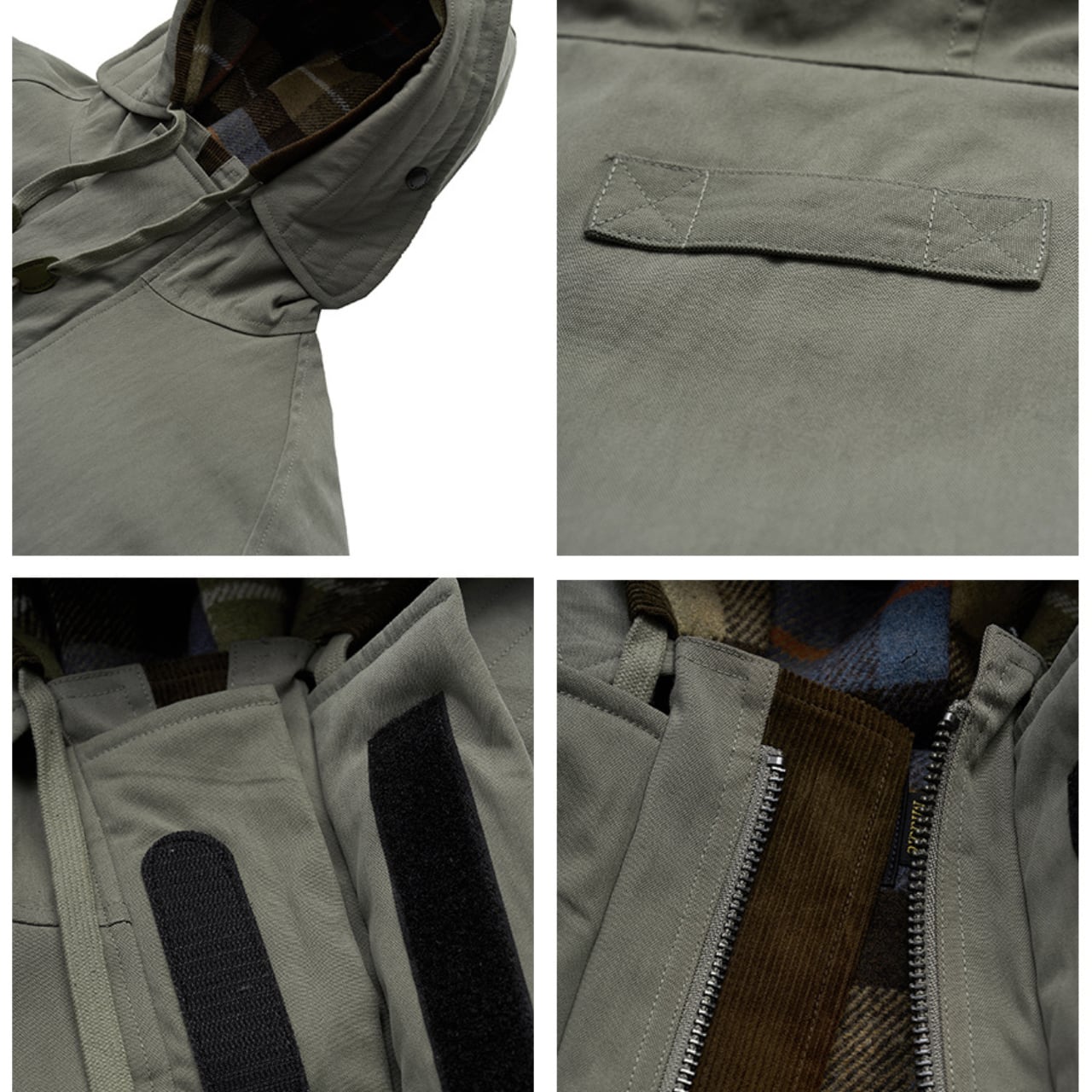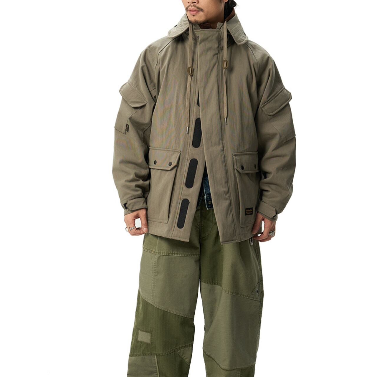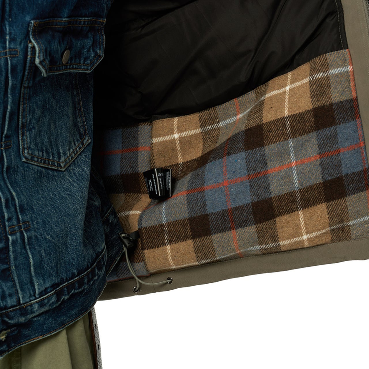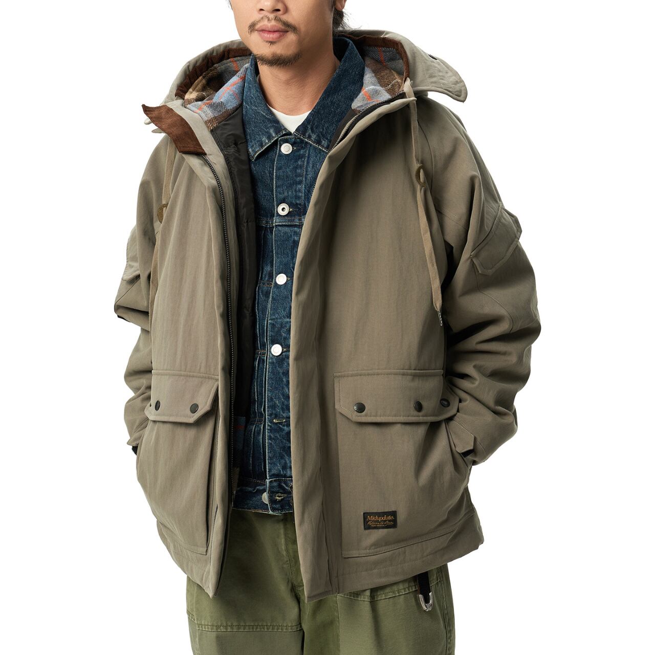 クラシックなチェック柄ライニングと、機能的なミリタリーディテールを融合した、まさに“現代のヘリテージ”。表地にはコットン×ナイロンの混紡素材を使用し、独特のドライタッチとタフな耐久性を両立。裏地には起毛フリースとウール混チェック生地を採用し、見えない部分までこだわりが光ります。中綿には90%ホワイトダックダウンを使用し、見た目以上の高い保温力を実現。ゆとりのあるシルエットで、インナーに厚手のスウェットやジャケットを重ねてももたつきません。街でもアウトドアでも活躍する万能アウターです。