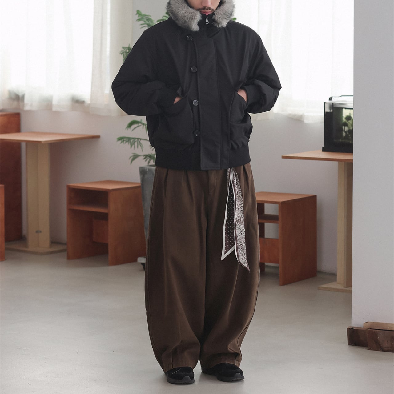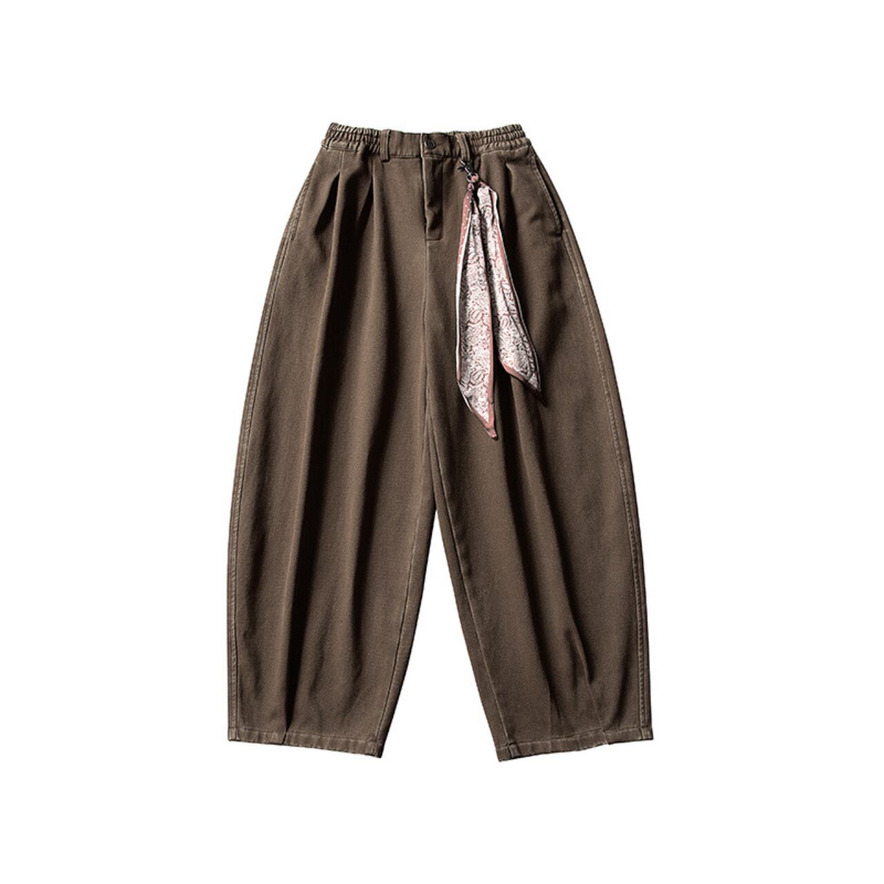 ゆったりとしたシルエットが魅力のワイドパンツ。深みのあるブラウンとブラックの2色展開で、落ち着いた印象ながら、ウエストにあしらわれたペイズリー柄のスカーフがさりげなく個性を主張。タック入りのフロントデザインが立体感を生み、ストリートライクなスタイリングにも、ミニマルなコーディネートにもマッチします。裾に向かって自然に広がるラインが、スタイルに抜け感を与えてくれる一本。