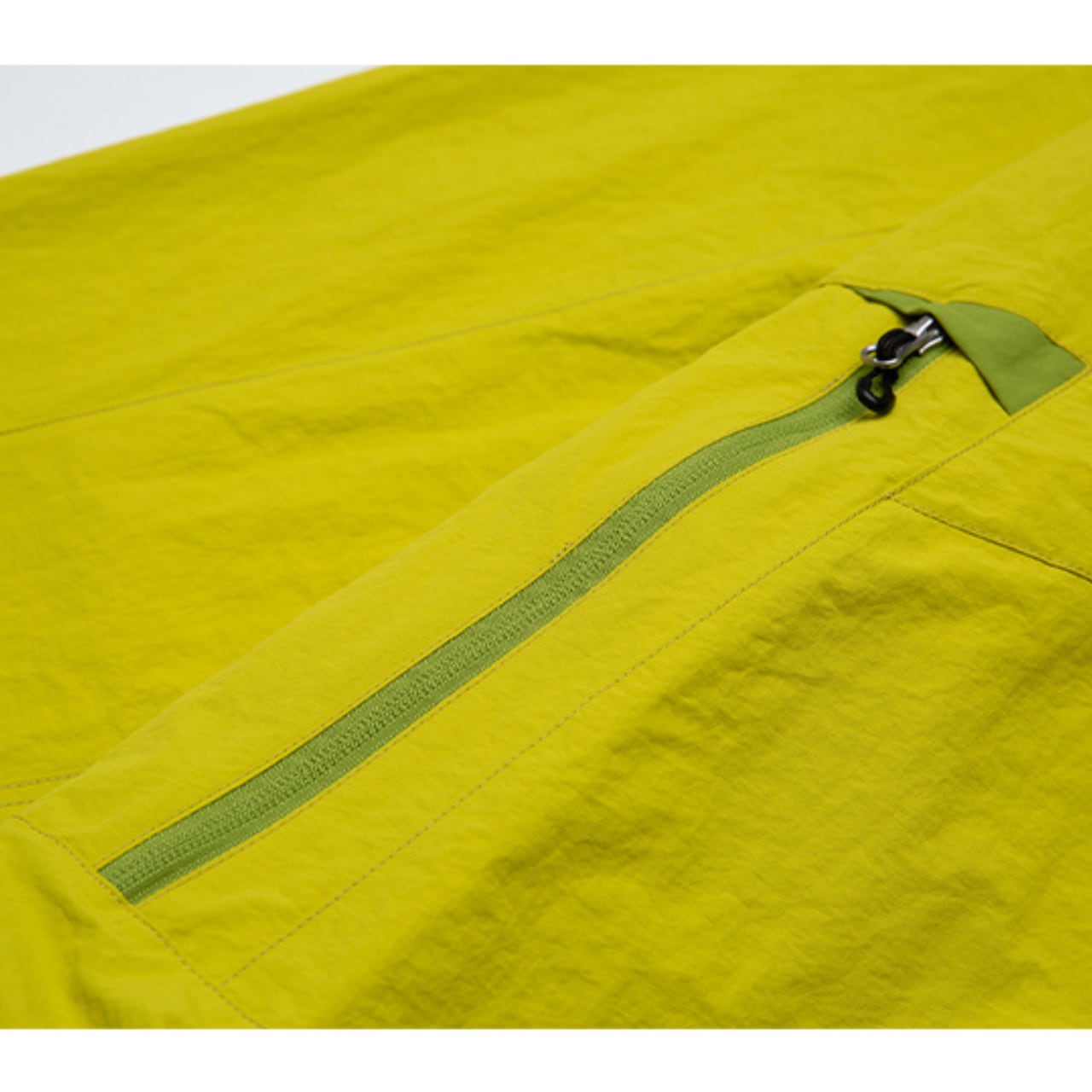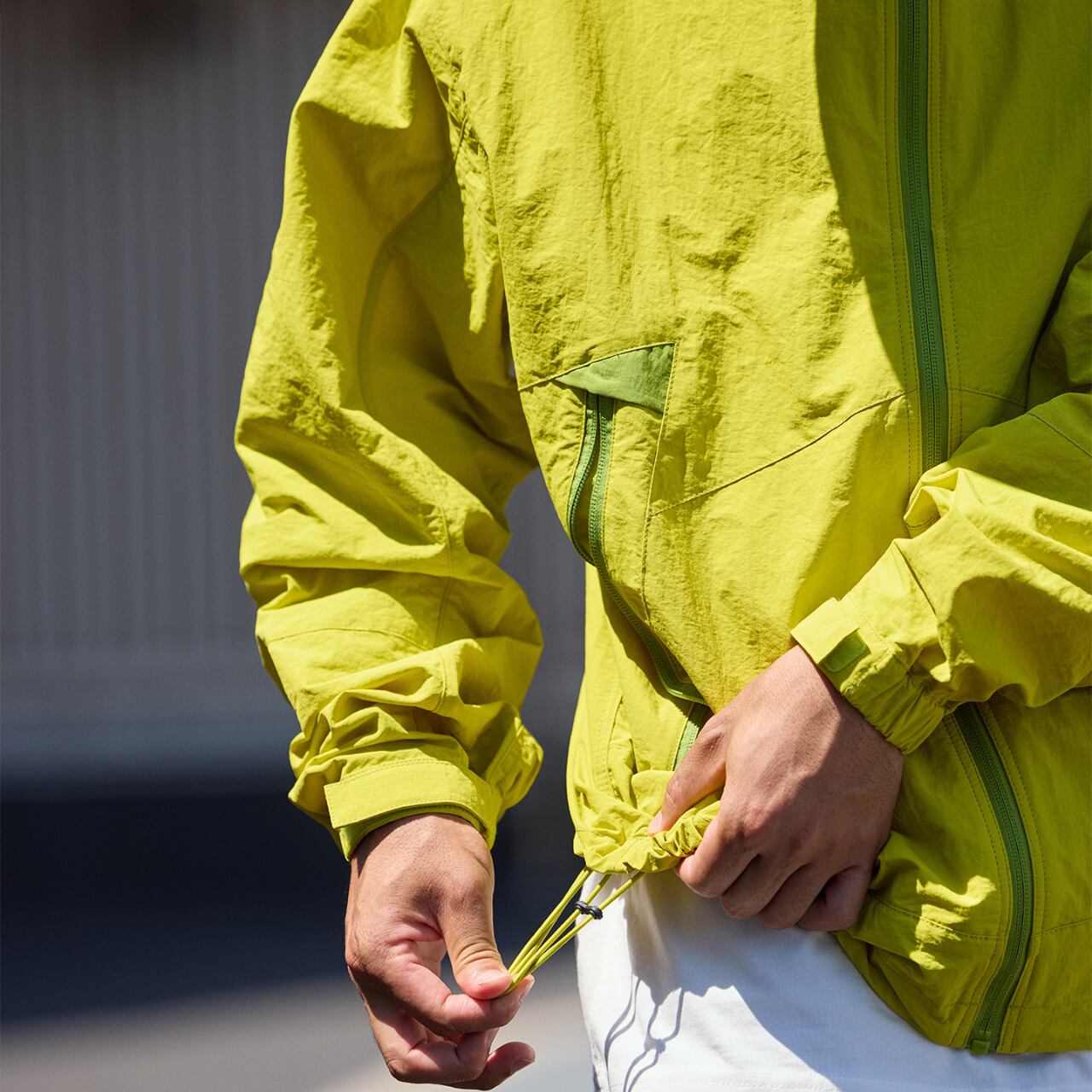 しっかりとしたハリのある生地感ながらも軽量で、タウンユースからアクティブなシーンまで幅広く活躍。裾とフードにはドローコードを備え、シルエット調整も可能。大きめのジップポケットも実用的で、アウトドアスタイルとストリートを掛け合わせたようなデザイン性が魅力。