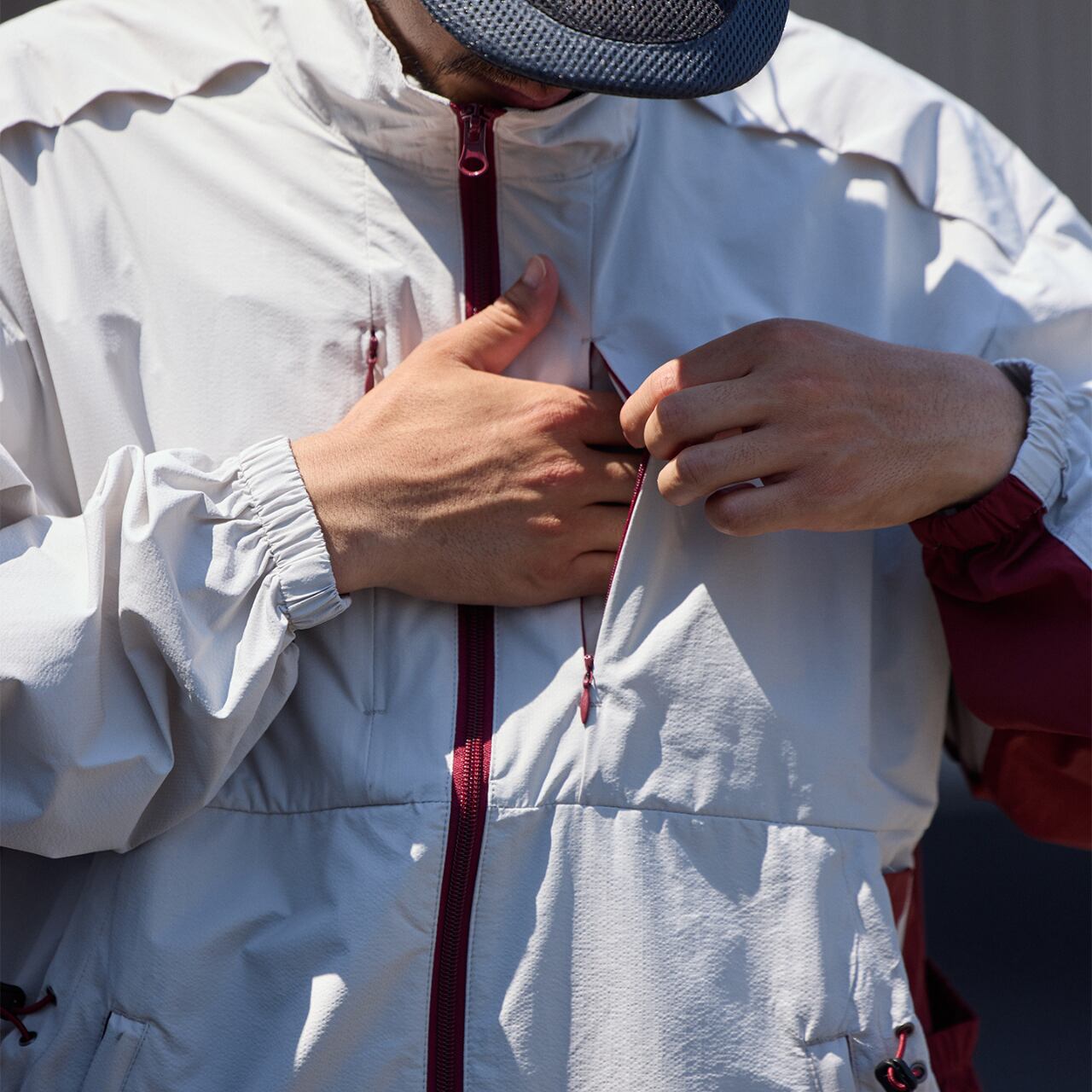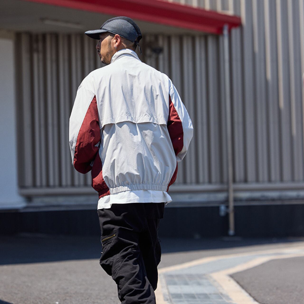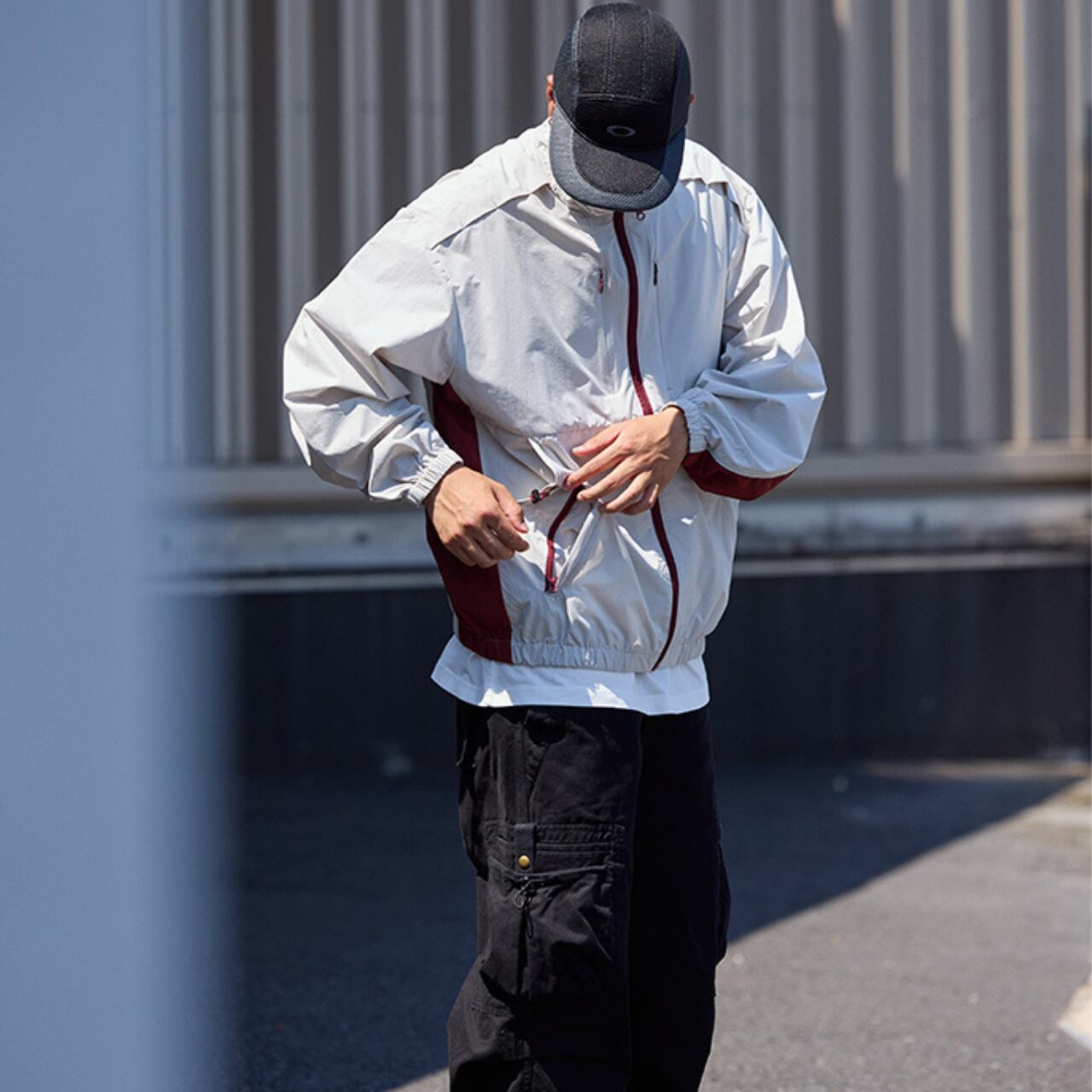 軽快な印象を与えるスタンドカラーのナイロンジャケット。滑らかなポリエステル素材で肌離れも良い。配色の効いたジップや切り替えがアクセントとなり、都会的なアウトドアスタイルを演出。胸元のファスナー付きポケットや裾のドローコードなど、実用性もしっかり確保された一着。ストリートでも映える、存在感あるデザインです。