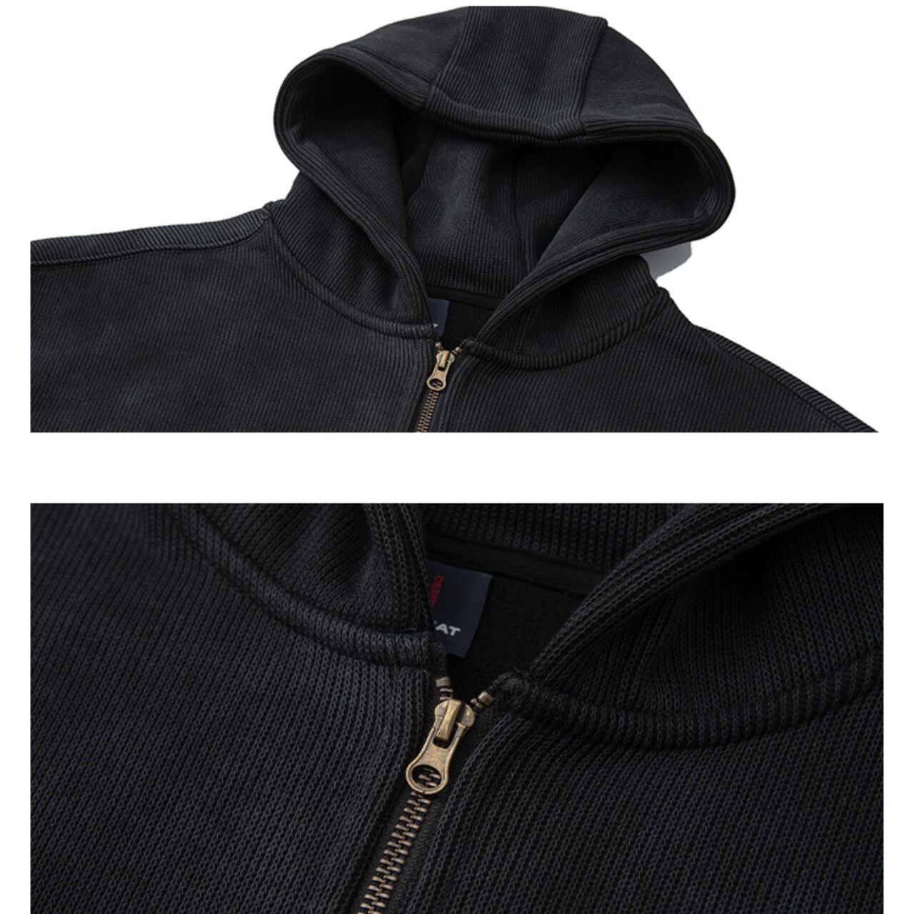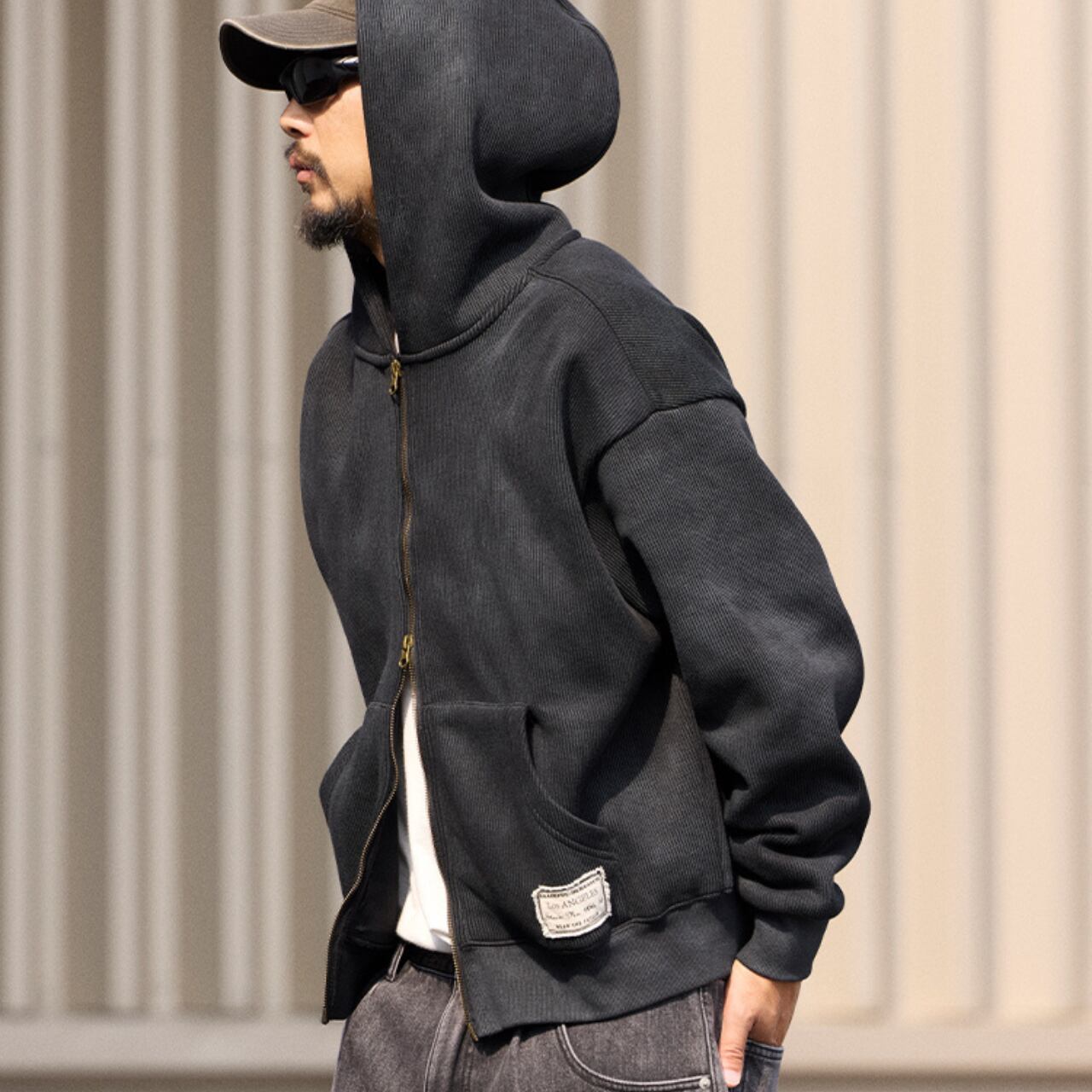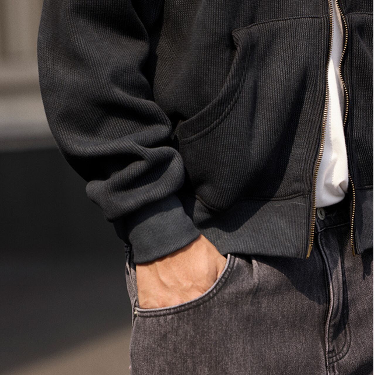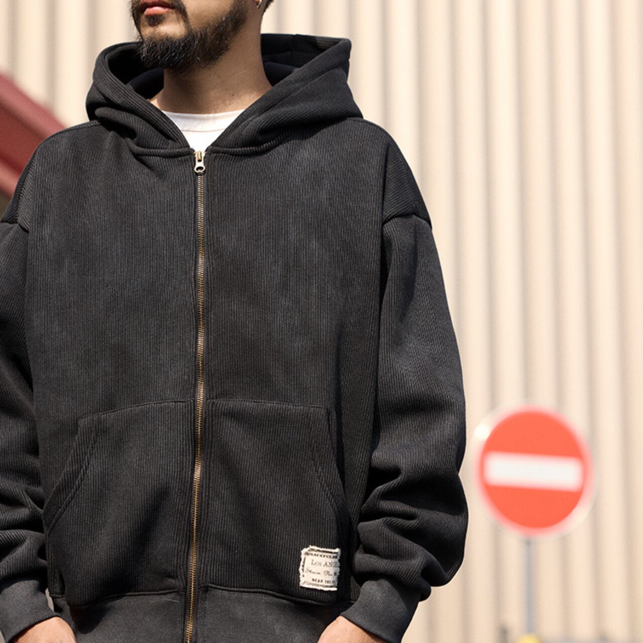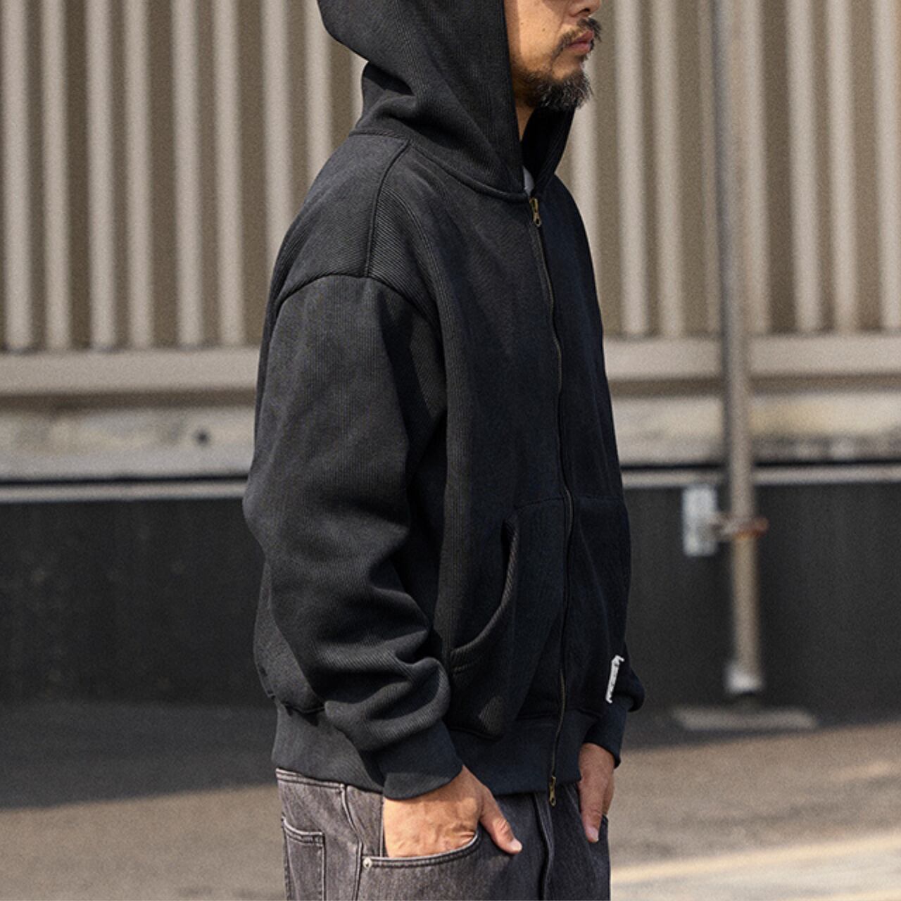 程よくゆとりのあるワイドシルエットと、コーデュロイ調の重厚な質感が大人ストリートにぴったりの一着。フロントはダブルジップ仕様で、上げても下げても印象が変わる自在なスタイルを実現。ブラックのワントーンでまとめられており、どんなボトムスとも合わせやすく、休日のカジュアルから街着まで幅広く対応します。ワードローブに加えるだけで“抜け感”と“こなれ感”を同時に得られる、まさに定番アウターです。