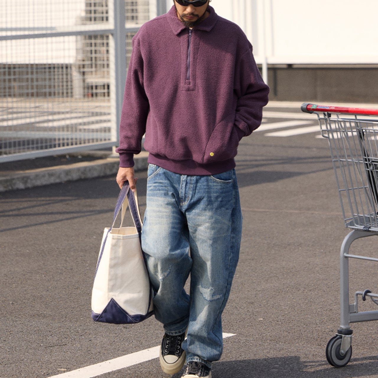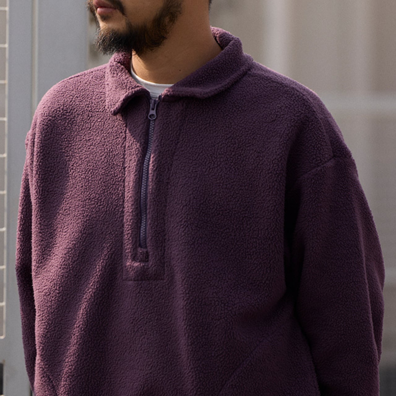 厚手のもこもこフリース素材は防寒性も抜群で、軽やかな着心地ながら見た目にも暖かみを演出。ハーフジップ仕様で、開け閉め次第でインナーを覗かせたり、スタンドカラーとして防寒にも活用できます。