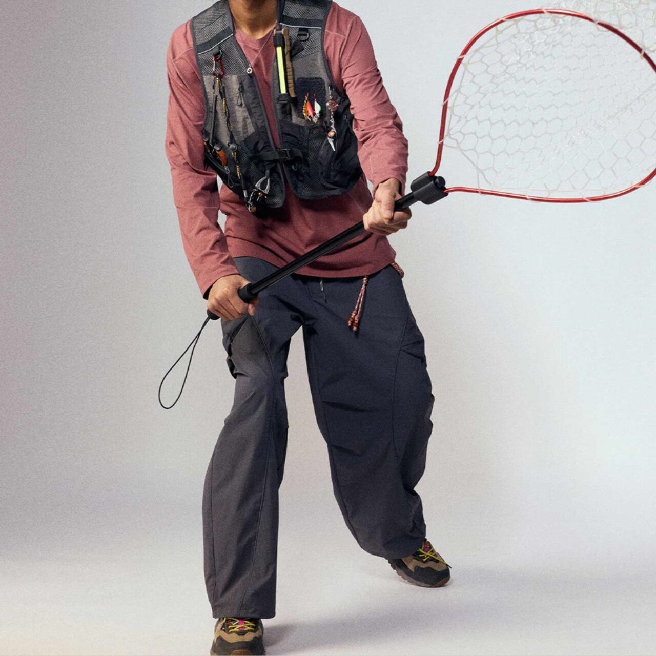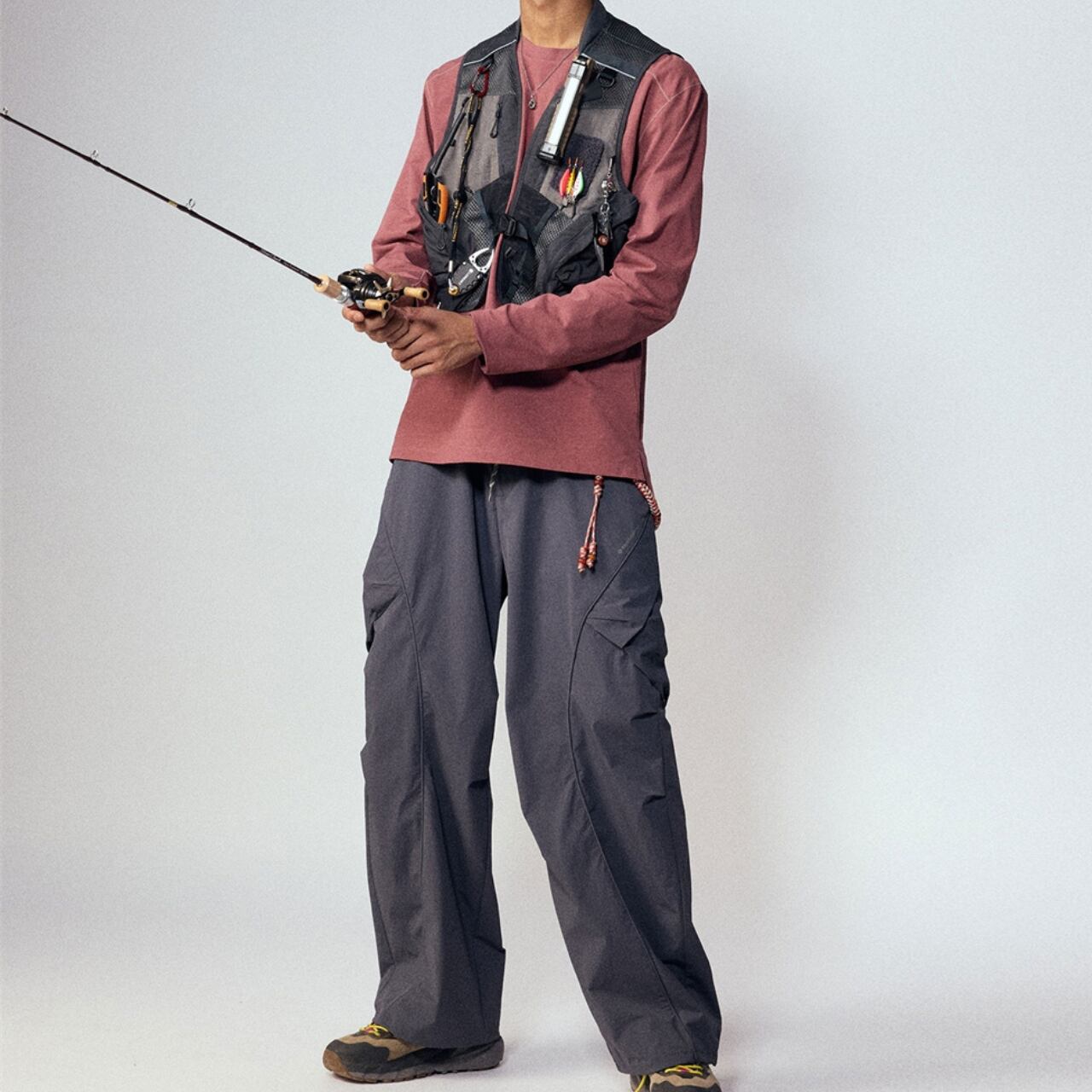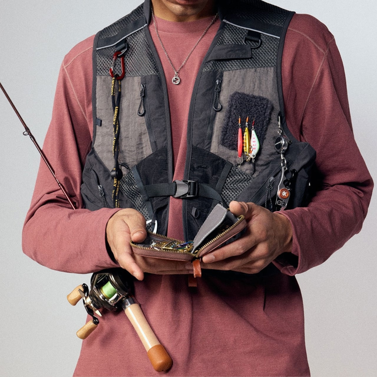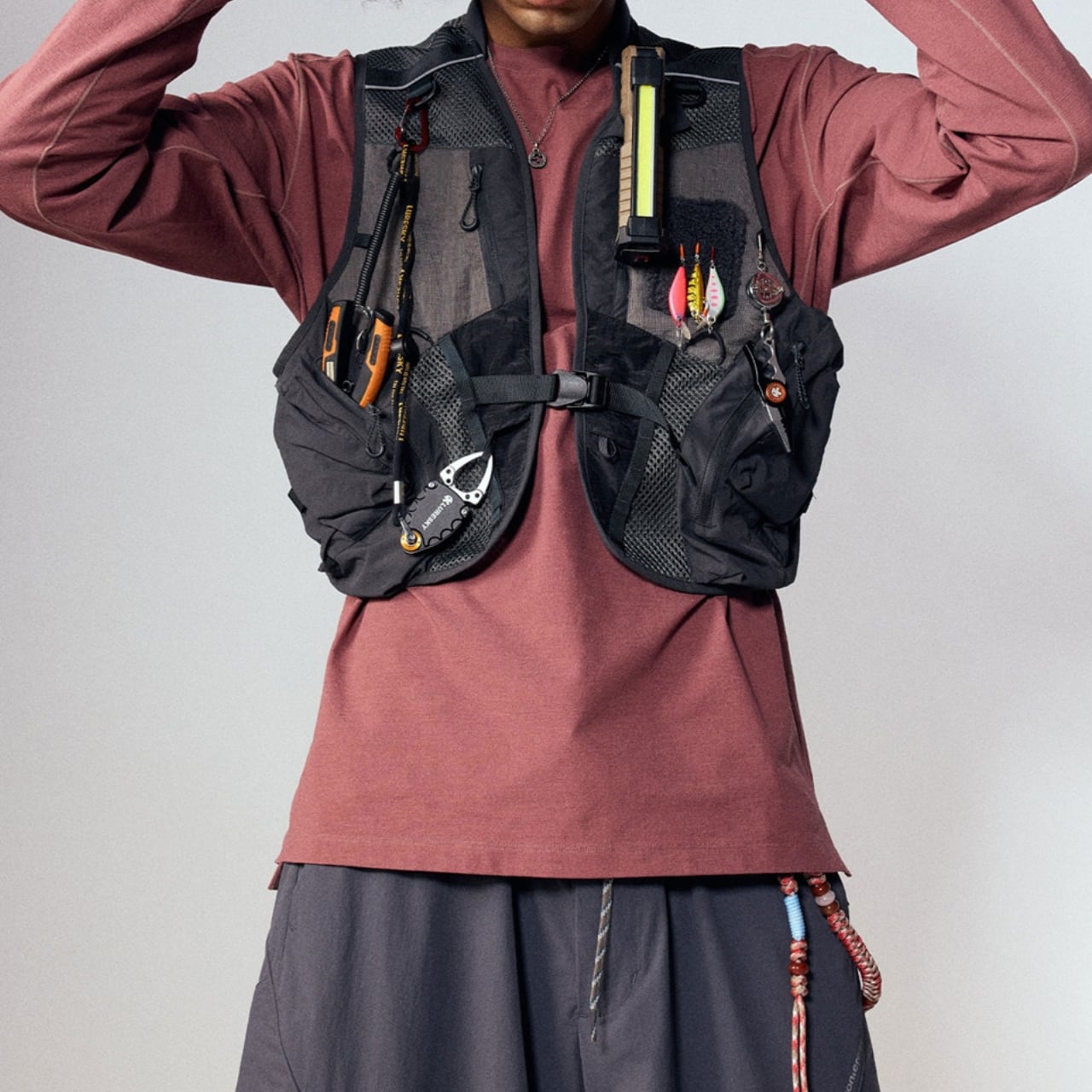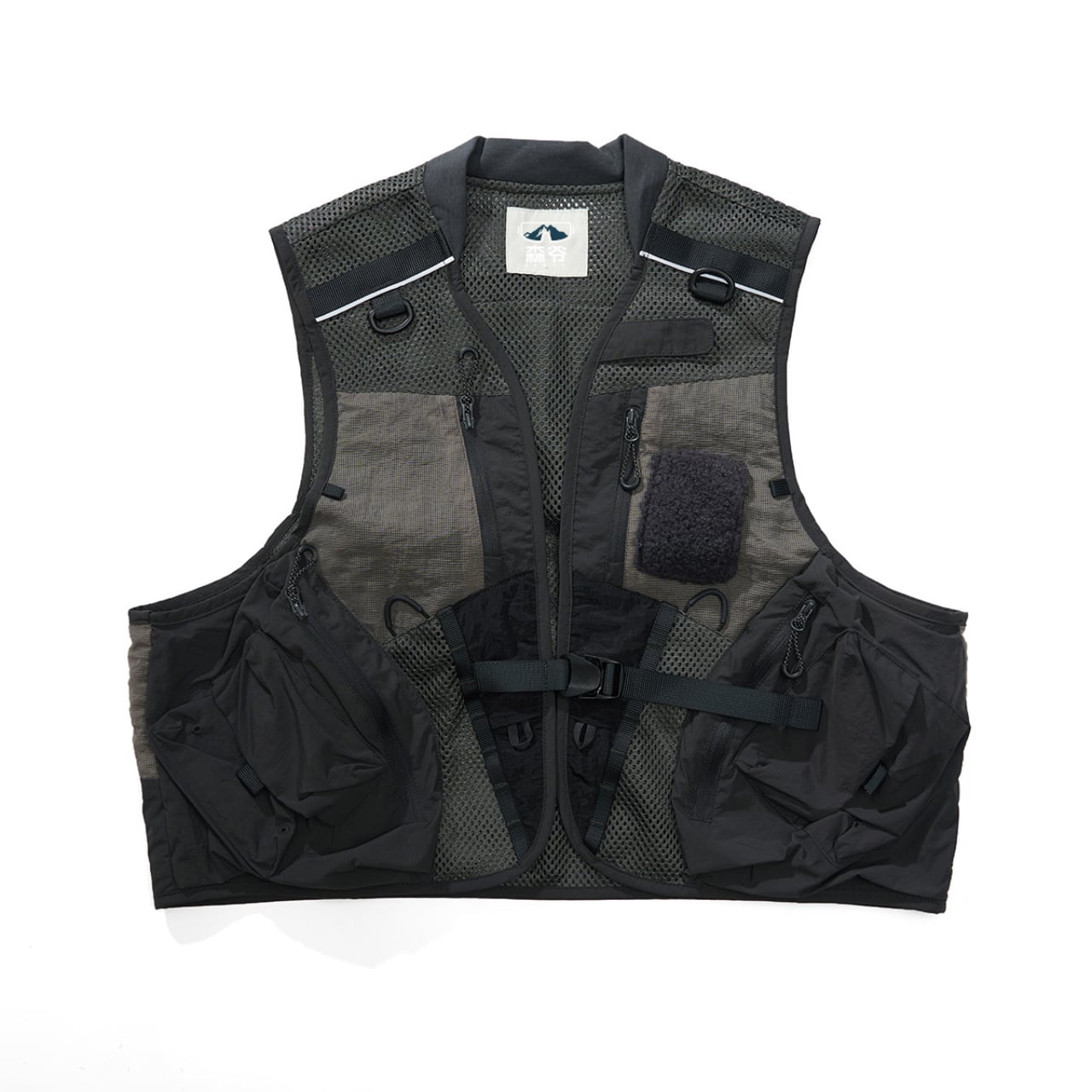 本格的なフィッシングやアウトドアに対応した、多機能ギアベスト。フロントには複数のジッパーポケットやルアーホルダー、Dリングを配置し、釣具やツールをスマートに収納可能。軽量かつ通気性のあるメッシュ素材を使用しており、長時間の着用も快適。タウンユースでも映える無骨なスタイルで、ストリートにもミックスしやすい1着です。