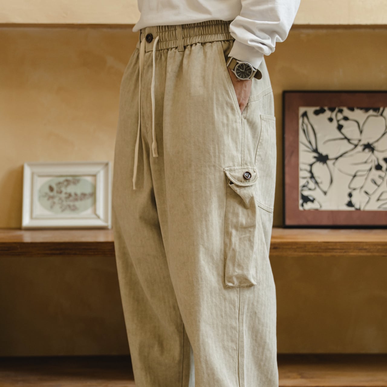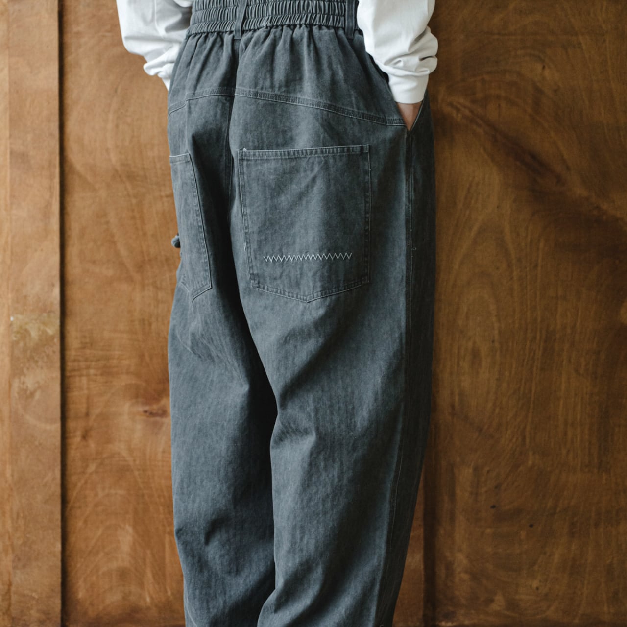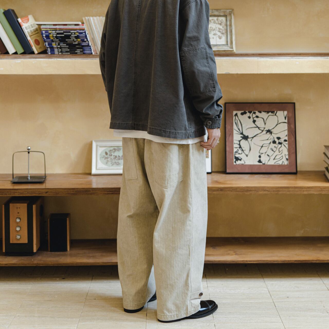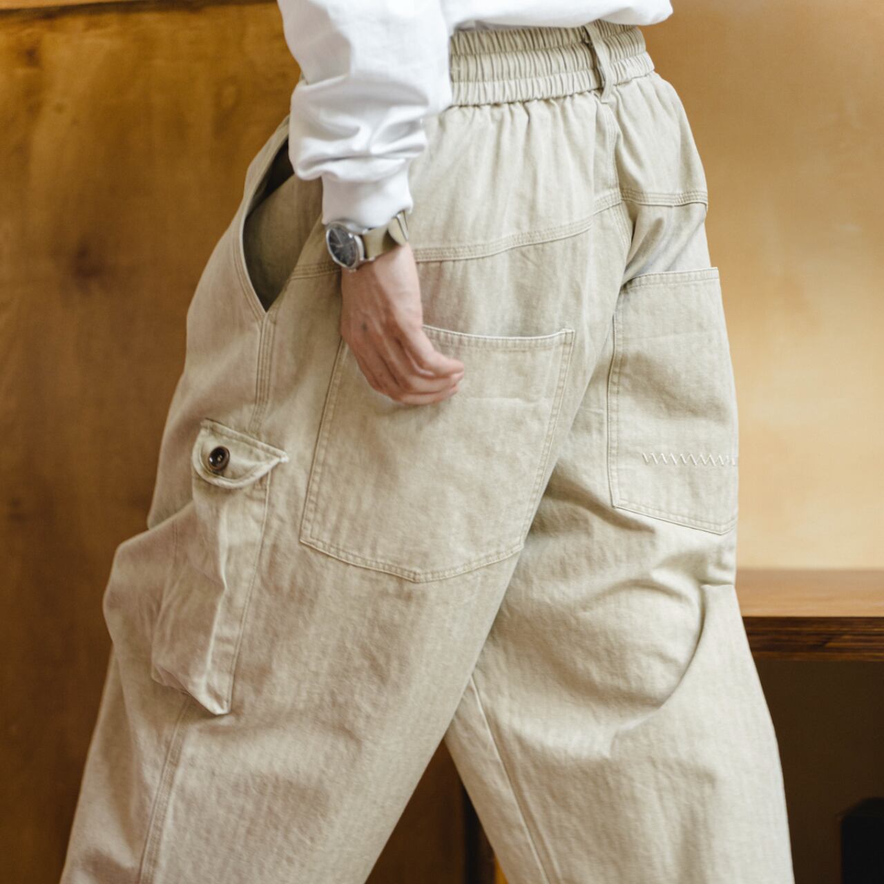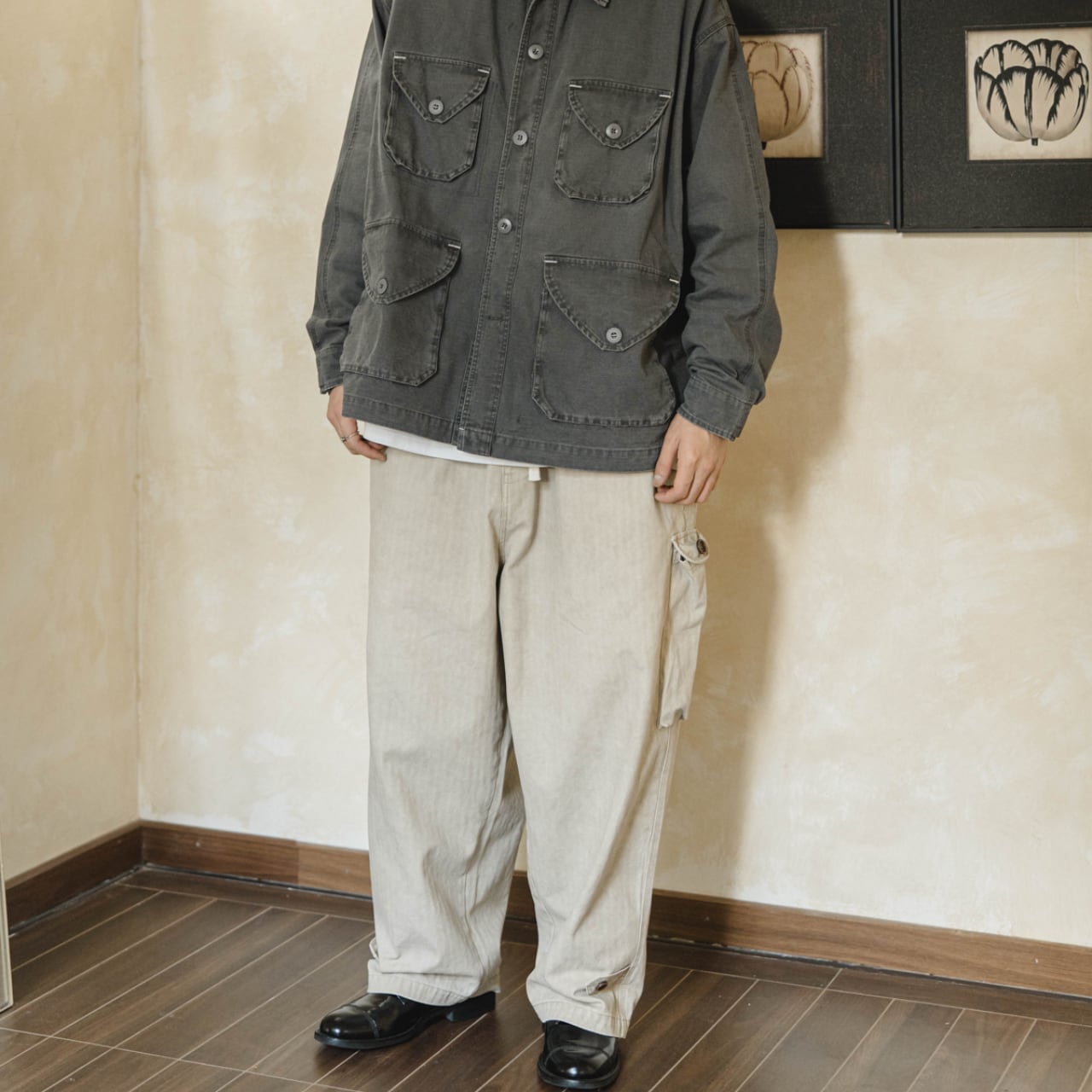 フィッシュボーン織りコットン素材に、酵素ウォッシュ加工を施した一本。表面は白っぽく起毛したヴィンテージライクな風合いで、深みのある立体的な印象を演出。丸みを帯びたワイドシルエットは、程よい抜け感とゆったりとした快適さを両立。裾部分にはギミックの効いた長めのジップポケットを配置し、細部までこだわったディテールが魅力です。トップスはシンプルなシャツやスウェットと合わせて、都会的なミリタリースタイルに。