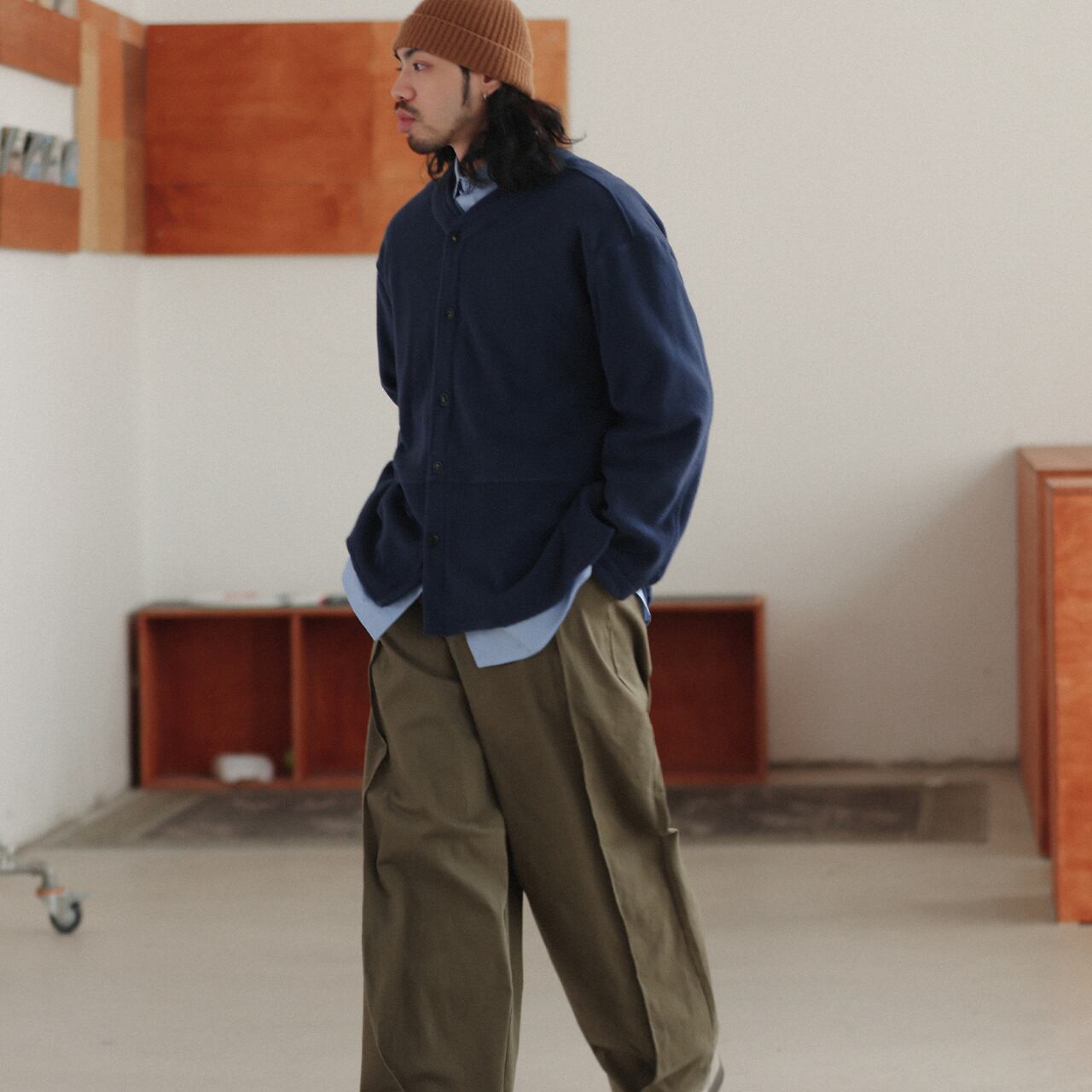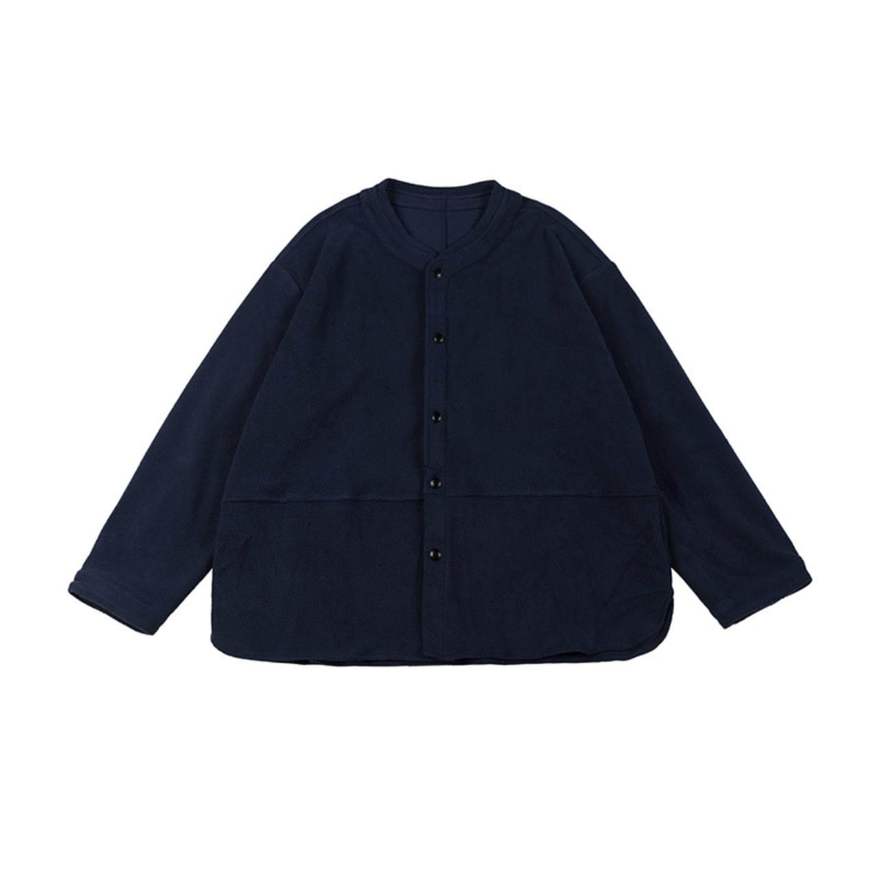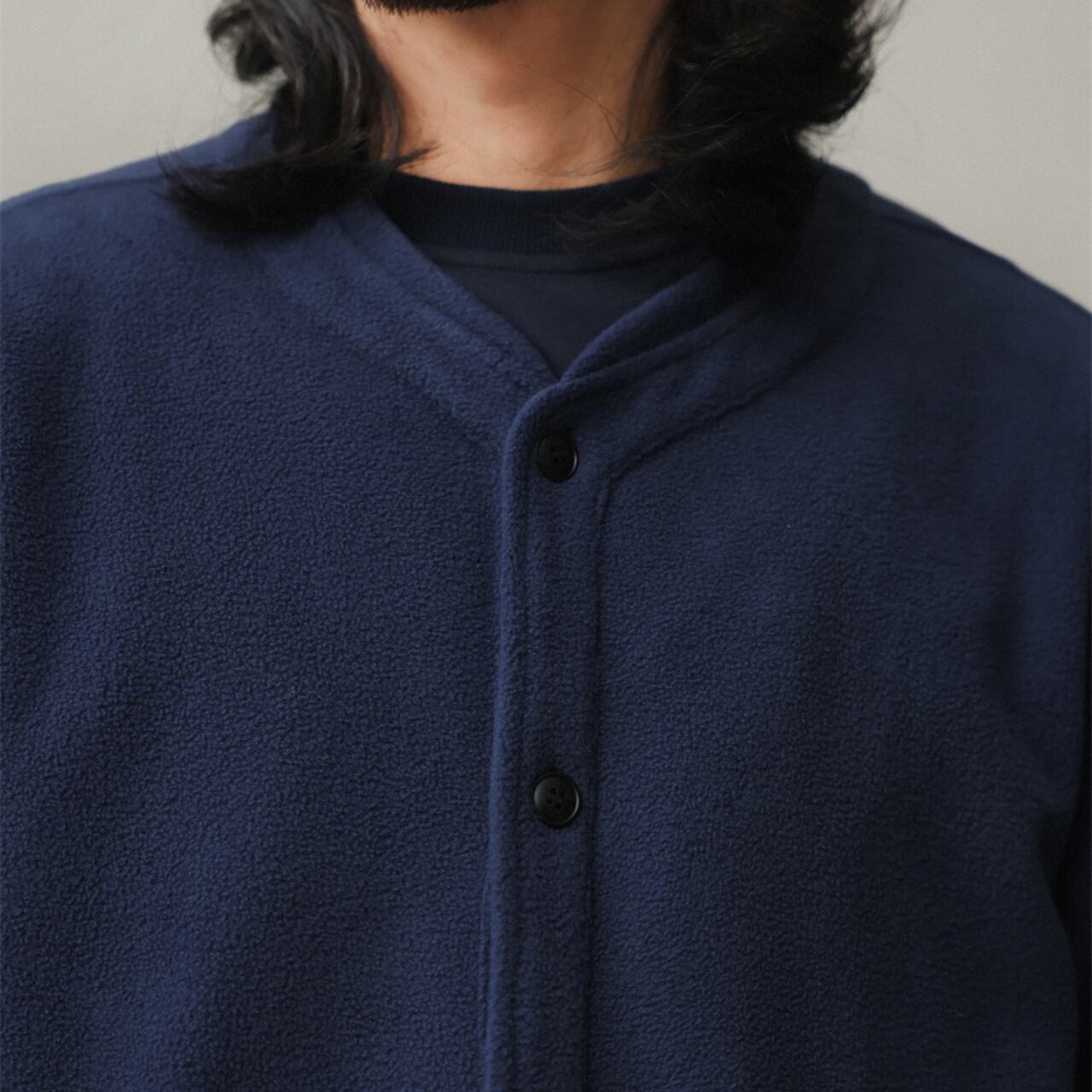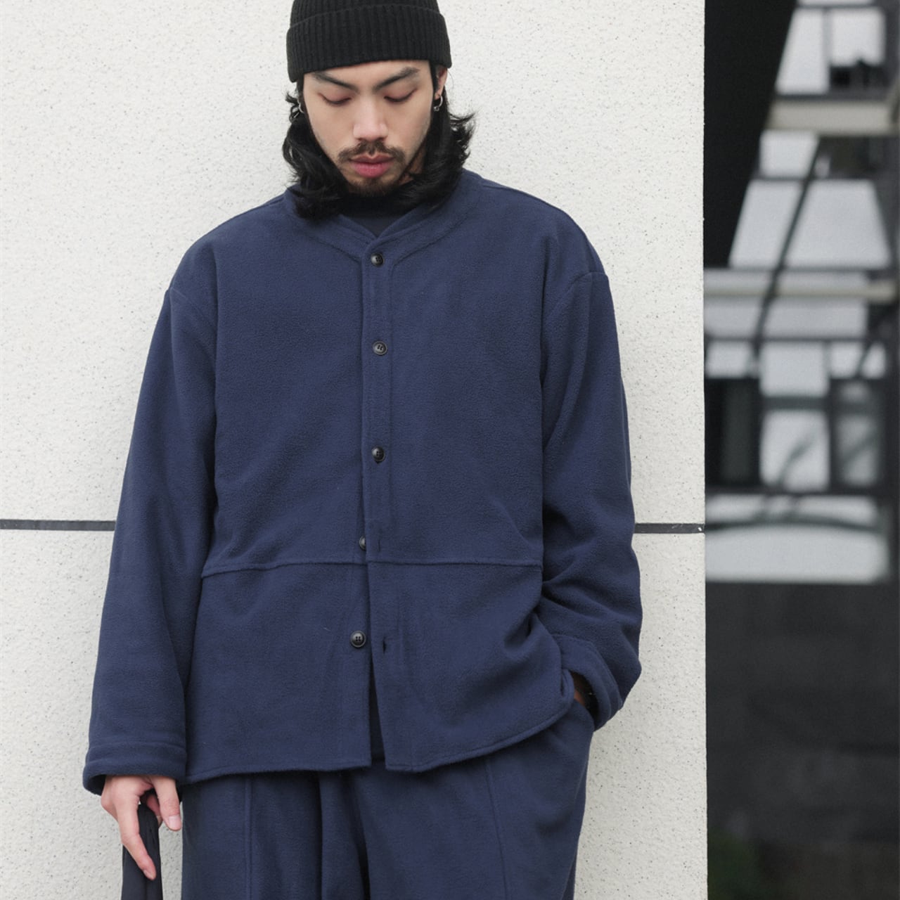 ふっくらとしたフリース素材を使用した、軽量かつ温もりのあるカーディガンジャケット。丸みのあるショルダーラインと程よくリラックスしたシルエットが、抜け感ある都会的スタイルを演出します。襟元はスタンド気味のノーカラーデザインで、インナーにシャツやハイネックを合わせてももたつかず、すっきりとした印象に。ミニマルなディテールながら、生地の質感と絶妙なシルエットで差のつく一枚。秋冬のレイヤードスタイルに重宝します。