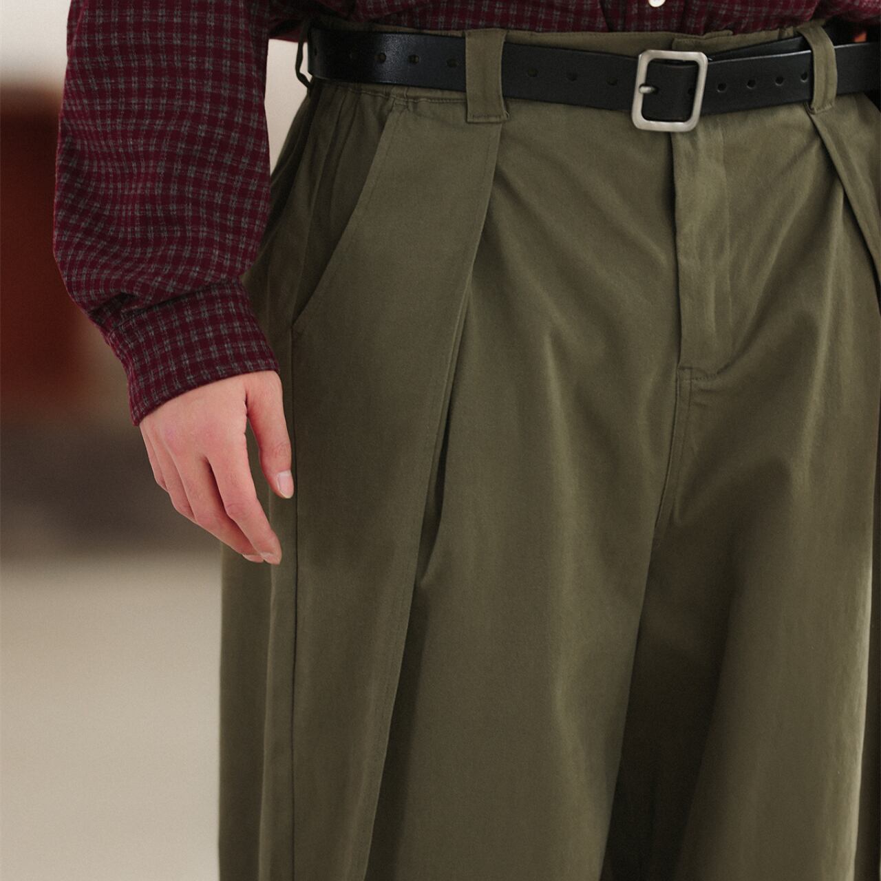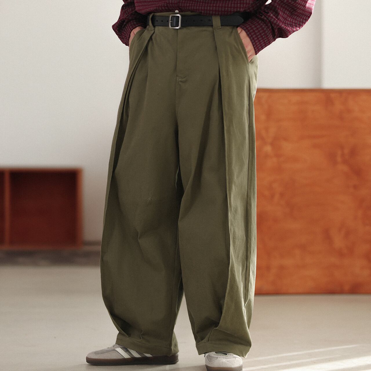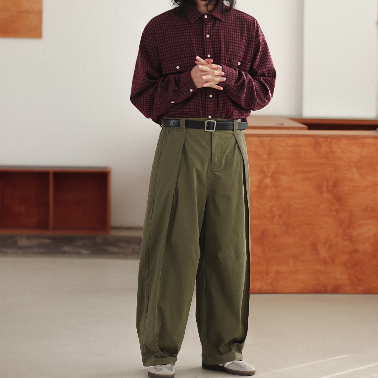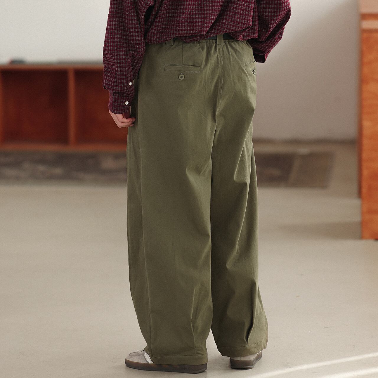 深めのタックとたっぷりとしたシルエットが印象的なワイドトラウザーズ。フロントとバックに施された貫通式タックが、独特の立体感とドレープを生み出し、ヴィンテージライクなムードを演出。シンプルながらも個性が光る一本です。