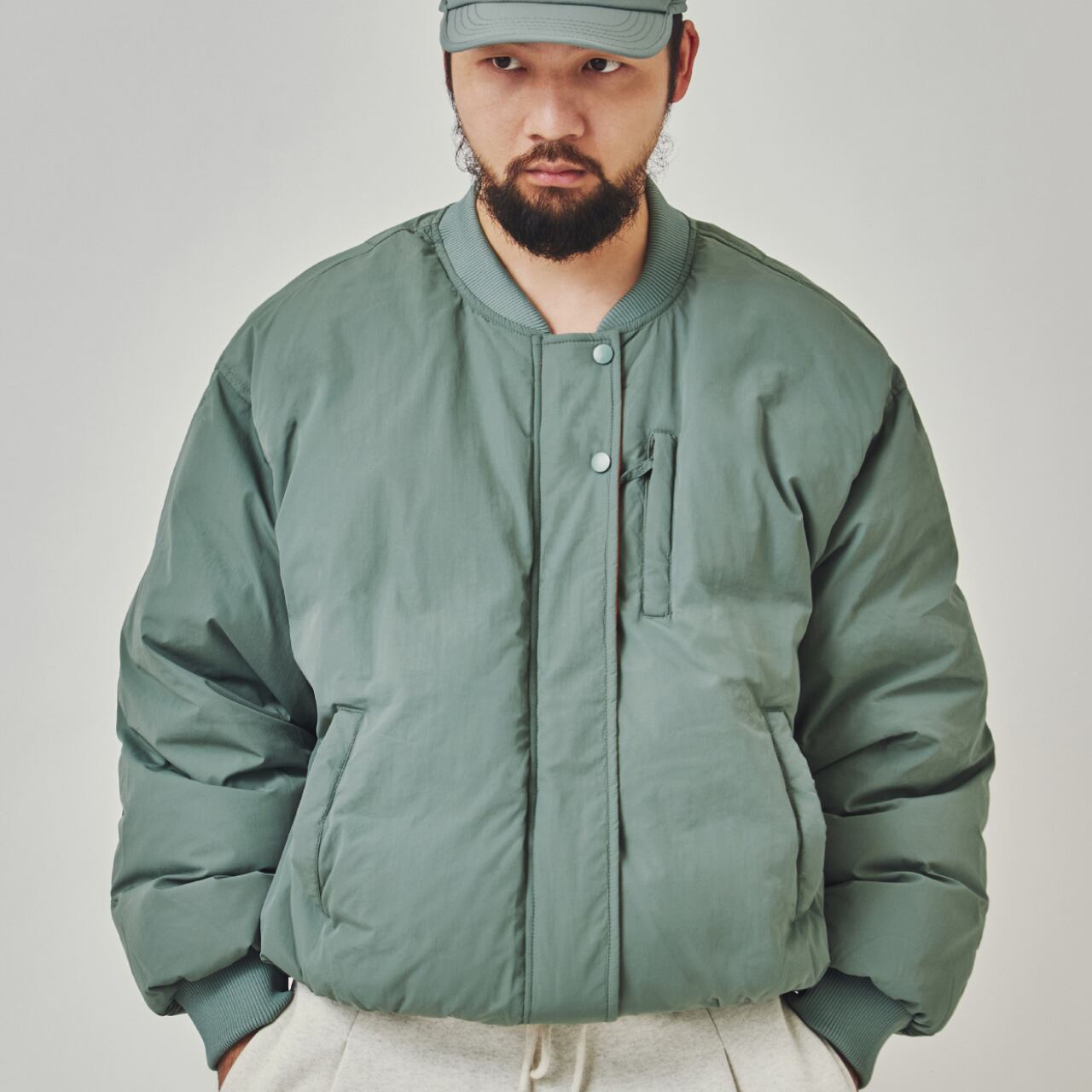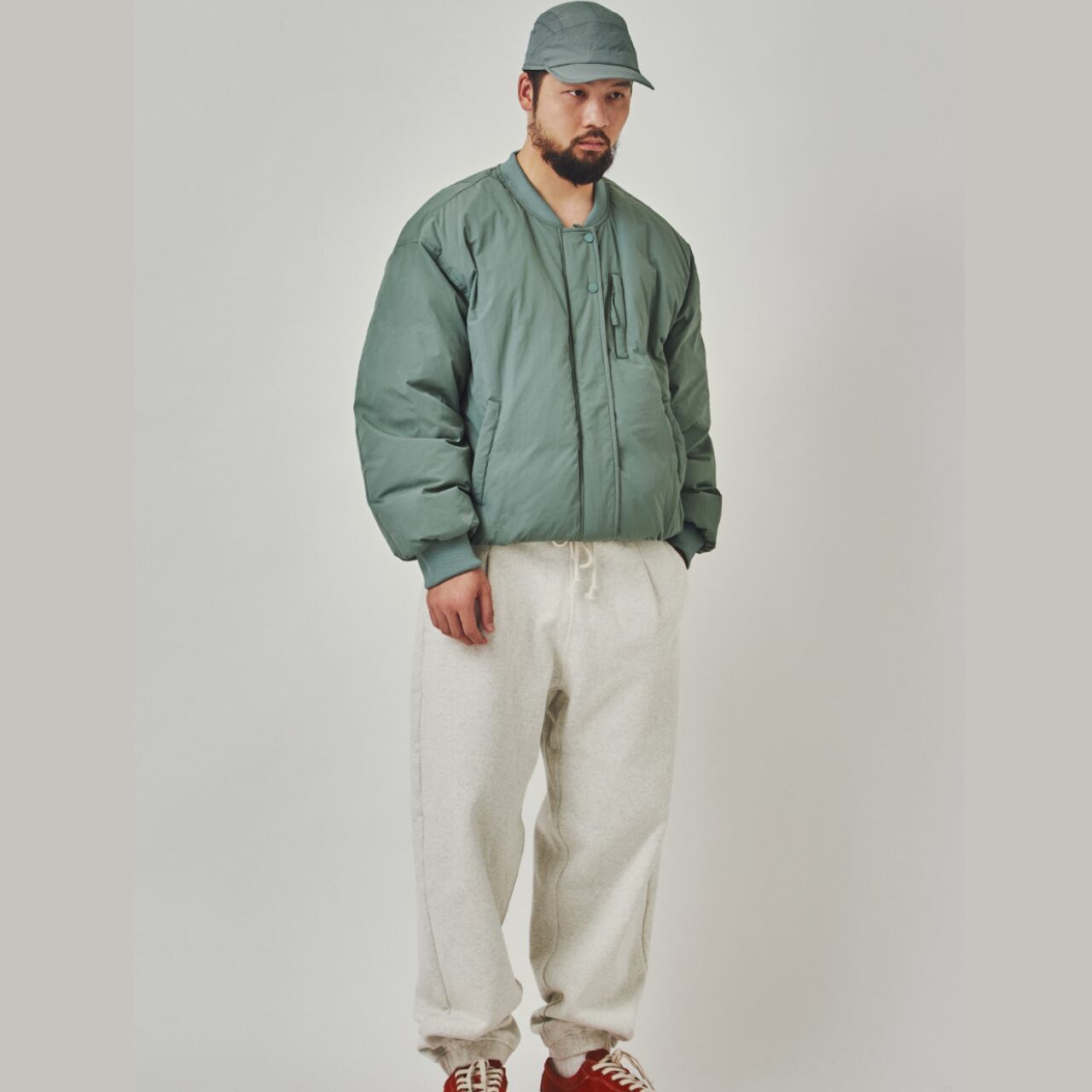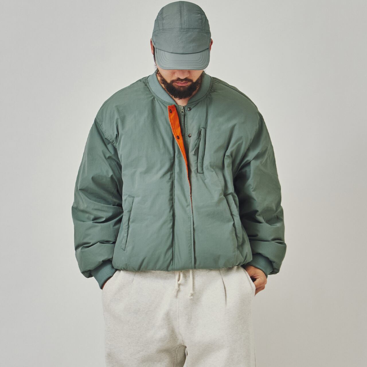 クラシックなミリタリーテイストに、現代的なシルエットを融合させた中綿ブルゾン。しっかりとした厚みのある生地感で、ダウンライクな保温力を実現。中綿入りながらも軽く、ノーカラーでインナーのレイヤードも自由自在。カーゴパンツやスウェットとの相性も良く、アウトドアにも都会のストリートにも馴染む万能アウター。ユニセックスで楽しめるボリューム感もポイントです。