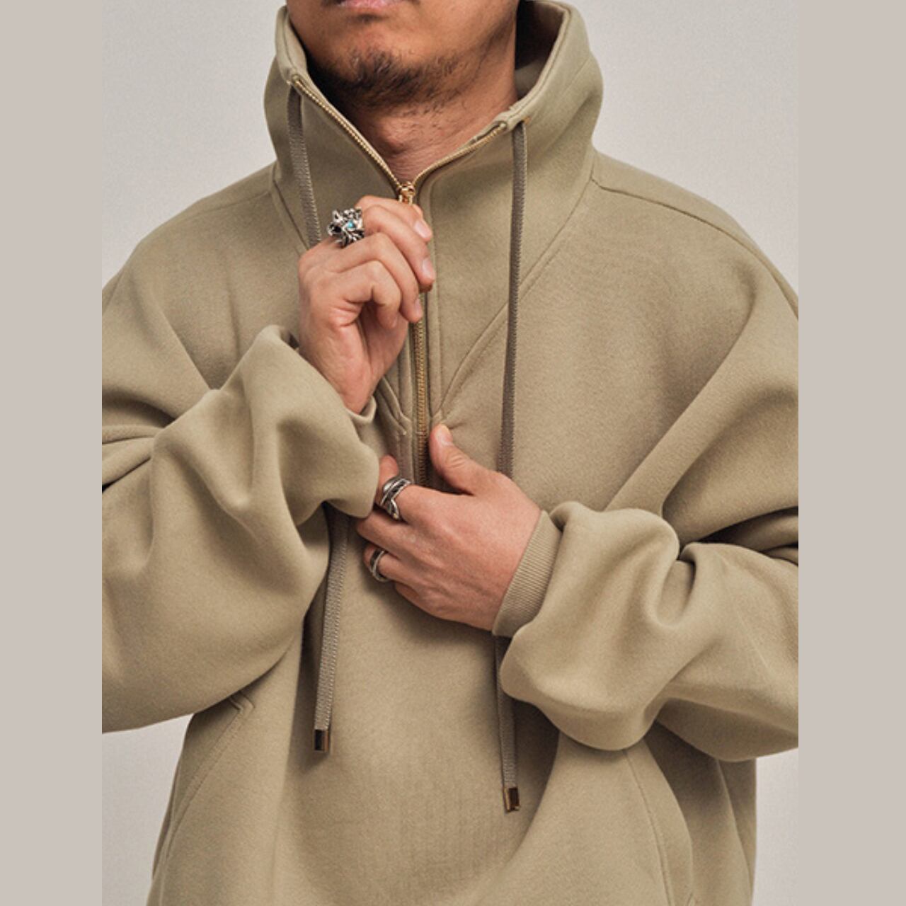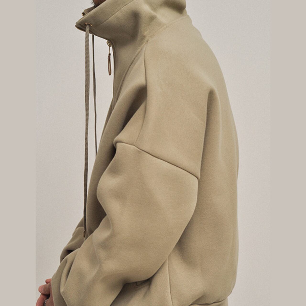 立ち上がりのあるハイネックと、ゆったりしたシルエットが印象的なボリュームスウェット。重厚感のある肉厚生地を使用し、1枚でも存在感抜群。フロントはハーフジップ仕様で、着脱もスムーズ。裾と袖に程よいフィット感を持たせ、タックイン・アウトどちらもキマる万能アイテム。セットアップでの着用はもちろん、カーゴパンツやデニムとも好相性。