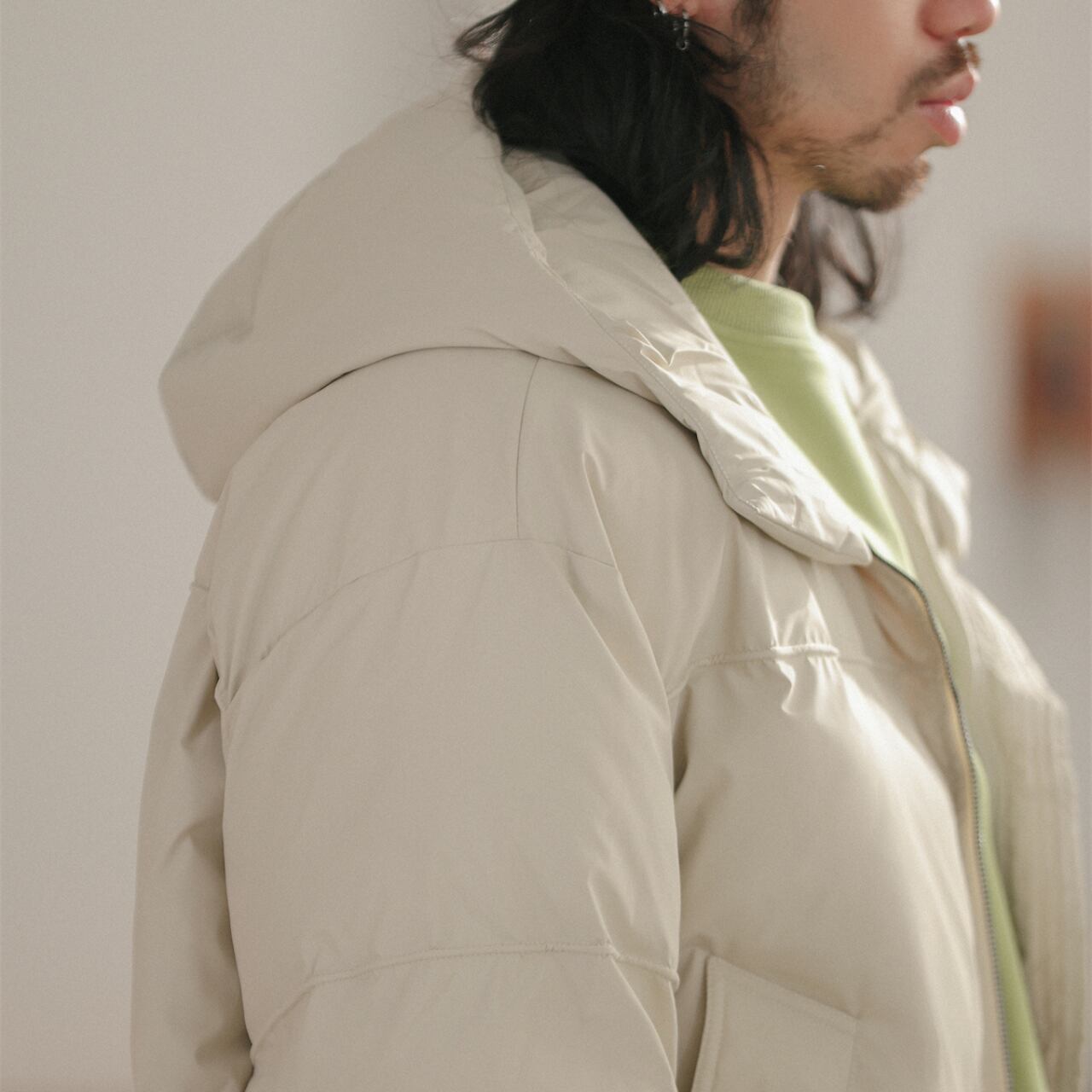 軽量かつふっくらとしたシルエットが魅力の、ハイネック仕様のショート丈ダウンジャケット。ふわっと立ち上がる襟元とフードが首まわりをしっかりと包み込み、保温性も抜群。無駄を削いだミニマルなデザインに、柔らかく上品なアイボリートーンが加わることで、都会的で洗練された冬の装いに。裾のギャザー仕様が自然な丸みを作り、ワイドパンツとの相性も◎。アースカラーとのレイヤードや、ビビッドな差し色を効かせたコーディネートもおすすめ。