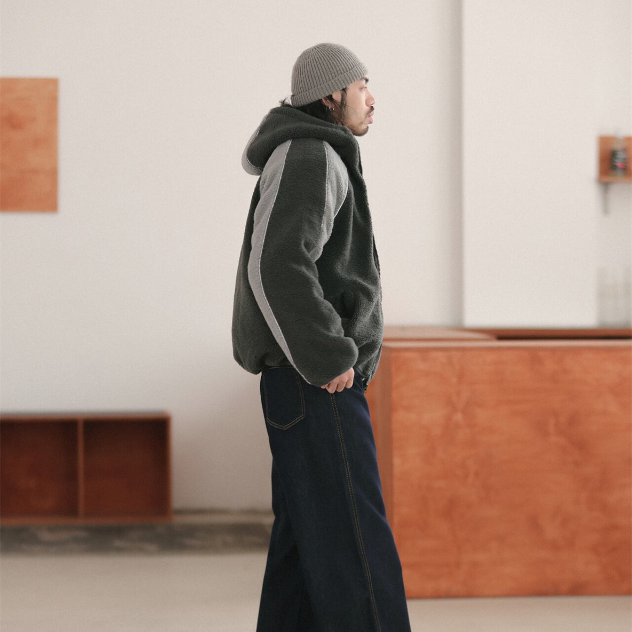 柔らかく厚みのあるボア素材を使用し、寒さからしっかり守ってくれるフーディブルゾン。アウターとしての存在感はもちろん、腕や肩部分にあしらわれたバイカラーデザインがスポーティで都会的なムードを演出します。程よいドロップショルダーと裾のギャザー仕様で、ボリュームのあるシルエットをキープ。ゆったりとしたニットやスウェットの上から羽織っても着膨れしにくく、真冬のデイリースタイルにぴったりの一着。