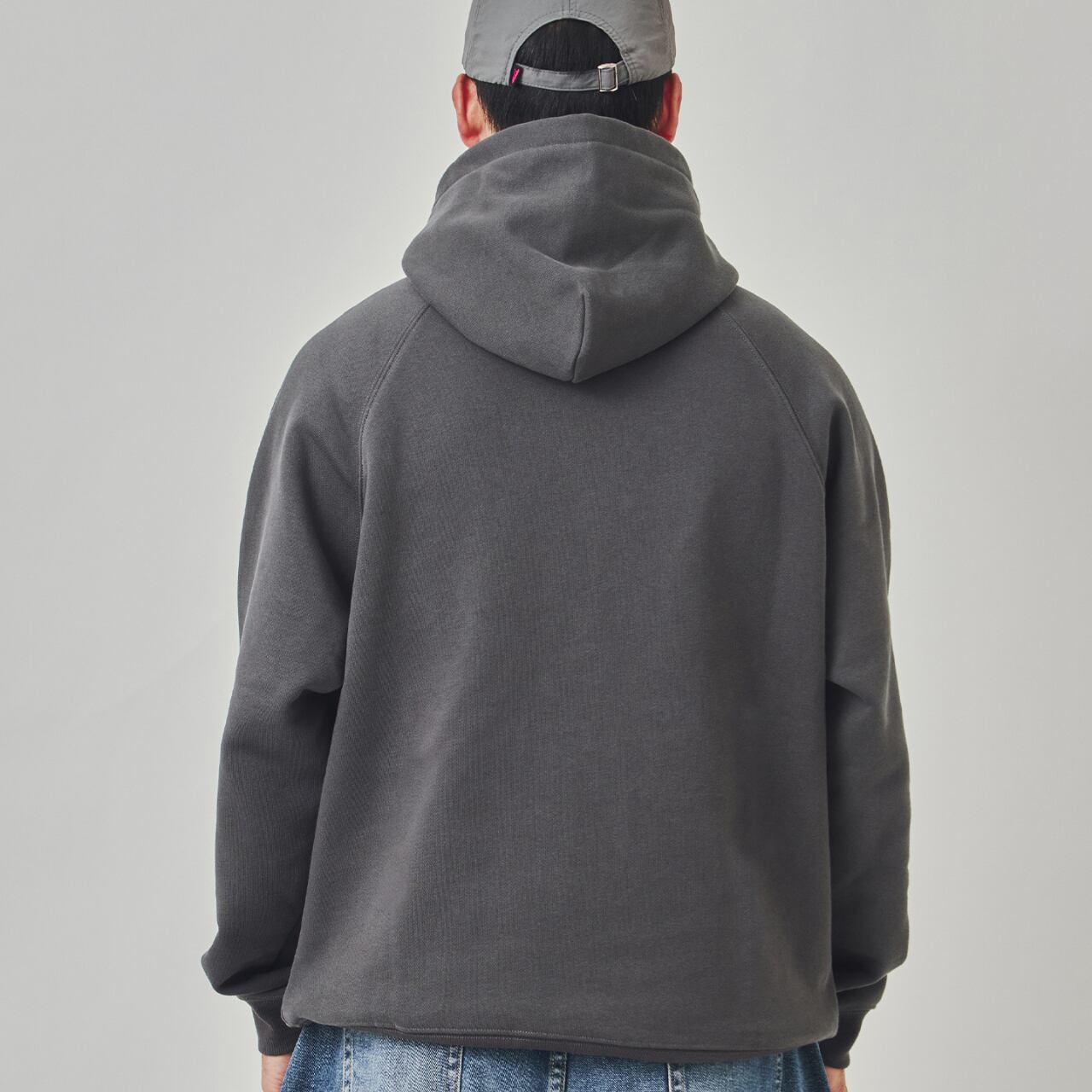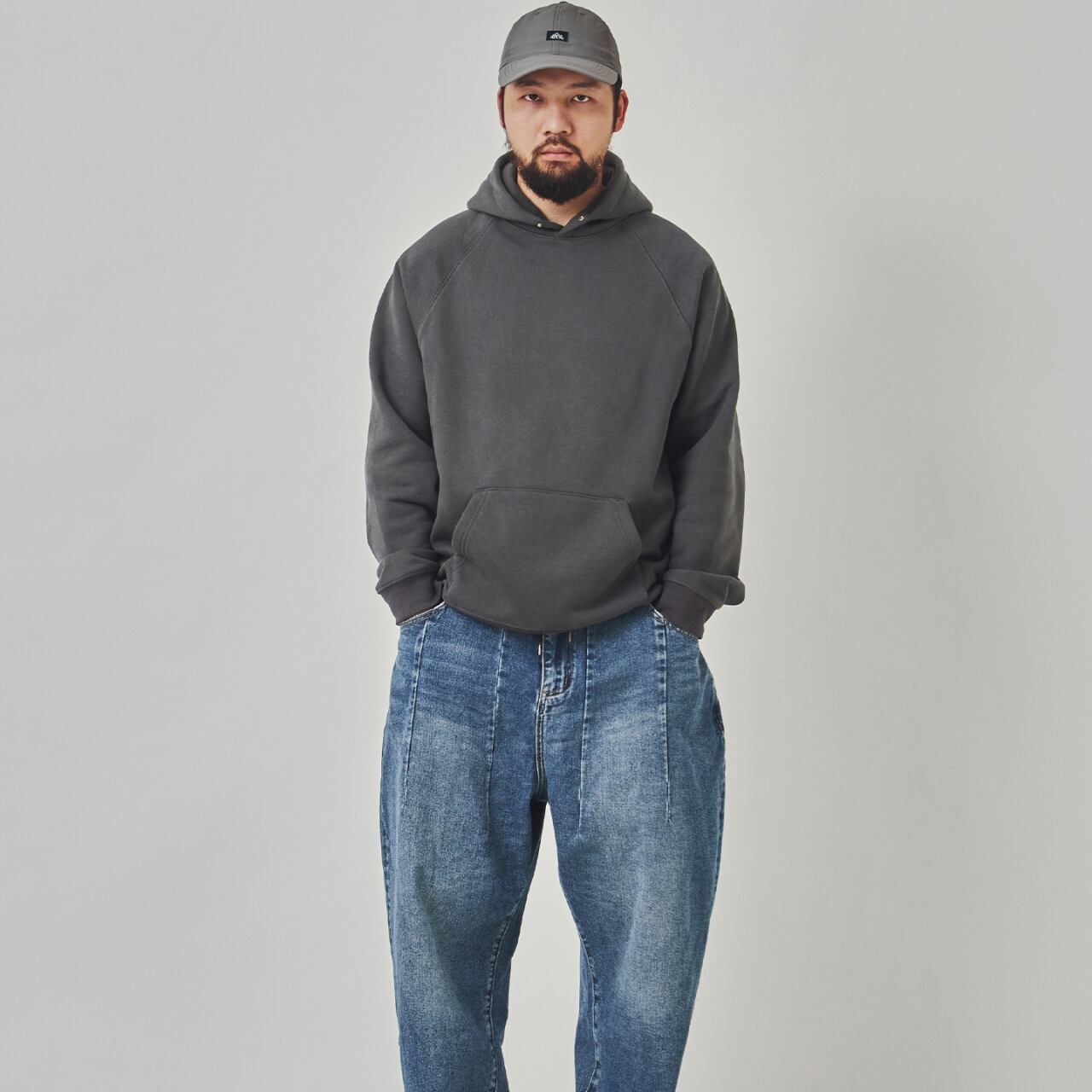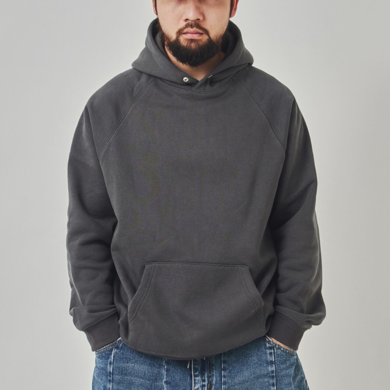 内側にしっかりとした起毛裏地を施した、冬でも暖かく着られるヘビースウェットパーカー。肩まわりが動きやすいラグランスリーブ仕様で、リラックス感のあるワイドシルエット。洗いのかかったようなスモーキーなトーンが、ストリートにもナチュラルにも馴染む絶妙カラー。アウターの中でもかさばらず、インナーとしても一枚着としても使える万能アイテム。着込むほどに味が出る、デイリーに使える1枚です。