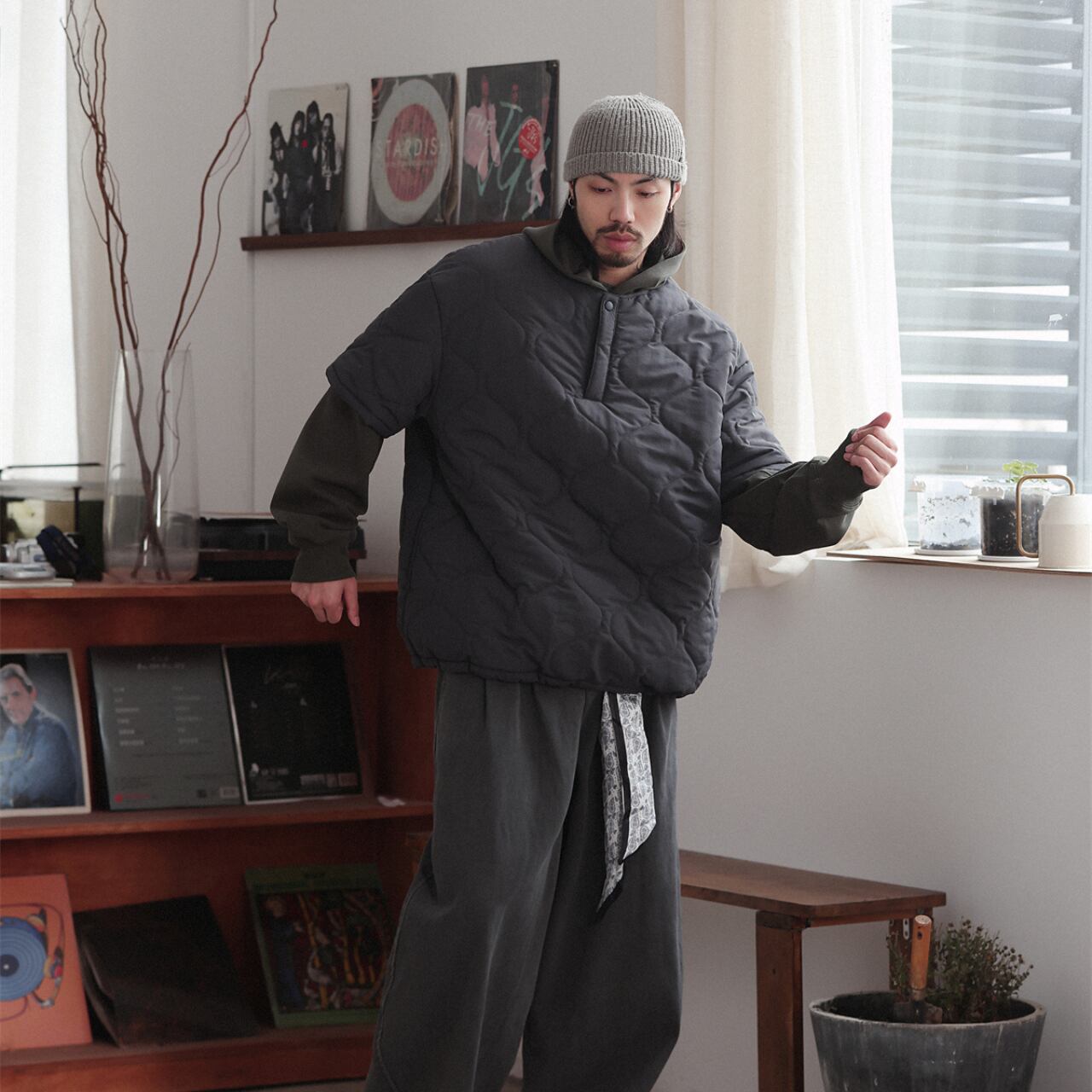 ユニークな存在感を放つ中綿入り半袖キルトトップス。丸みのあるシルエットと短めの袖丈がレイヤードスタイルを引き立て、シャツやスウェットとの相性も抜群。中綿には100gの軽量ファイバーコットンを使用し、驚くほど軽く暖かい着心地を実現。裾にはドローコードを配し、シルエットの調整も可能。無骨さとモード感を兼ね備えた、冬のインナーにもアウターにも使える1枚。