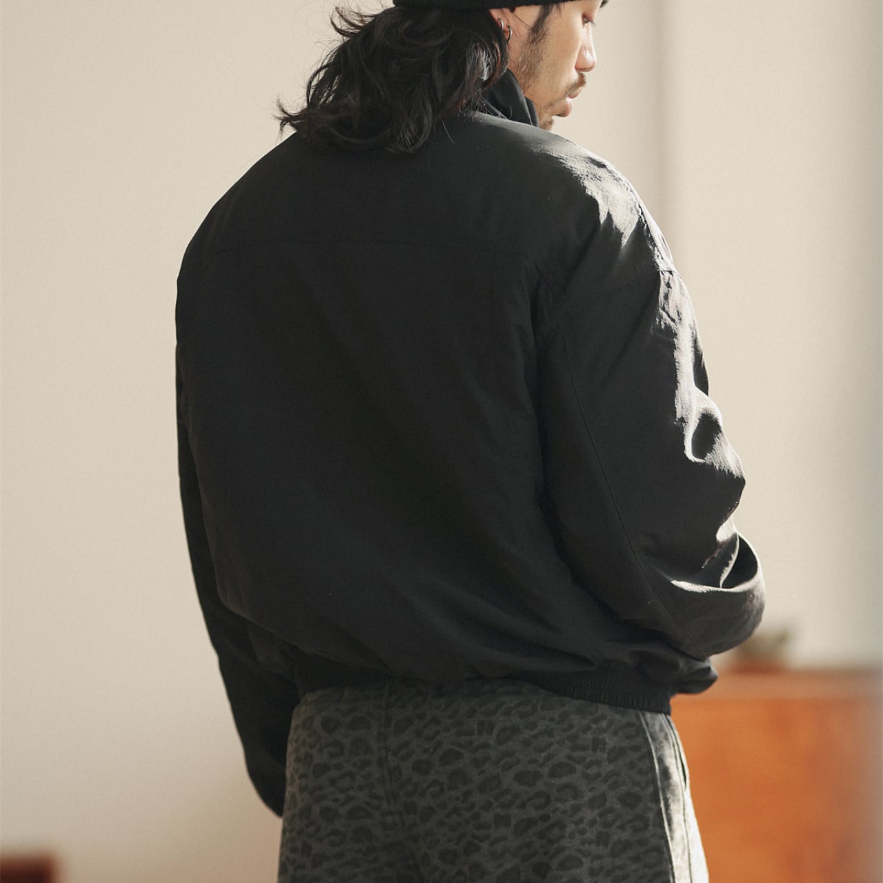 ミニマルなデザインに宿る機能性。高密度ナイロンを使用したスタンドカラーブルゾンは、防風・撥水性を兼ね備えた実用性と、落ち着いた質感が魅力の一着。表面にはナチュラルなシワ感と竹節のような糸の凹凸が見られ、素材そのものが表情を生み出します。着丈はやや短めで、パンツとのバランスを取りやすいシルエット。襟元はコードで絞れる仕様で、気候やスタイリングに応じて表情の変化を楽しめます。