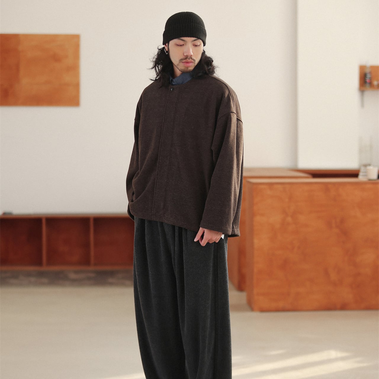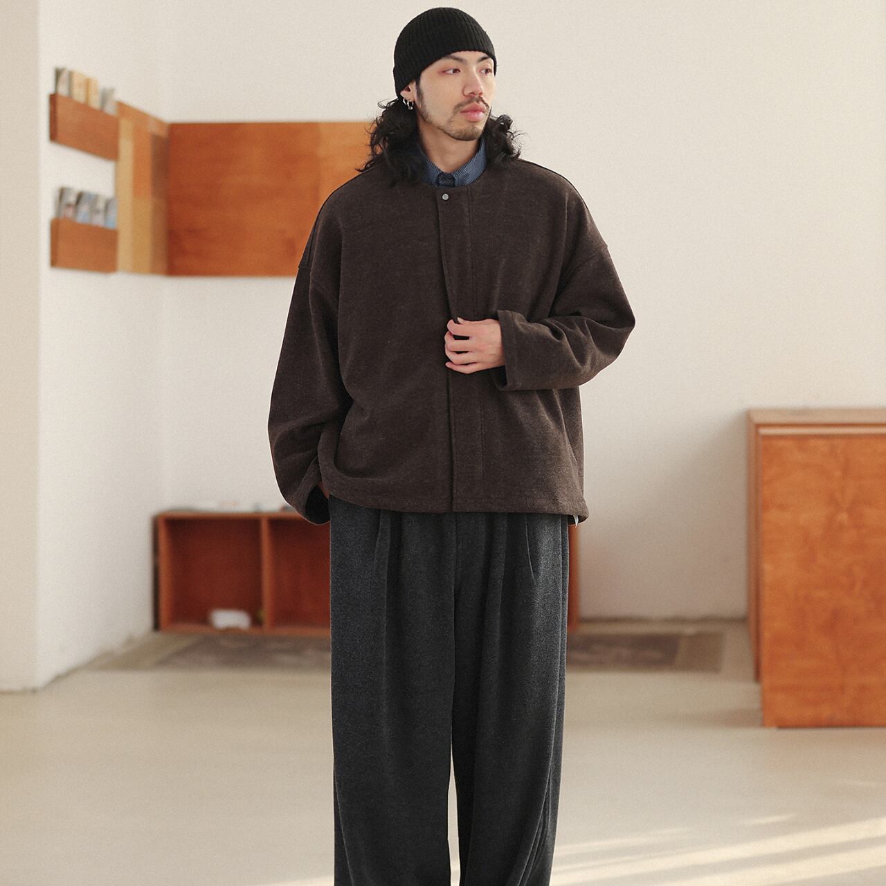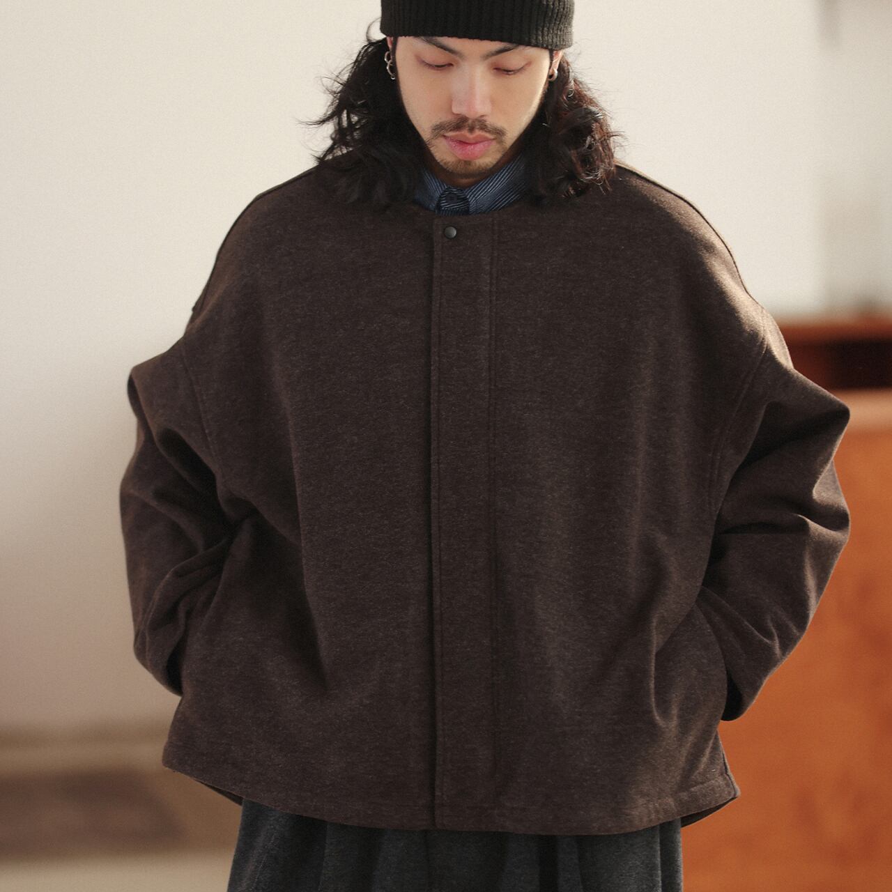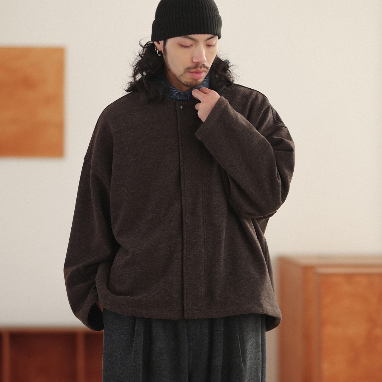 柔らかなウール調生地のノーカラーブルゾン。ややルーズなシルエットとドロップショルダーのバランスが絶妙で、インナーとのレイヤードが映える1着。首元はミニマルなノーカラーデザインで、シャツやタートルとの相性も抜群。フロントはファスナー&スナップボタンの二重構造で、着こなしの幅も広がります。奥行きのあるメランジ調ブラウンが、落ち着いた大人のストリート感を演出します。素材はしっとりとした風合いで肌当たりも柔らかく、見た目以上に軽やかな着心地。