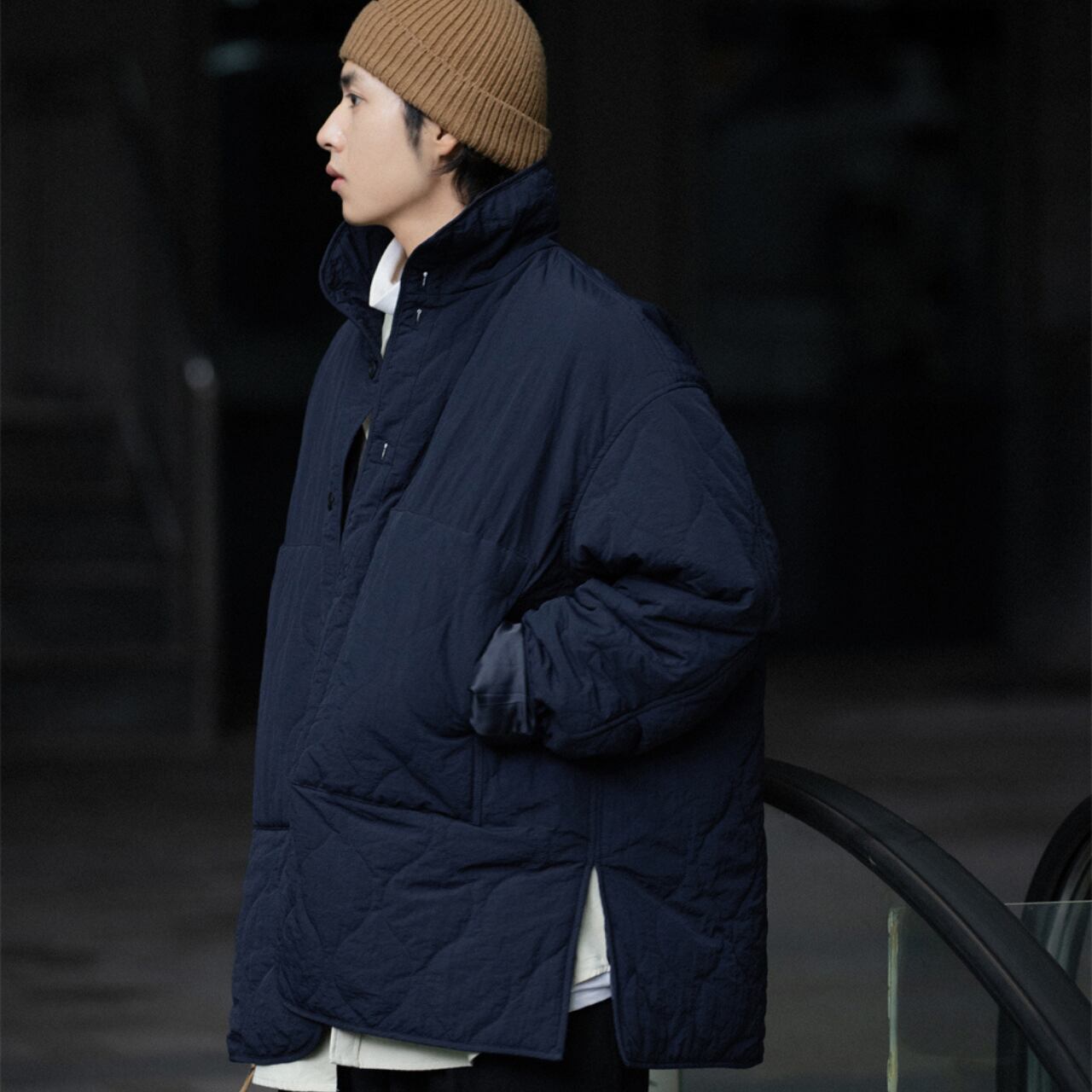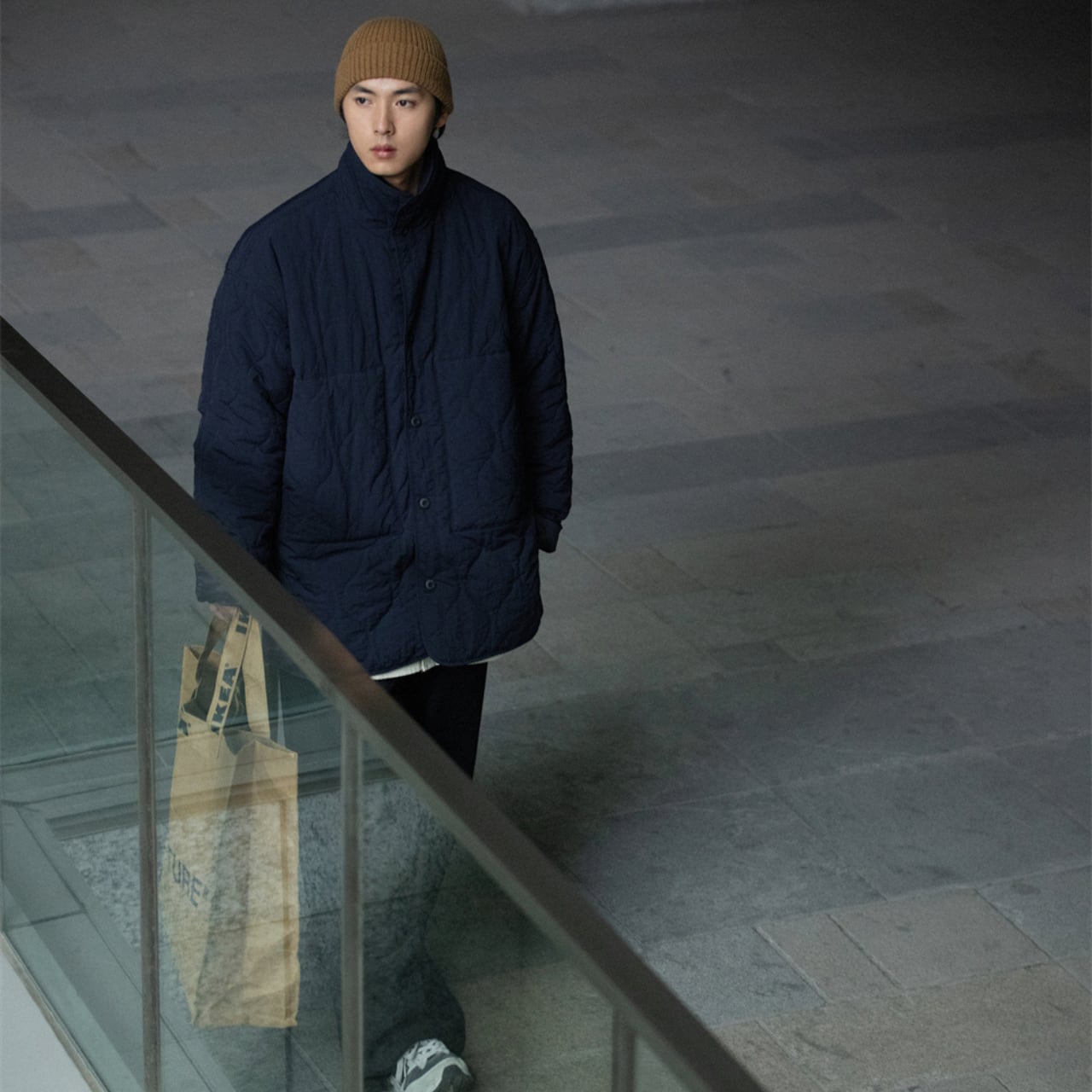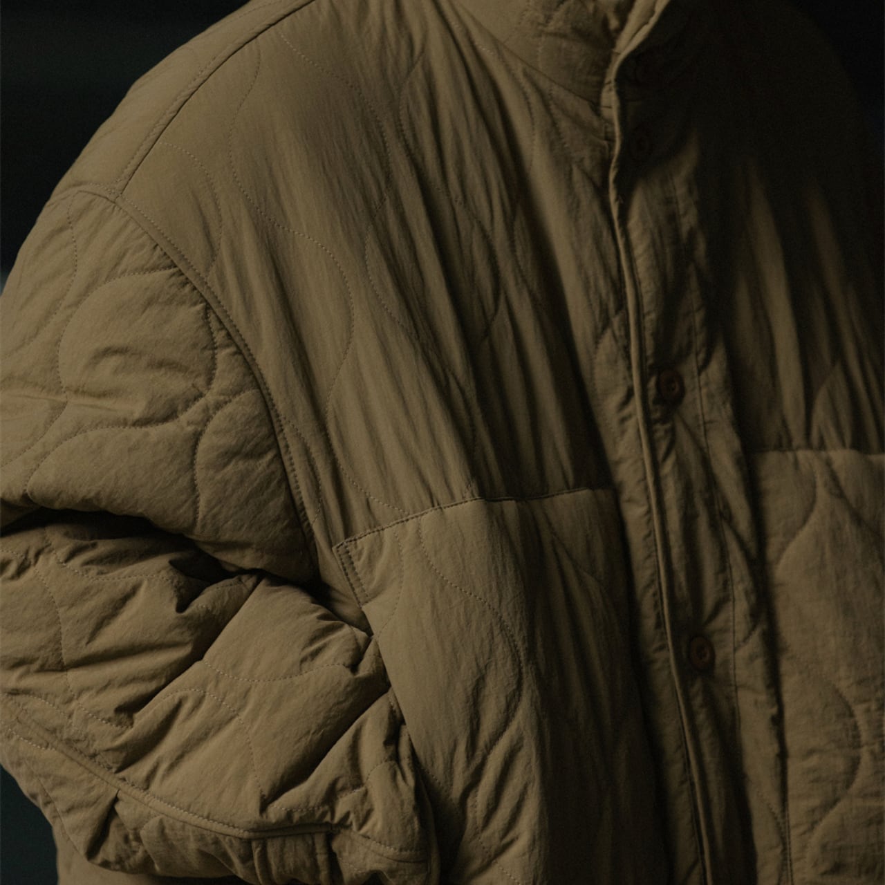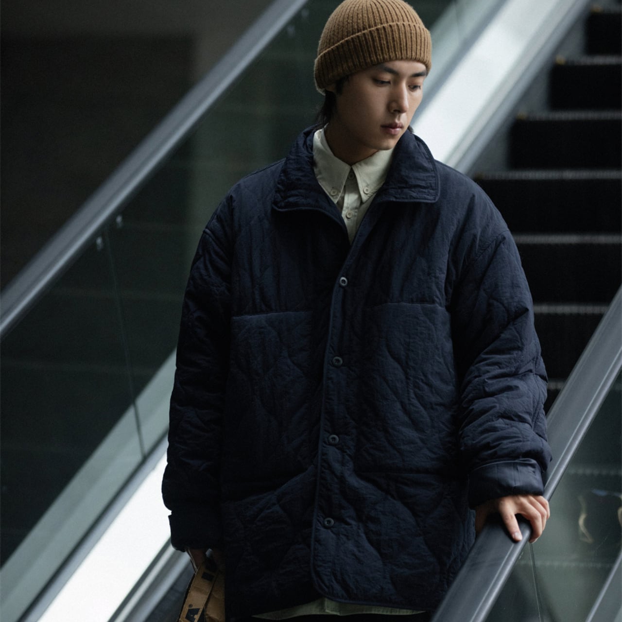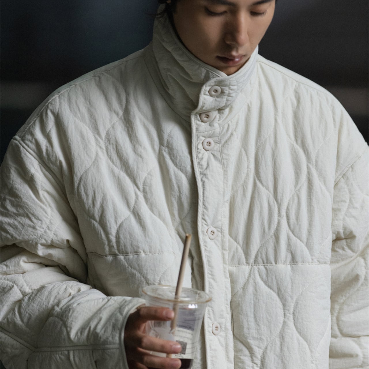 柔らかく軽いナイロン生地に、雲のような楕円ステッチを全体に施したキルティングジャケット。丸みのあるダイヤ状のパターンが立体感を演出し、ミリタリーの要素を残しつつも柔らかく洗練された印象に。襟元はスタンドにもなる2WAY仕様で、防風性とデザイン性を両立。身幅を大きくとったワイドなシルエットは、厚手のスウェットやニットとのレイヤードにも対応し、男女問わずユニセックスで楽しめます。ボタンやポケット配置にも無骨さと実用性があり、静かな存在感を放つアウターです。