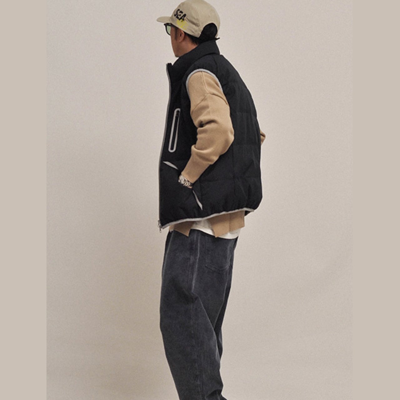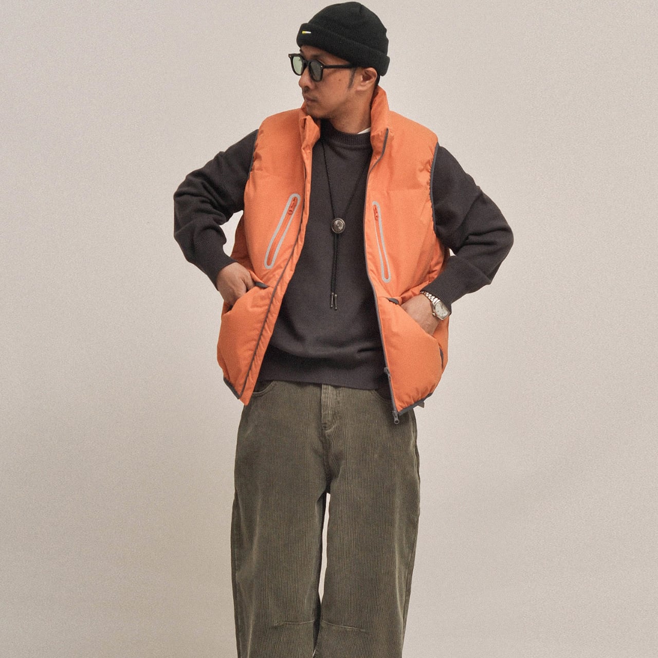機能性とデザイン性を融合させた、ダウンベスト。90%のホワイトダックダウンを贅沢に使用しながらも、軽量で動きやすい仕上がり。都会的なミニマルルックに映えるネオンジップデザインがアクセント。フロントには4つのジップポケットを配置し、実用性も◎。クルーニットやスウェットとのレイヤードが映えるシルエットで、寒暖差のある秋冬のアクティブシーンにぴったりです。ミリタリーテイストなカラー展開も魅力。