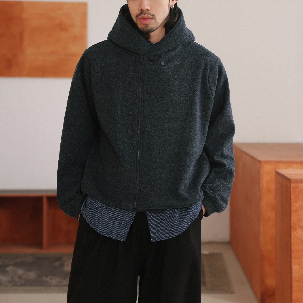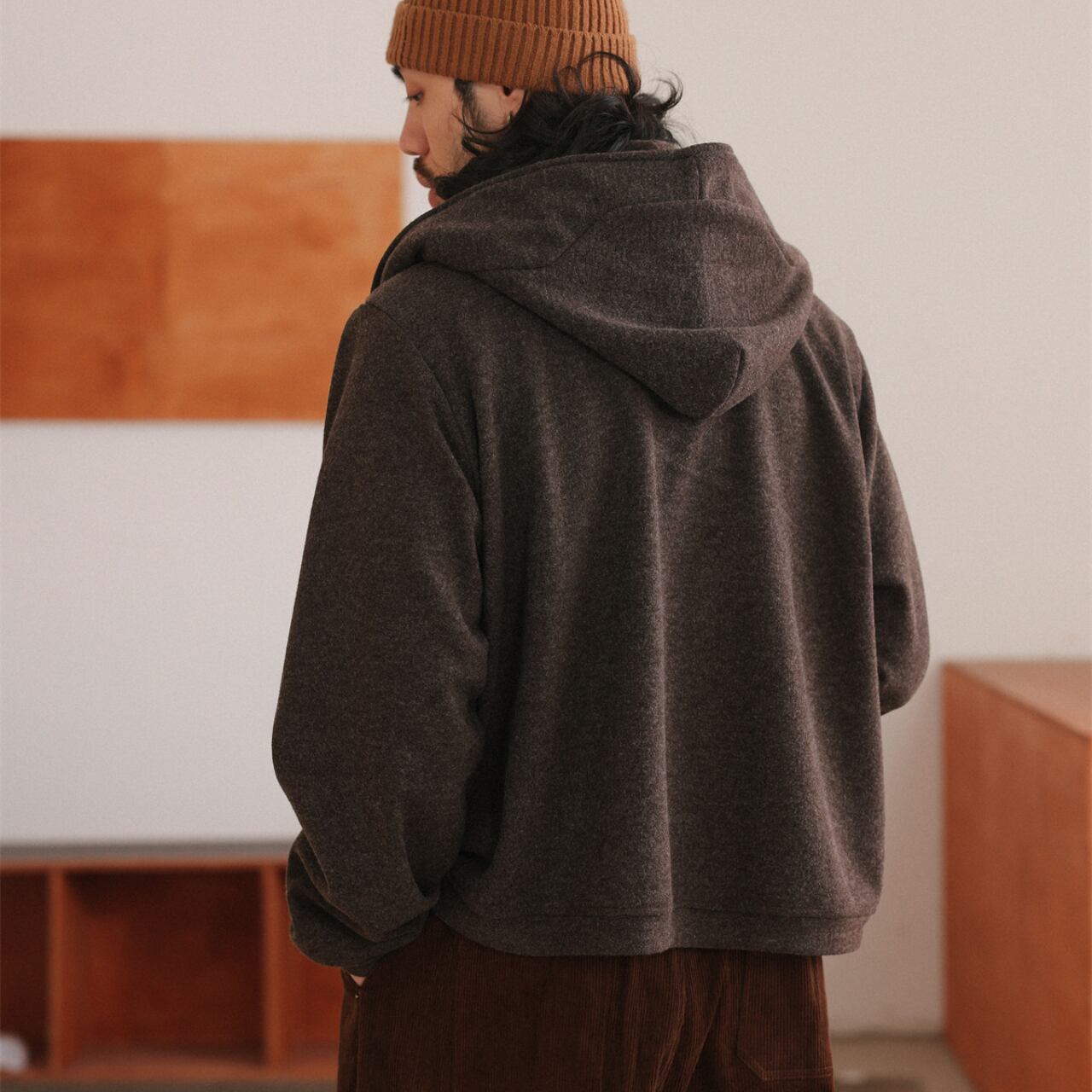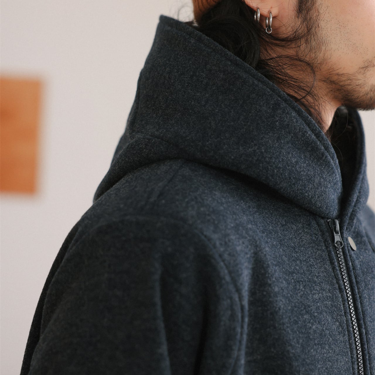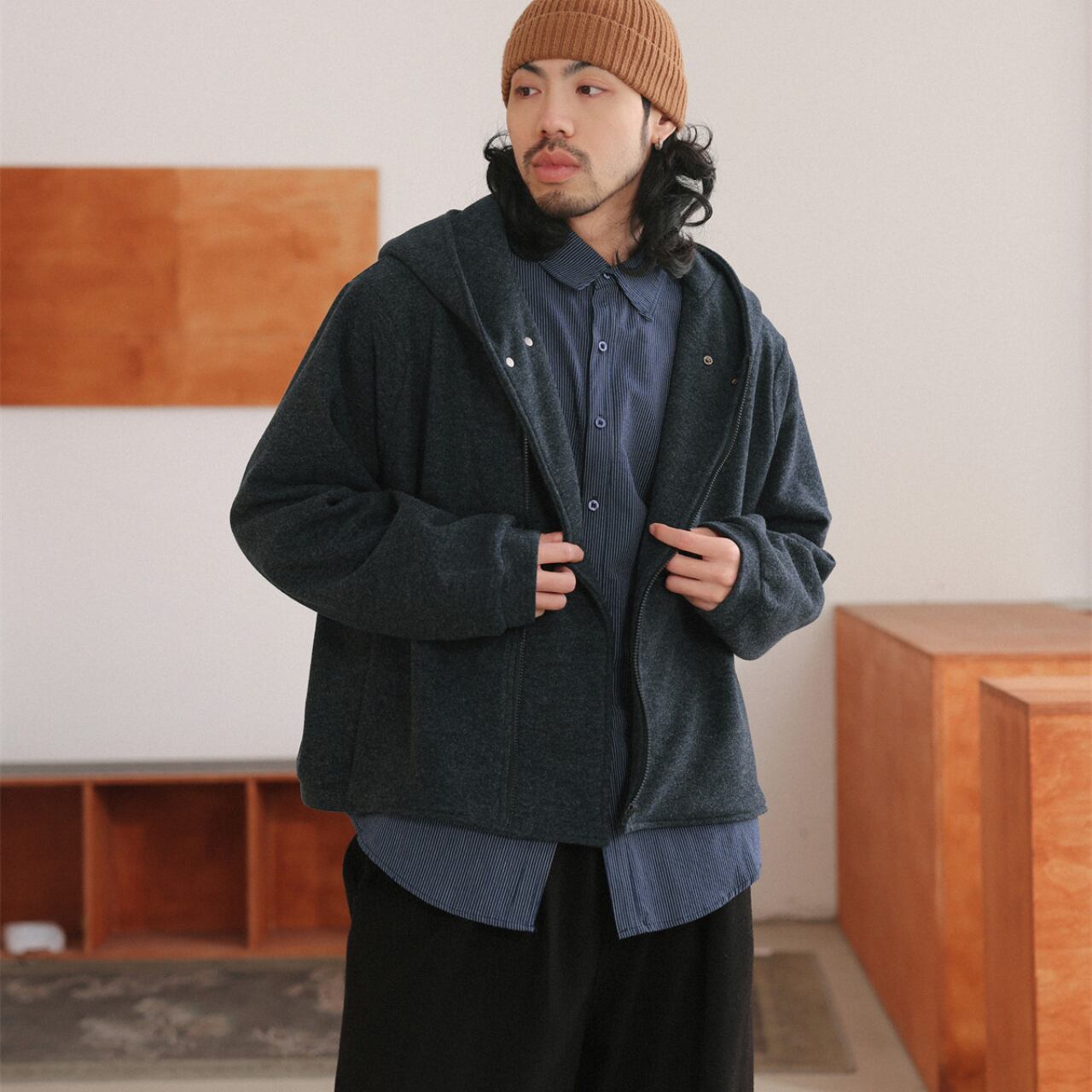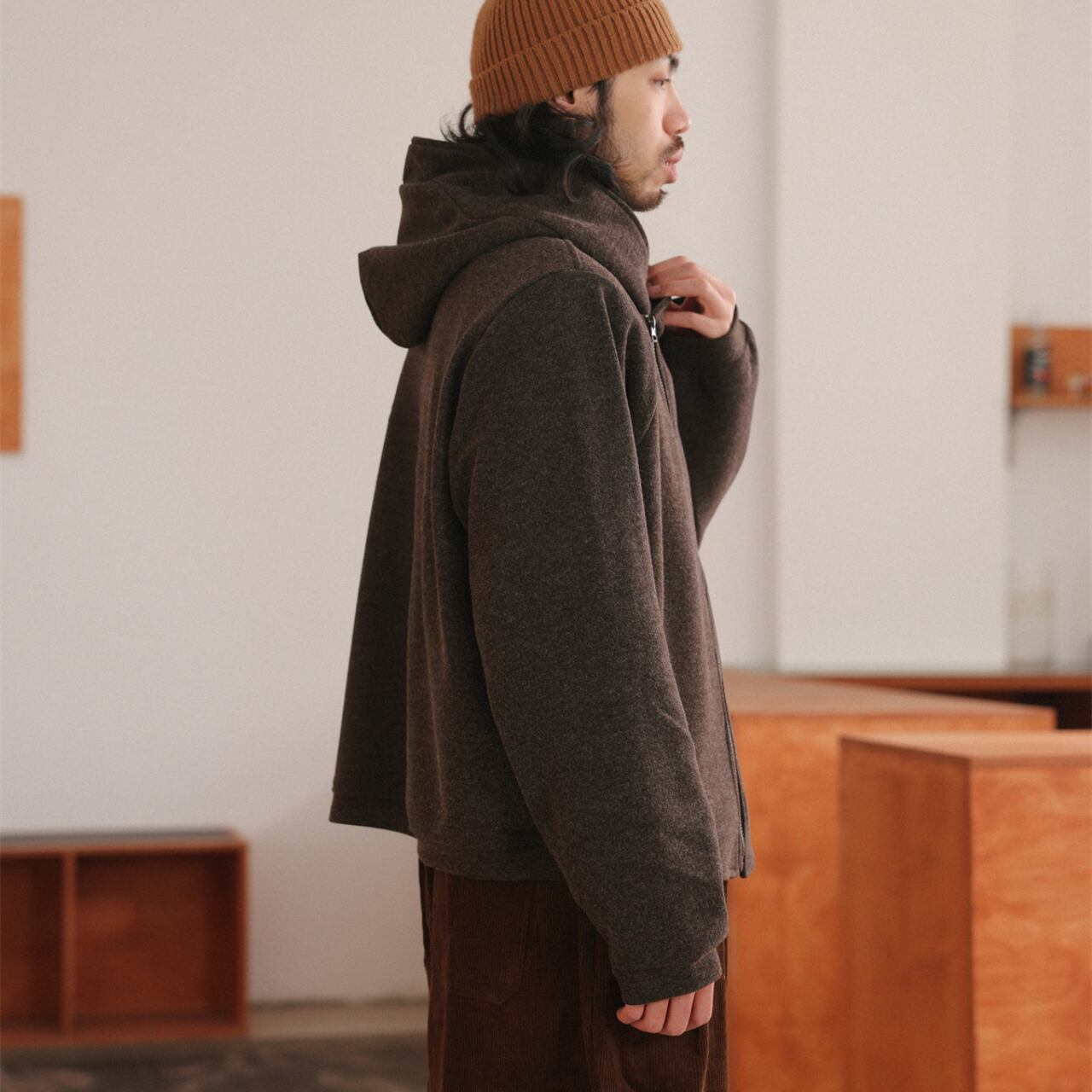 立体感のあるメランジ調の起毛素材を使用した、アシンメトリーファスナーが印象的なソフトフーディジャケット。丸みのあるフード、ドロップショルダー、短めの着丈がバランス良く設計され、どの角度から見ても“抜け感”のあるシルエットに。インナーにはシャツを合わせてきちんと感を出すも良し、カットソーでリラックススタイルも◎。