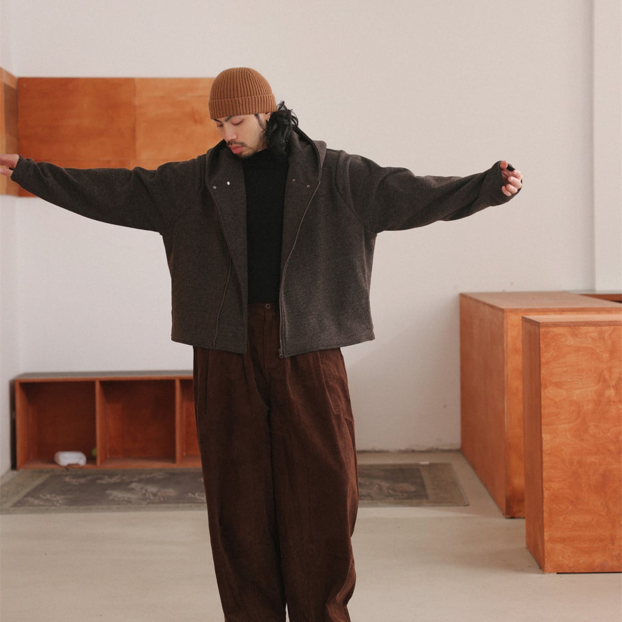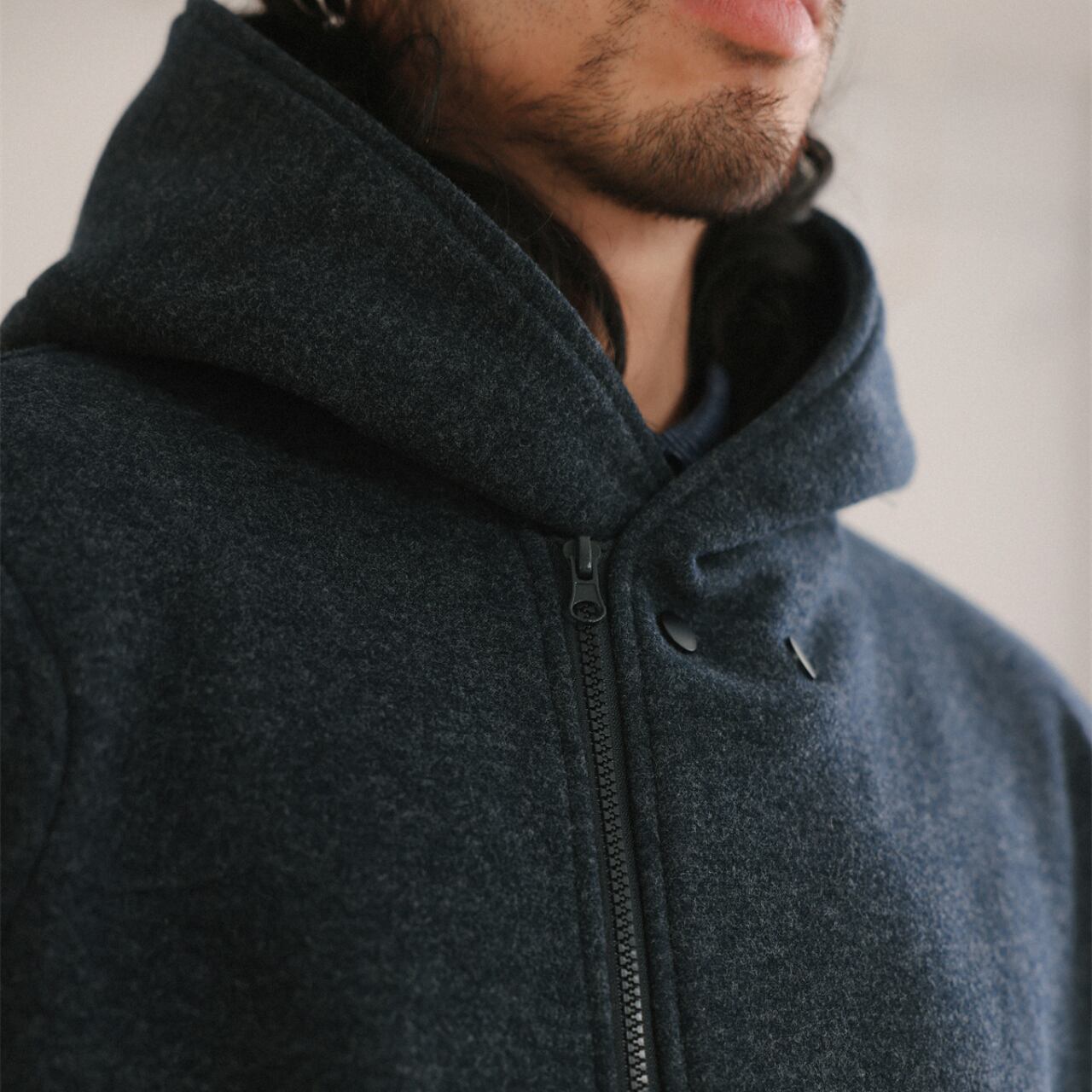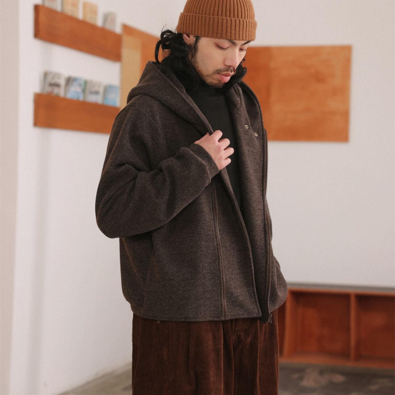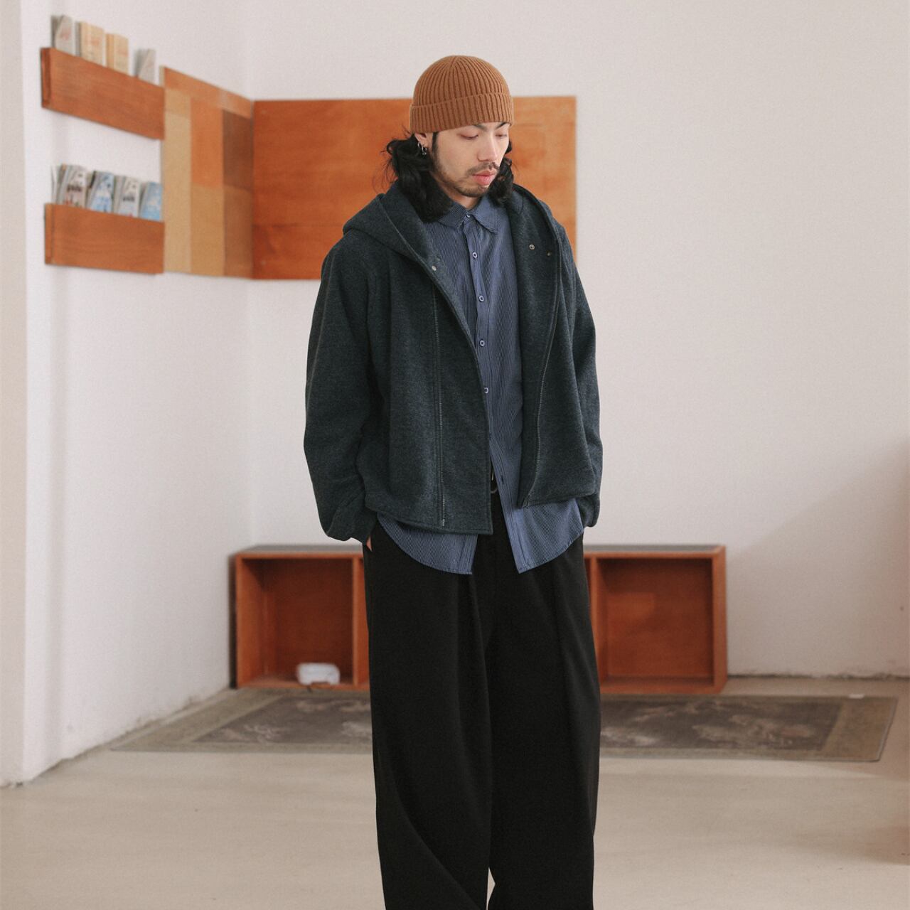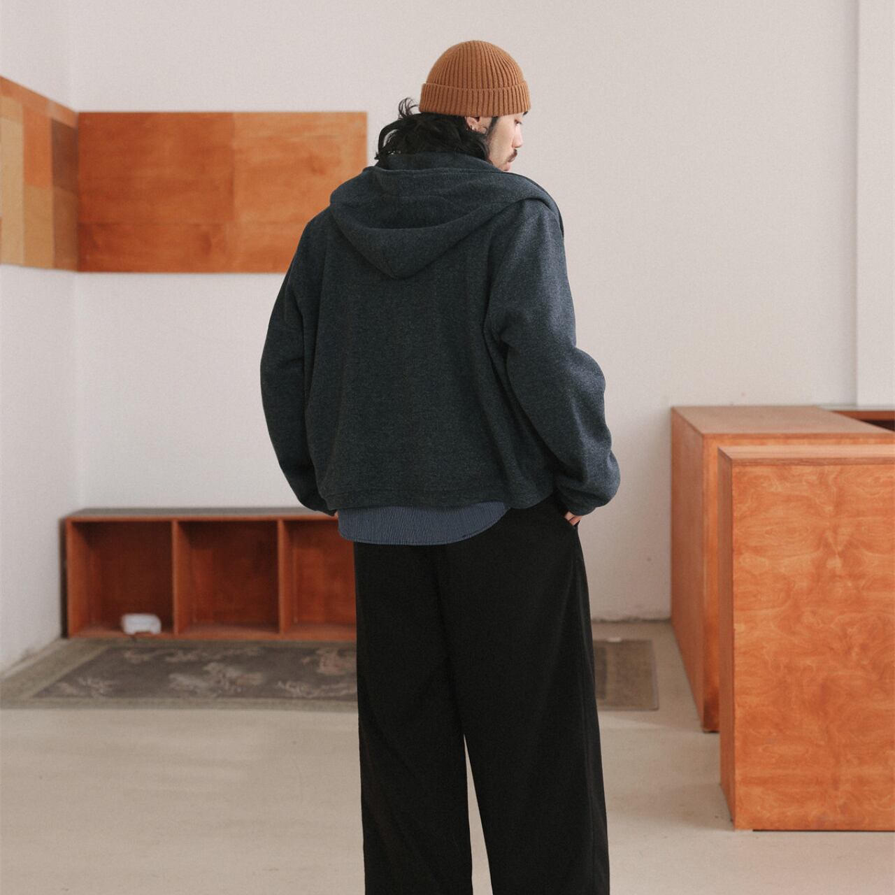 立体感のあるメランジ調の起毛素材を使用した、アシンメトリーファスナーが印象的なソフトフーディジャケット。丸みのあるフード、ドロップショルダー、短めの着丈がバランス良く設計され、どの角度から見ても“抜け感”のあるシルエットに。インナーにはシャツを合わせてきちんと感を出すも良し、カットソーでリラックススタイルも◎。