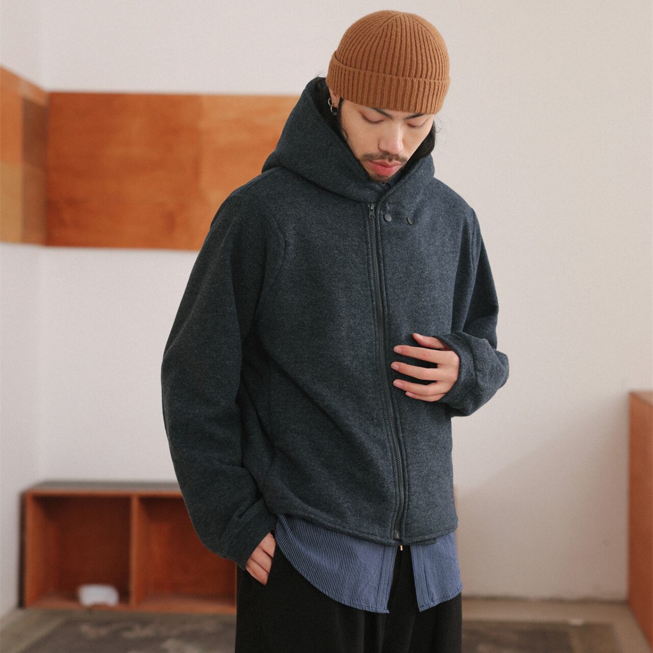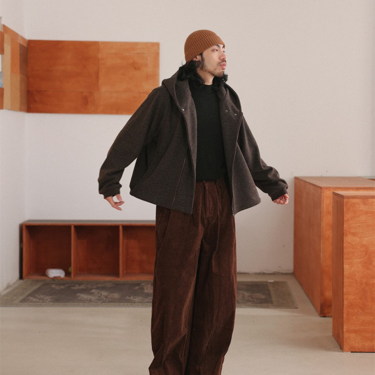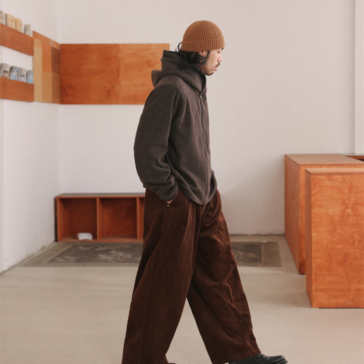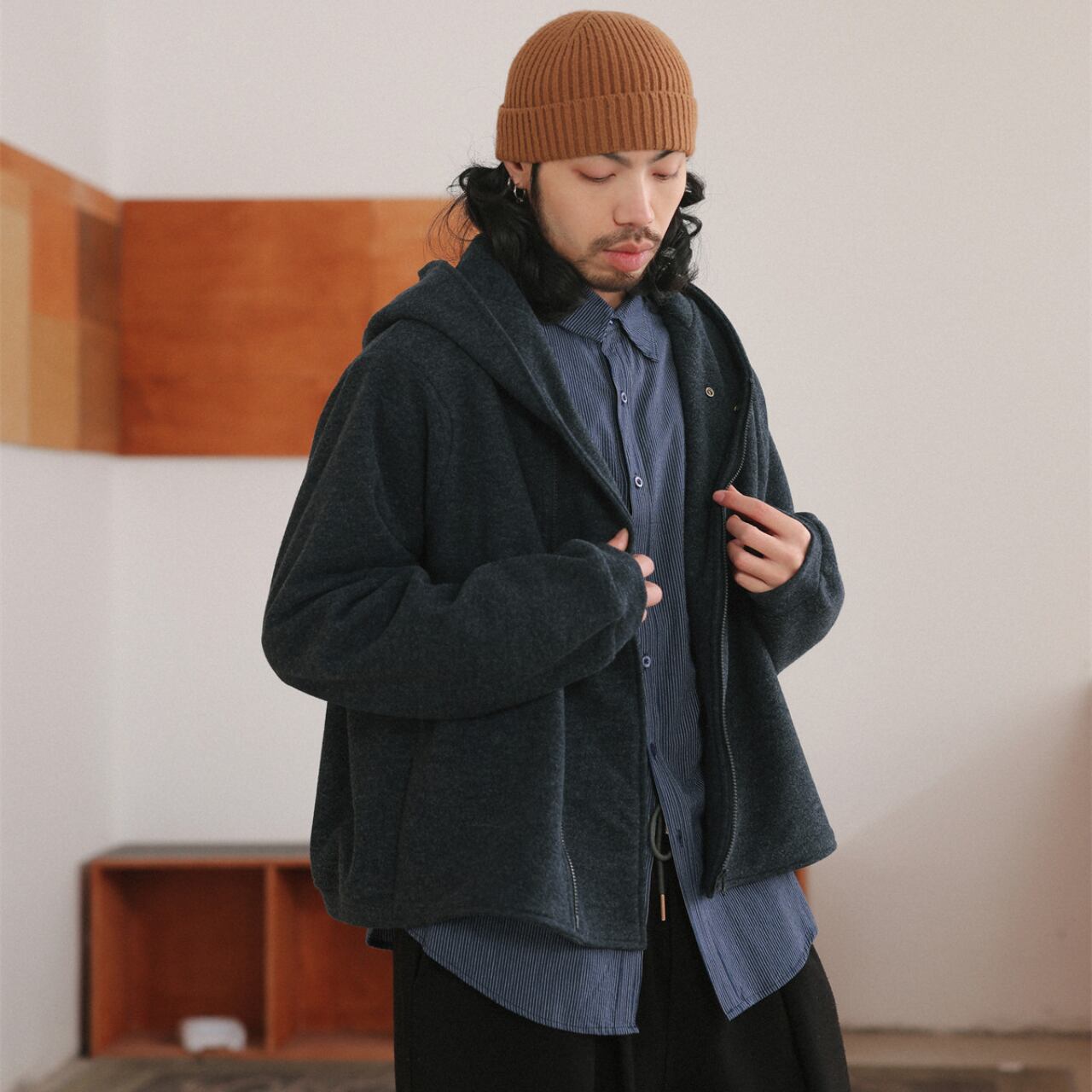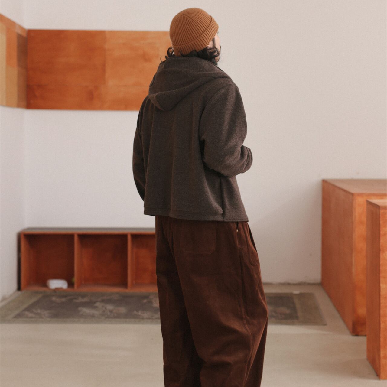 立体感のあるメランジ調の起毛素材を使用した、アシンメトリーファスナーが印象的なソフトフーディジャケット。丸みのあるフード、ドロップショルダー、短めの着丈がバランス良く設計され、どの角度から見ても“抜け感”のあるシルエットに。インナーにはシャツを合わせてきちんと感を出すも良し、カットソーでリラックススタイルも◎。