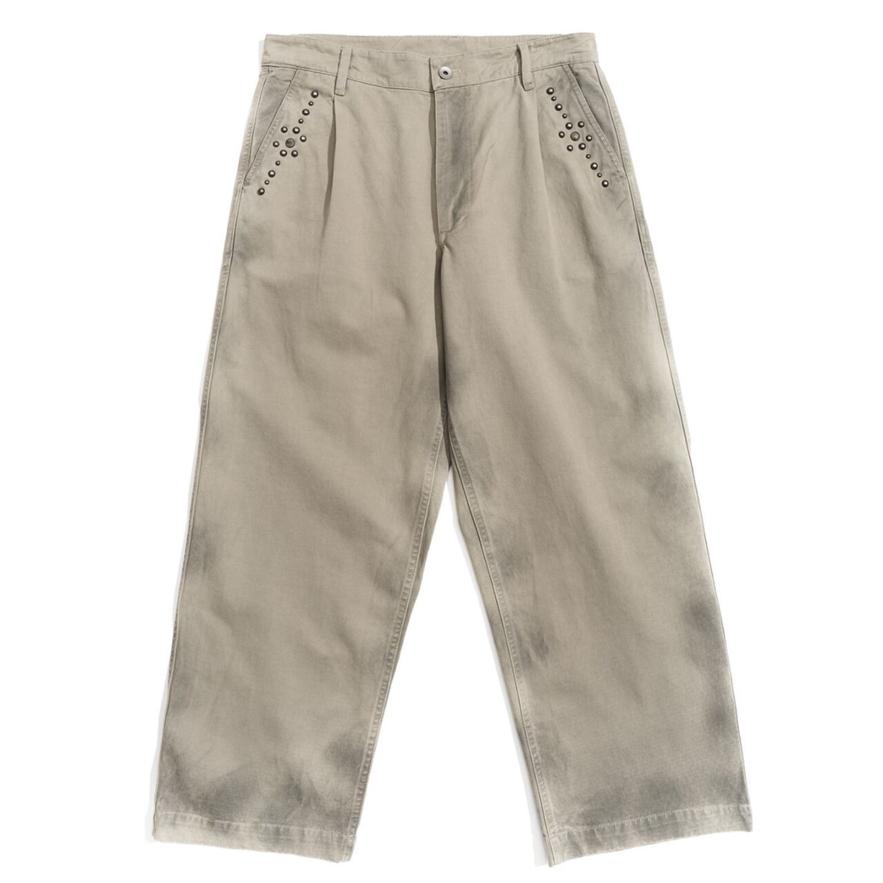 重厚な340gコットンツイルをベースに、ストーンウォッシュ加工と手作業のペイント汚し、さらに手打ちリベットで無骨に仕上げた一本。