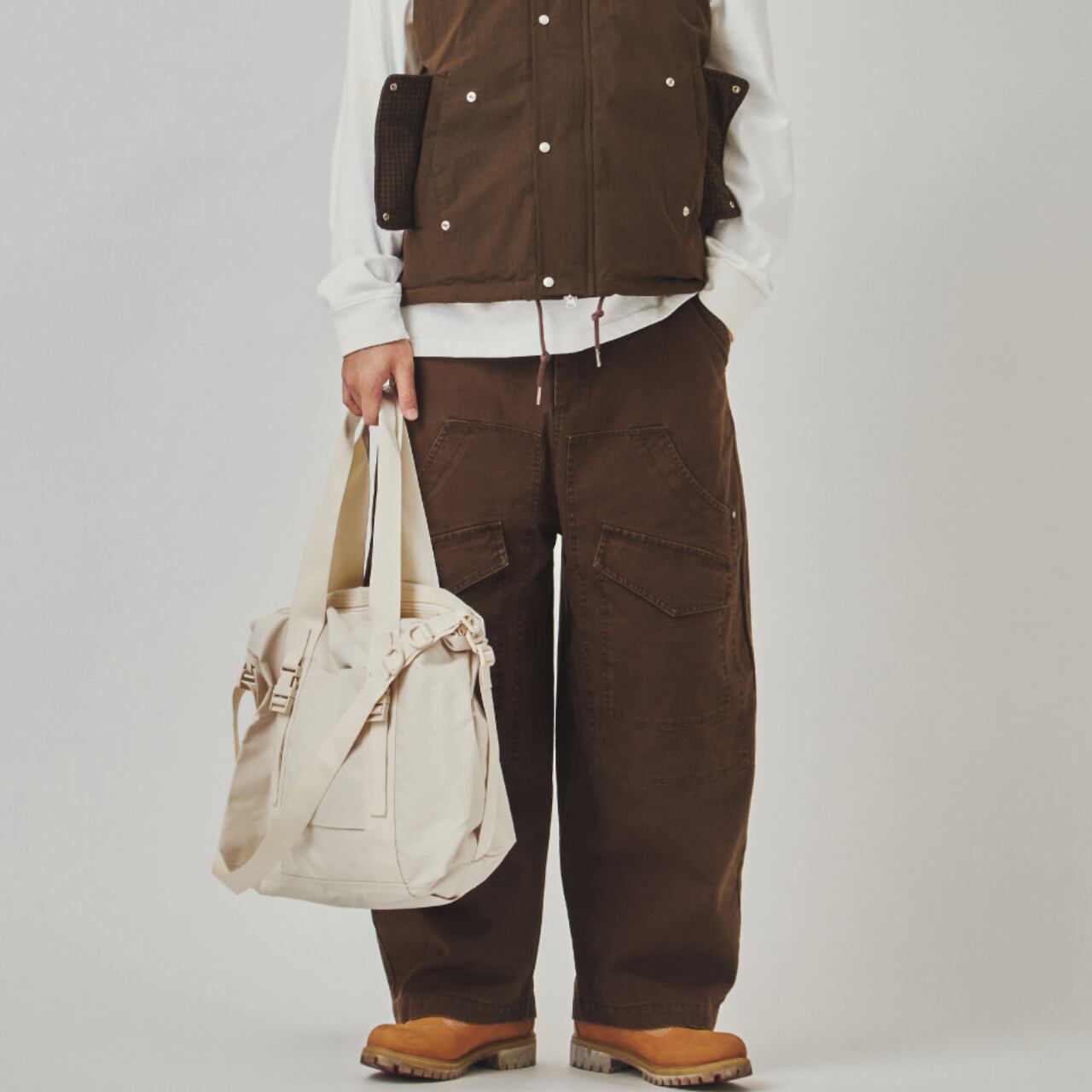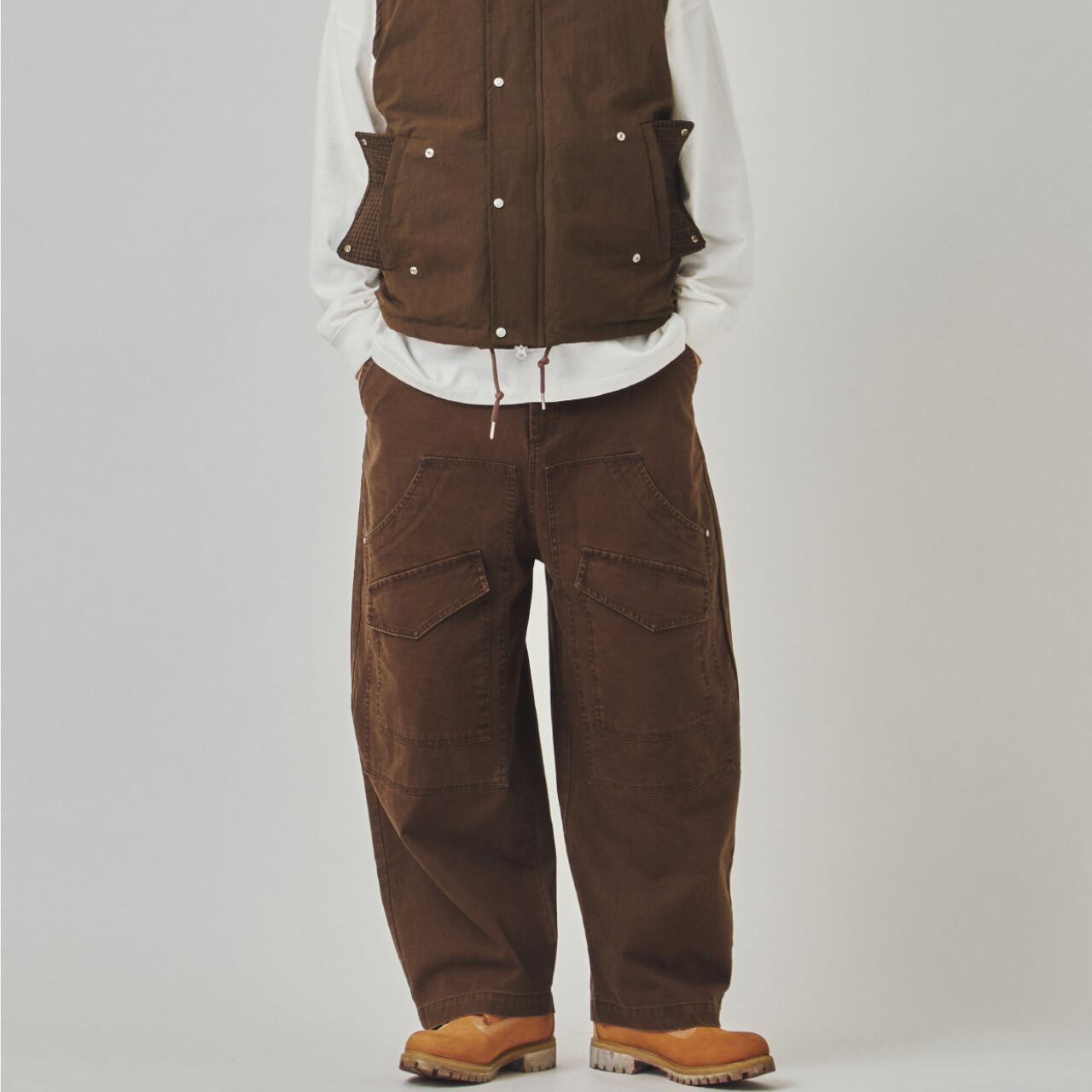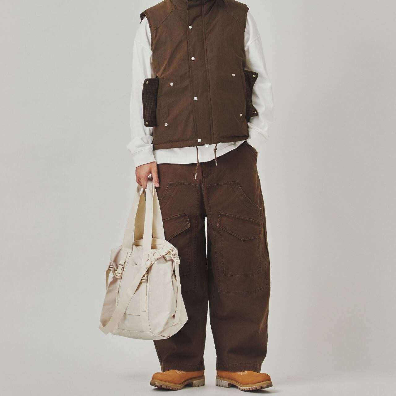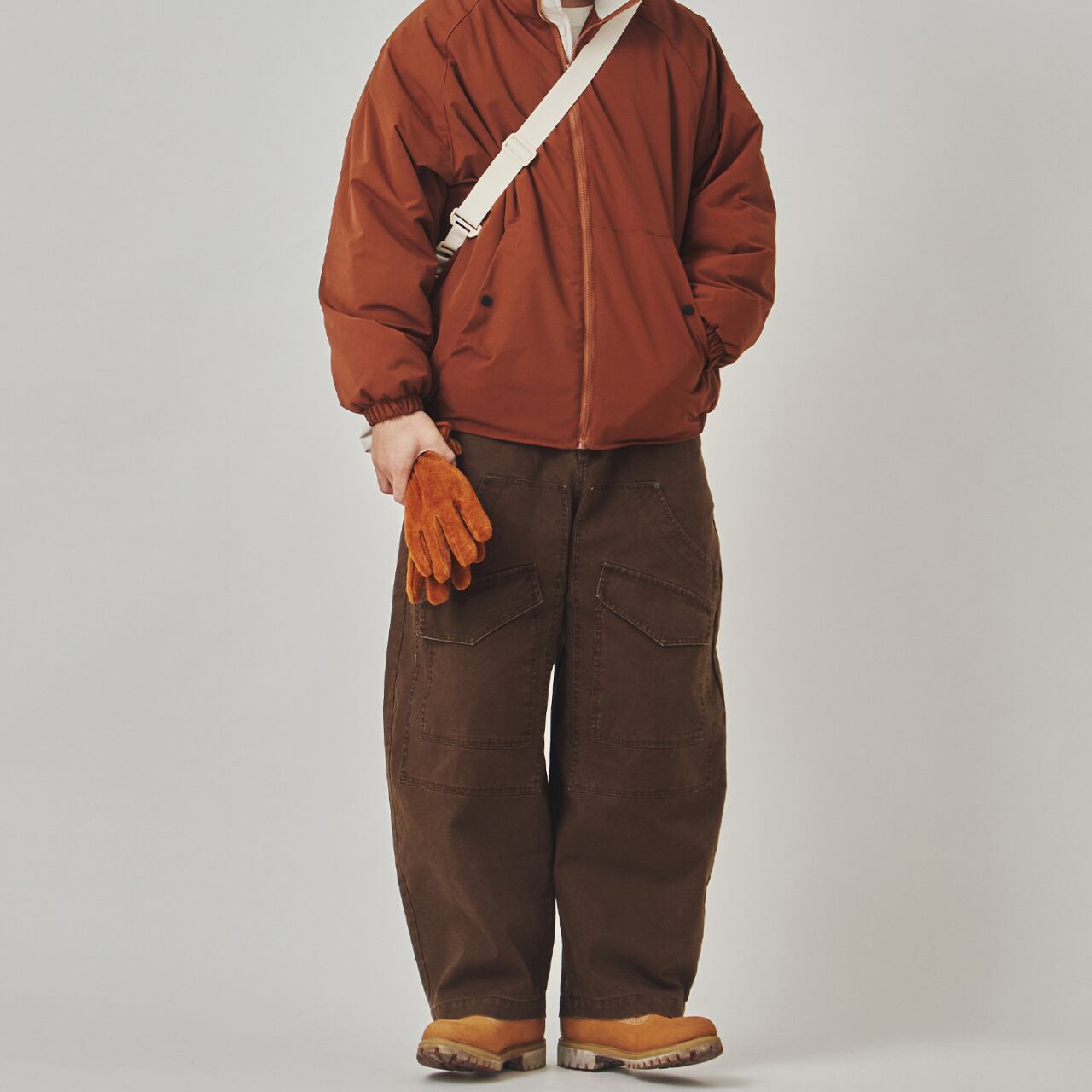 程よいヴィンテージ感のあるコットン素材を使用したワイドカーゴパンツ。大ぶりのポケットがアクセントとなり、機能的でありながら存在感のあるルックスに仕上がっています。太めのシルエットと深めの股上で、ストリート〜アウトドアまで自在にハマる一着。シンプルなトップスと合わせるだけで、今っぽいゆるめのバランスコーデが完成します。
