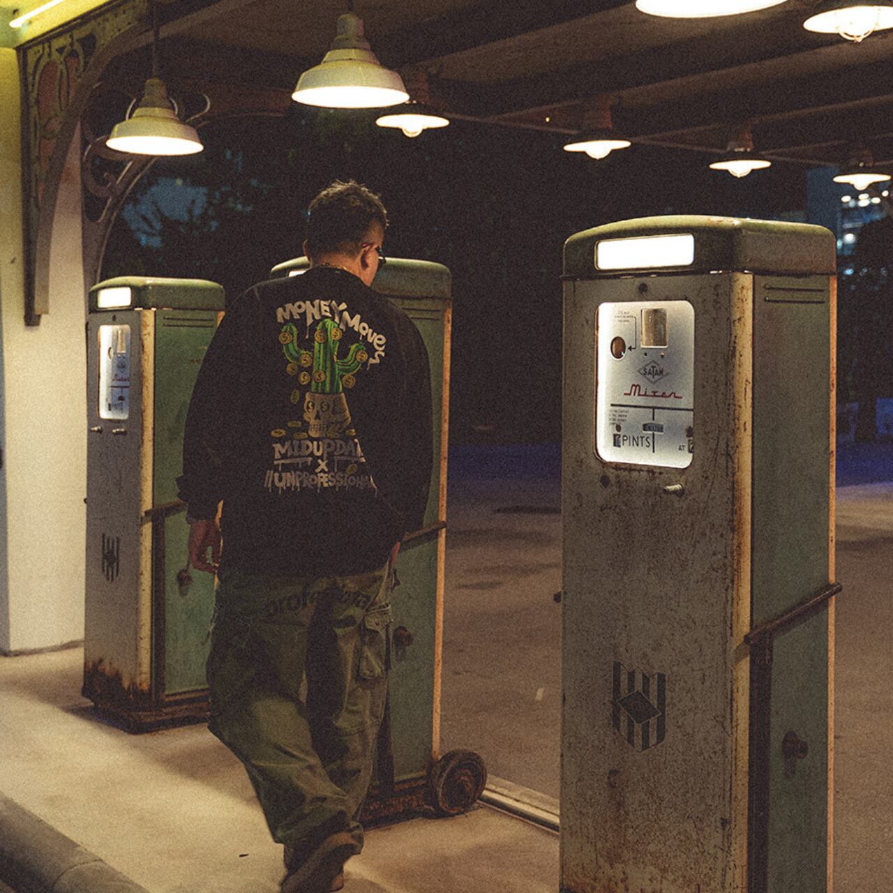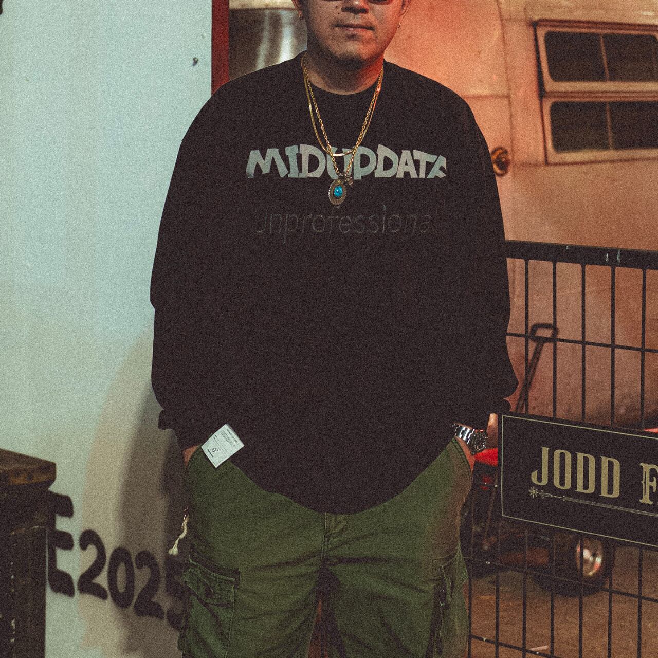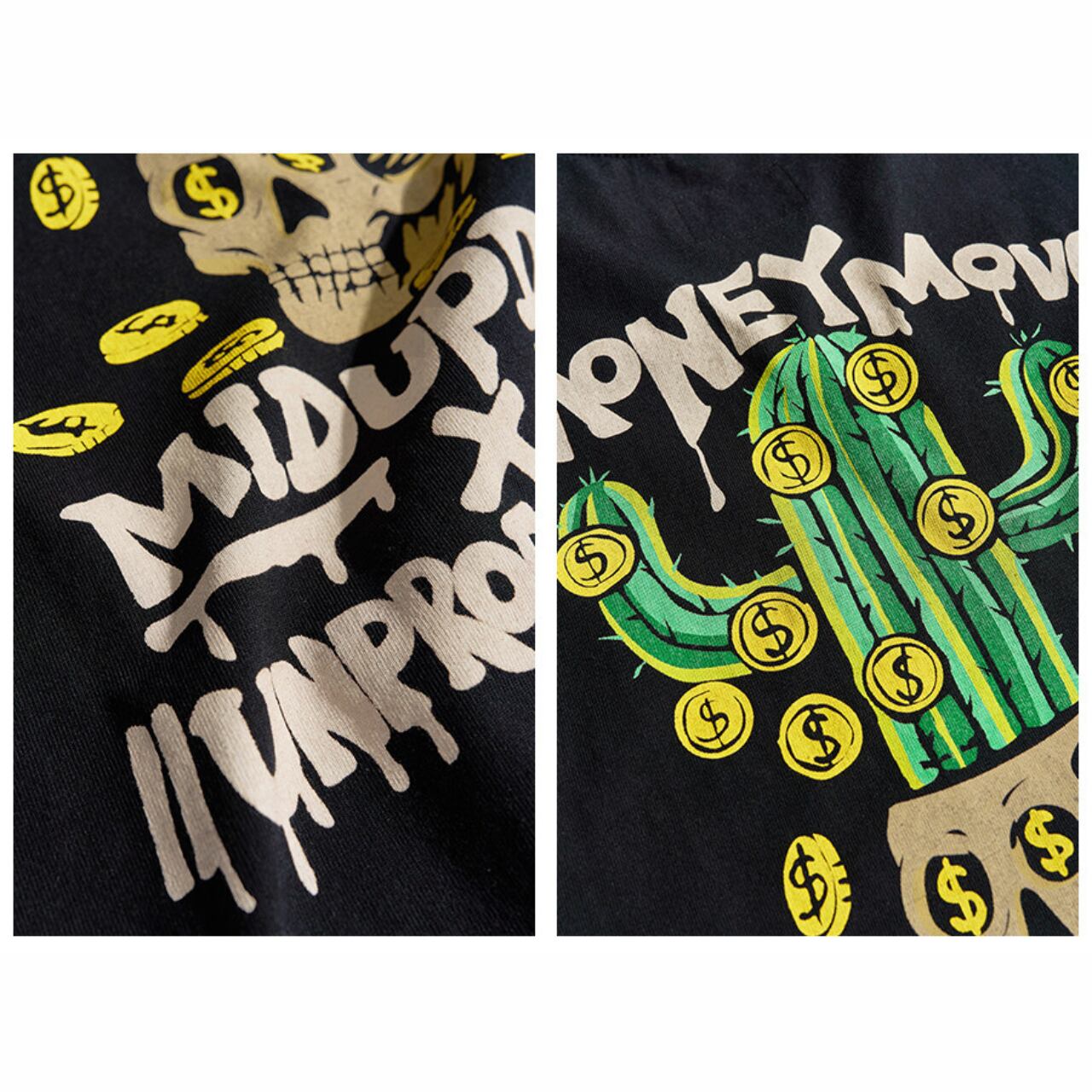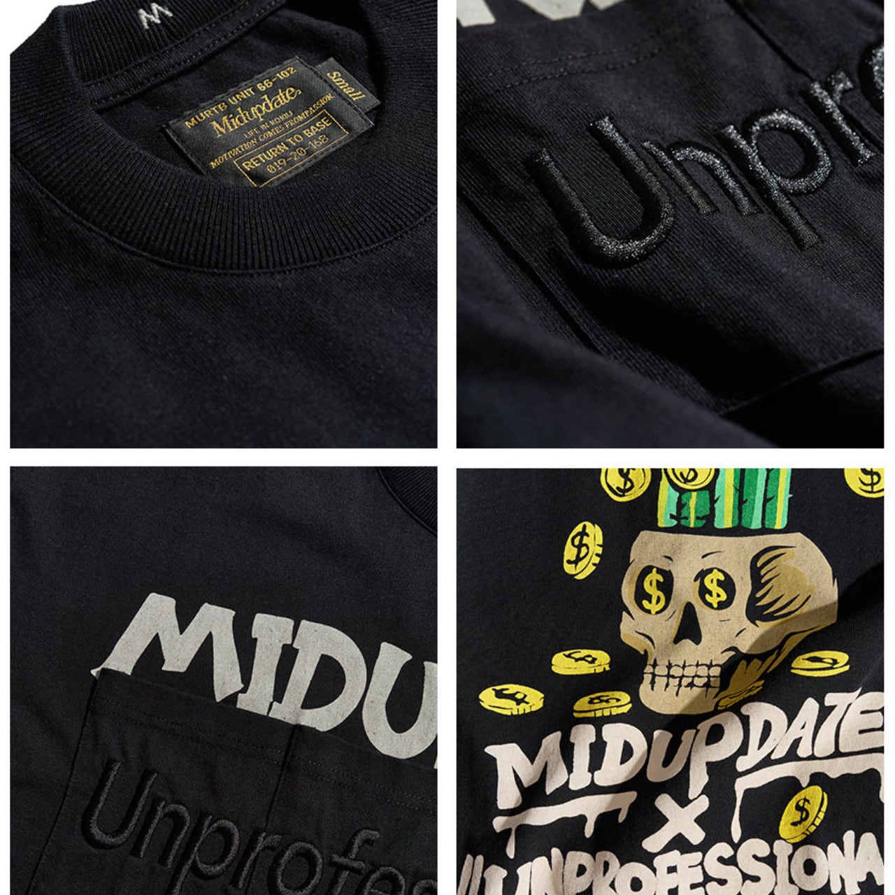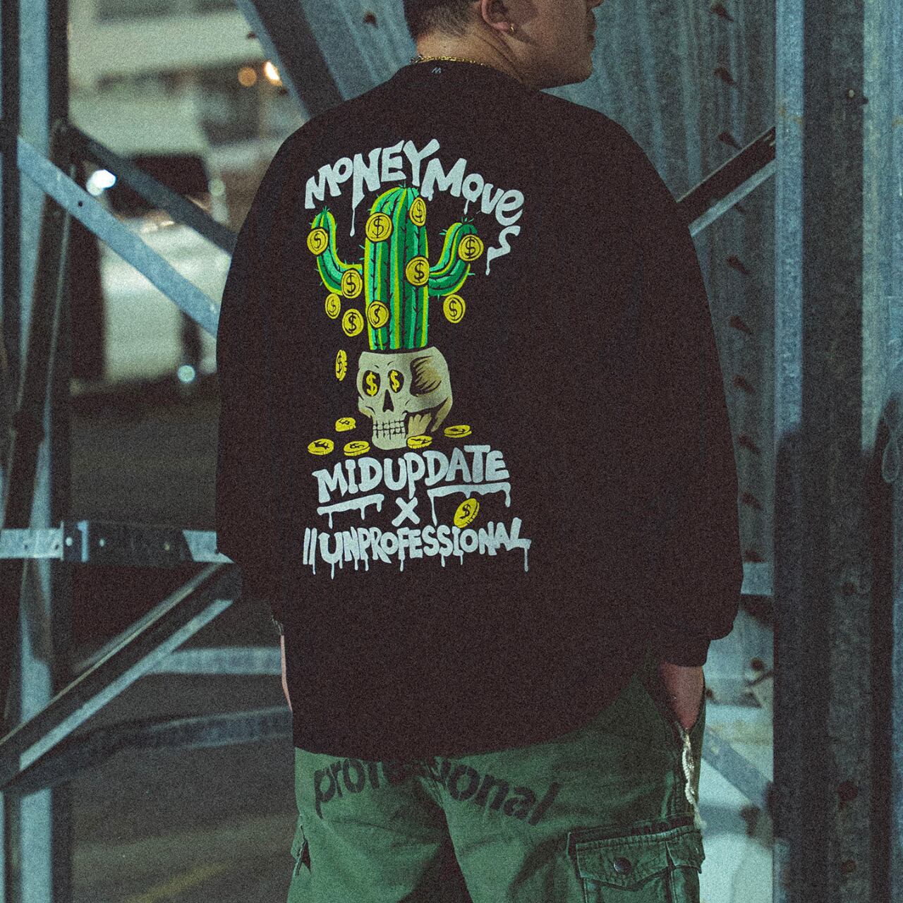 大胆なグラフィックが魅力的なロングスリーブTシャツ。フロントには「MIDUPDATE」と「Unprofessional」のロゴ、バックにはお金をテーマにしたカクタスとスカルのデザインがプリントされています。ユニークなポケットデザインと袖口に施されたディテールもポイント。ストリート感を演出しつつ、日常使いにもぴったりなアイテムです。オーバーサイズシルエットがリラックスした印象を与え、個性を引き立てます。
