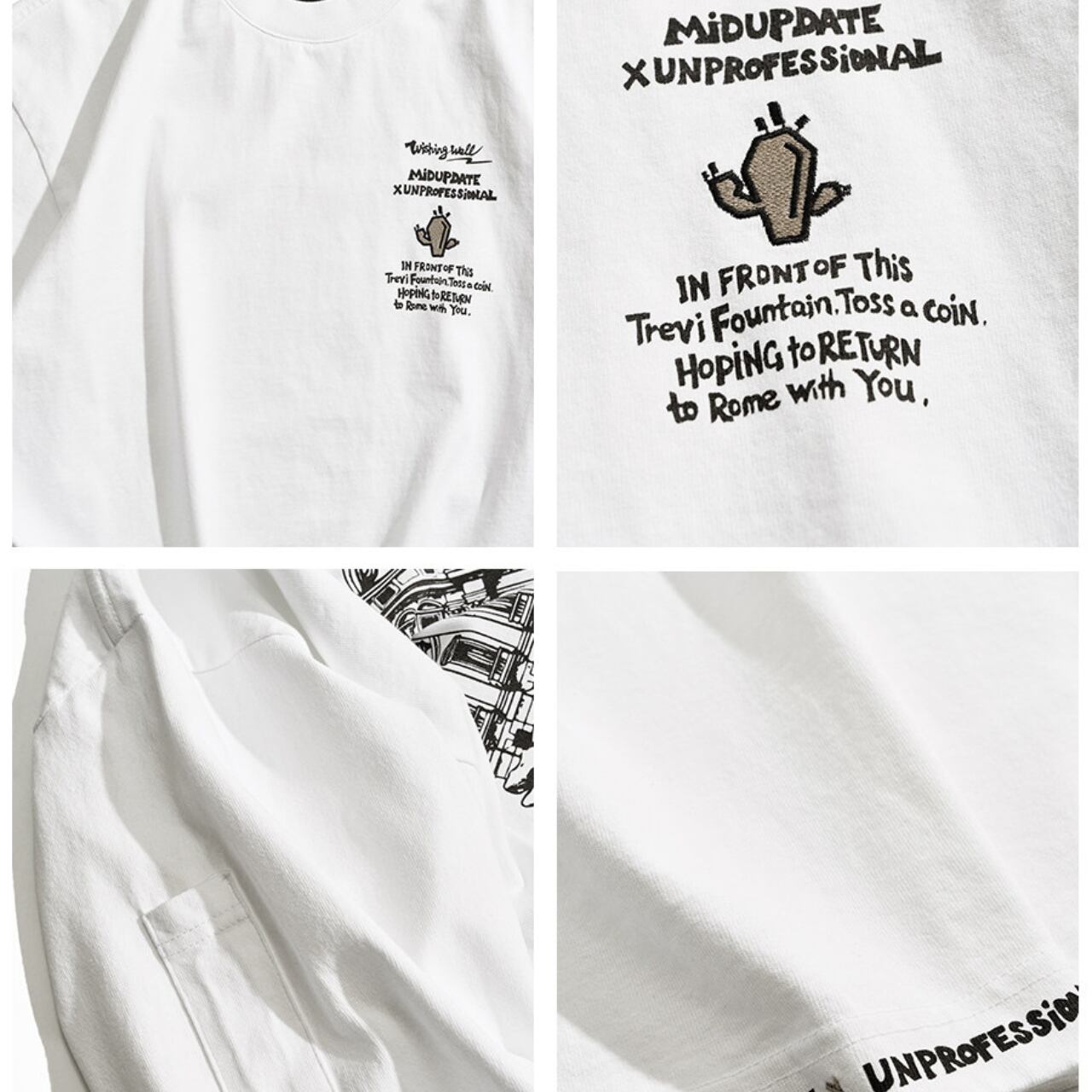 このヴィンテージ風のロングスリーブTシャツは、シンプルでありながら印象的なデザインが特徴です。前面にはカクタスモチーフと「Wishing Well」のグラフィックが施され、バックにはトレビの泉を模した大胆なアートが描かれています。コットン100%の生地は着心地も良く、デイリーユースにぴったり。スリーブの袖口にはリブ編みが施され、洗練された印象を与えます。モダンでストリート感あふれる一枚です。