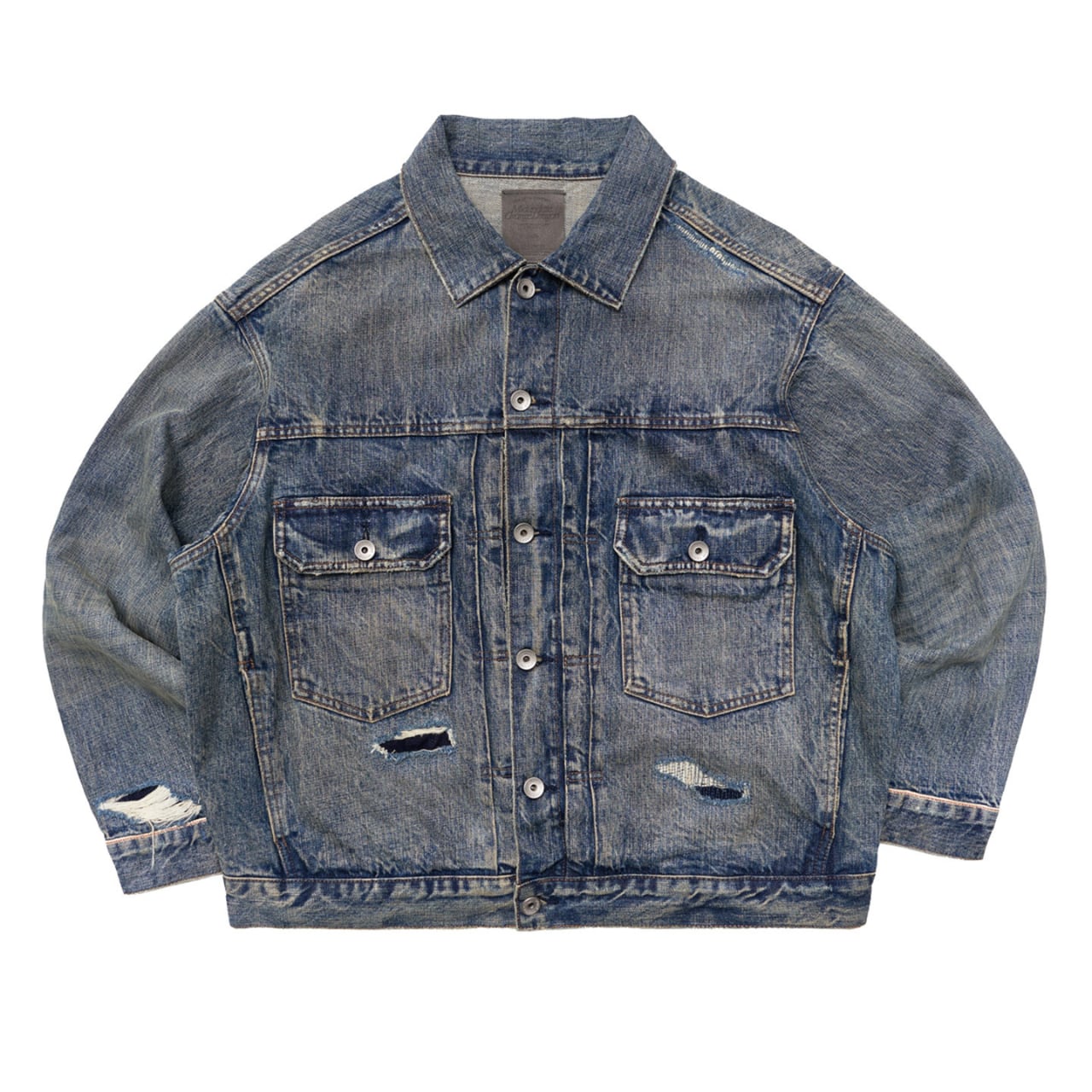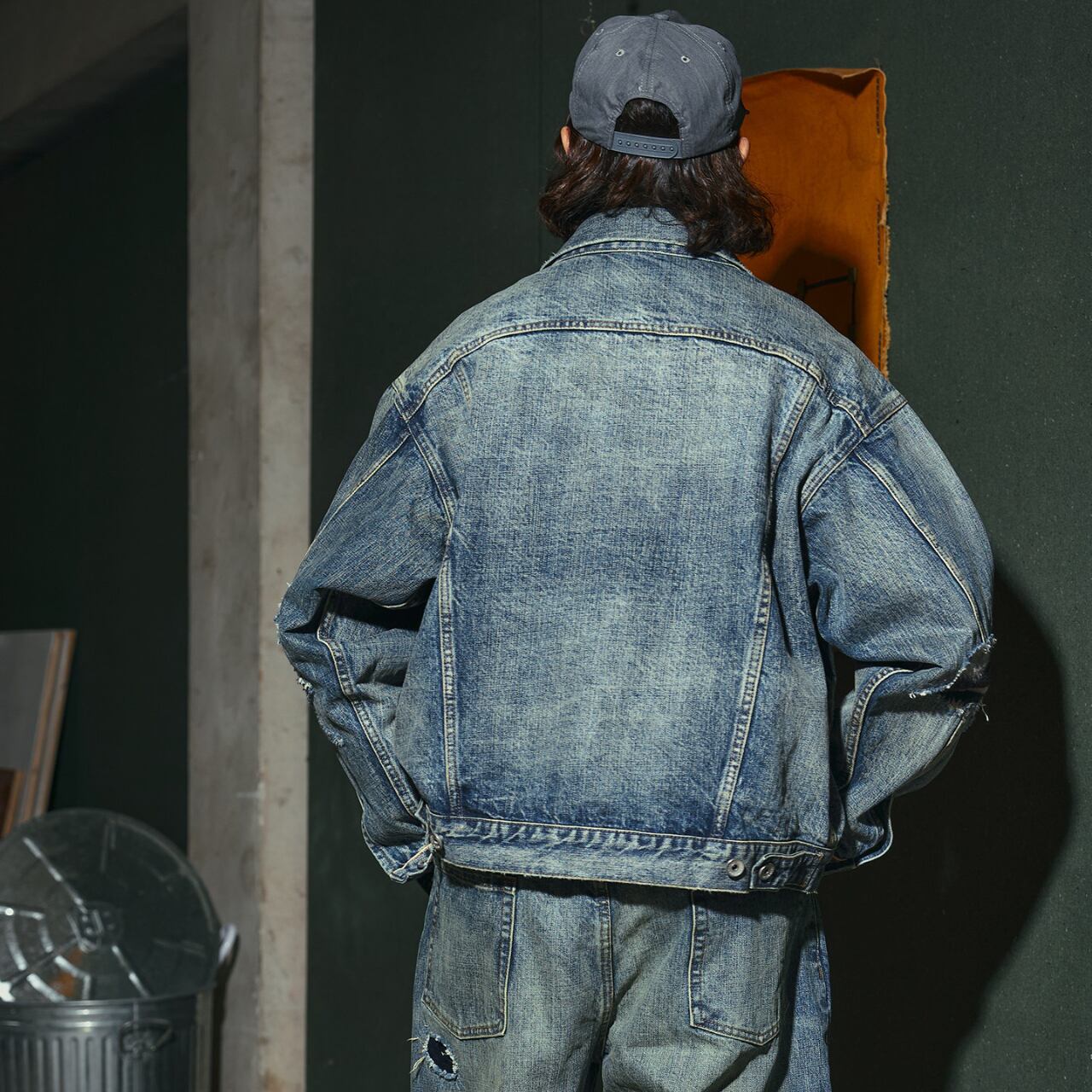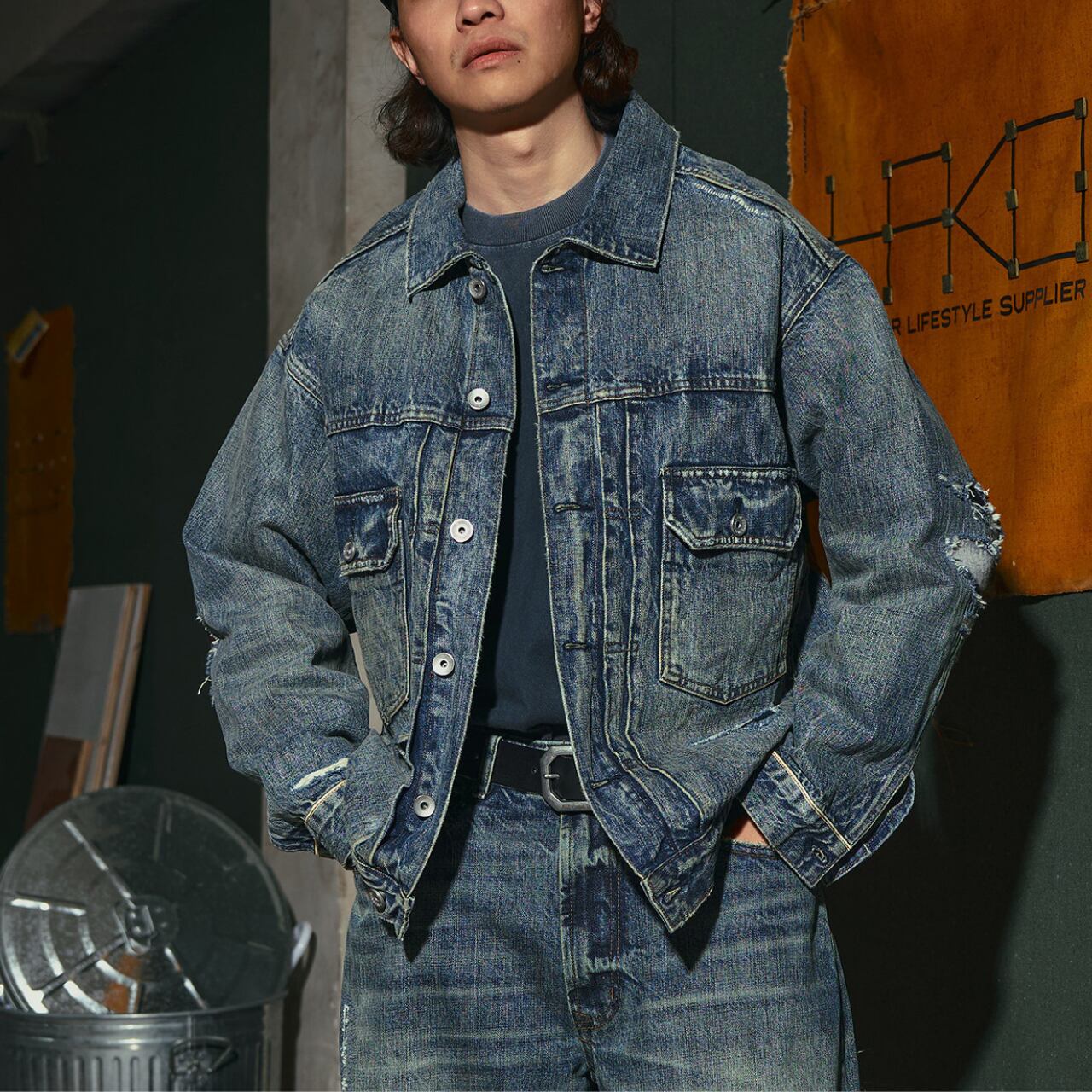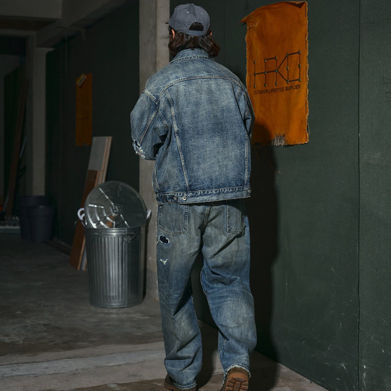 クラシックなワークデニムジャケットをベースに、ナバホ調のパッチワークと手作業によるクラッシュ加工を施した存在感のある一着。洗いをかけた15.5ozのヘビーオンスデニムにより、着込んだようなフェード感と無骨さを表現しています。随所に配された補丁やダメージが一点物のような表情を生み、シンプルなカットソーやスウェットに羽織るだけでスタイリングが完成。デニムオンデニムやワークパンツとの相性も抜群です。