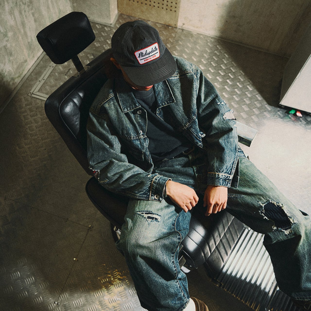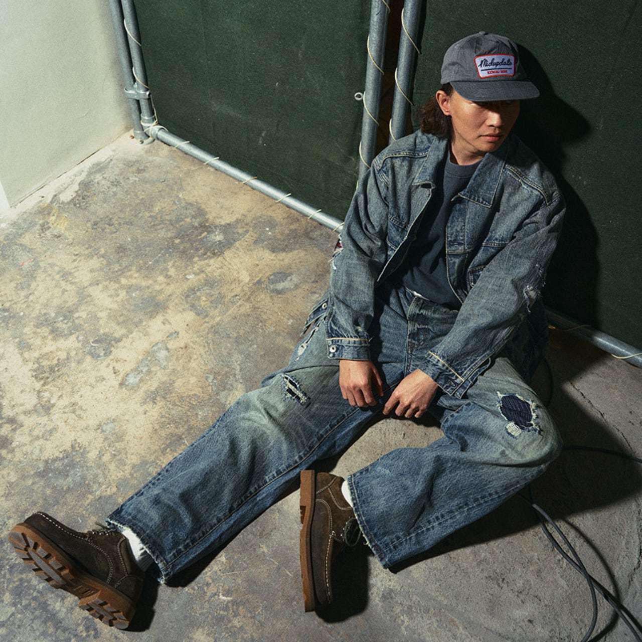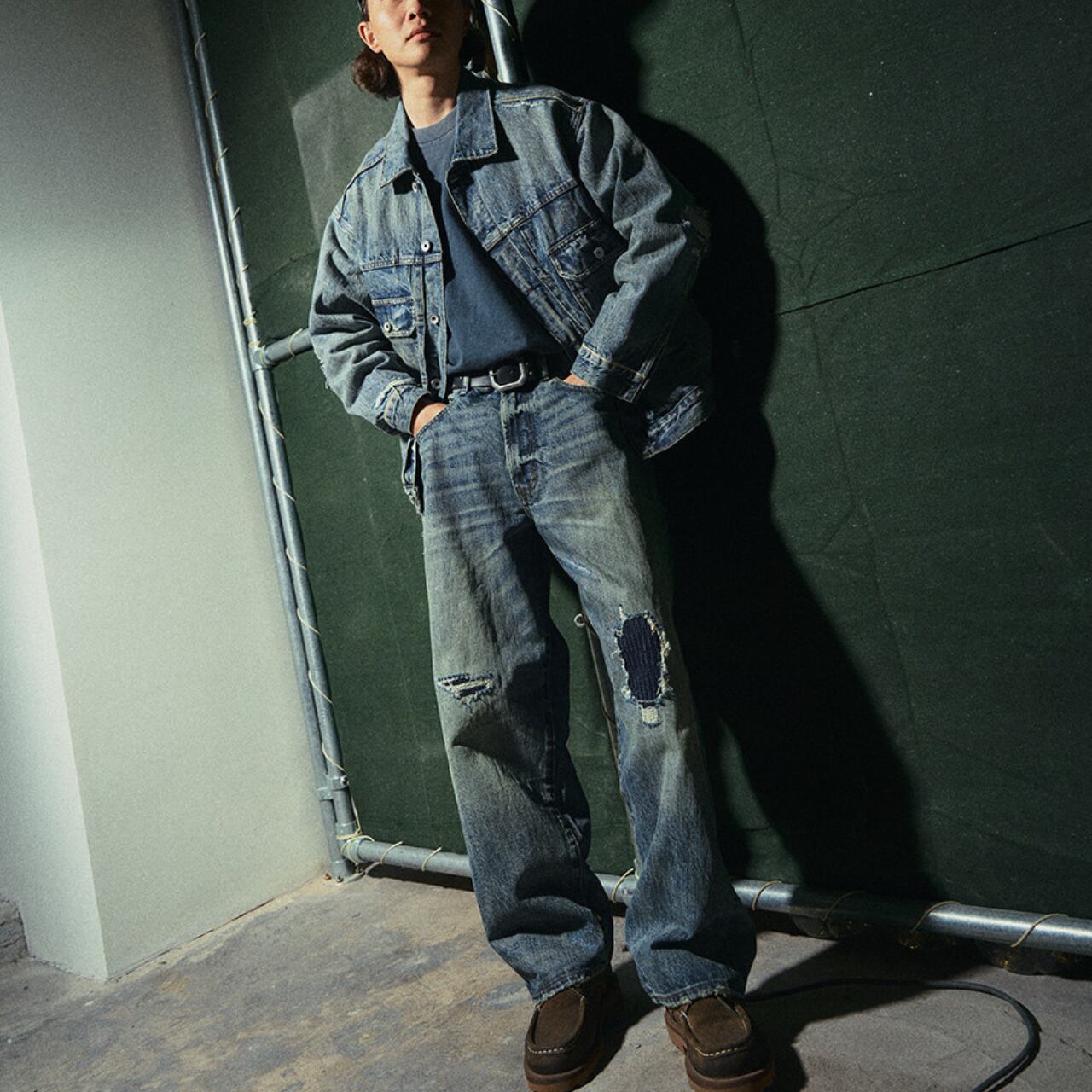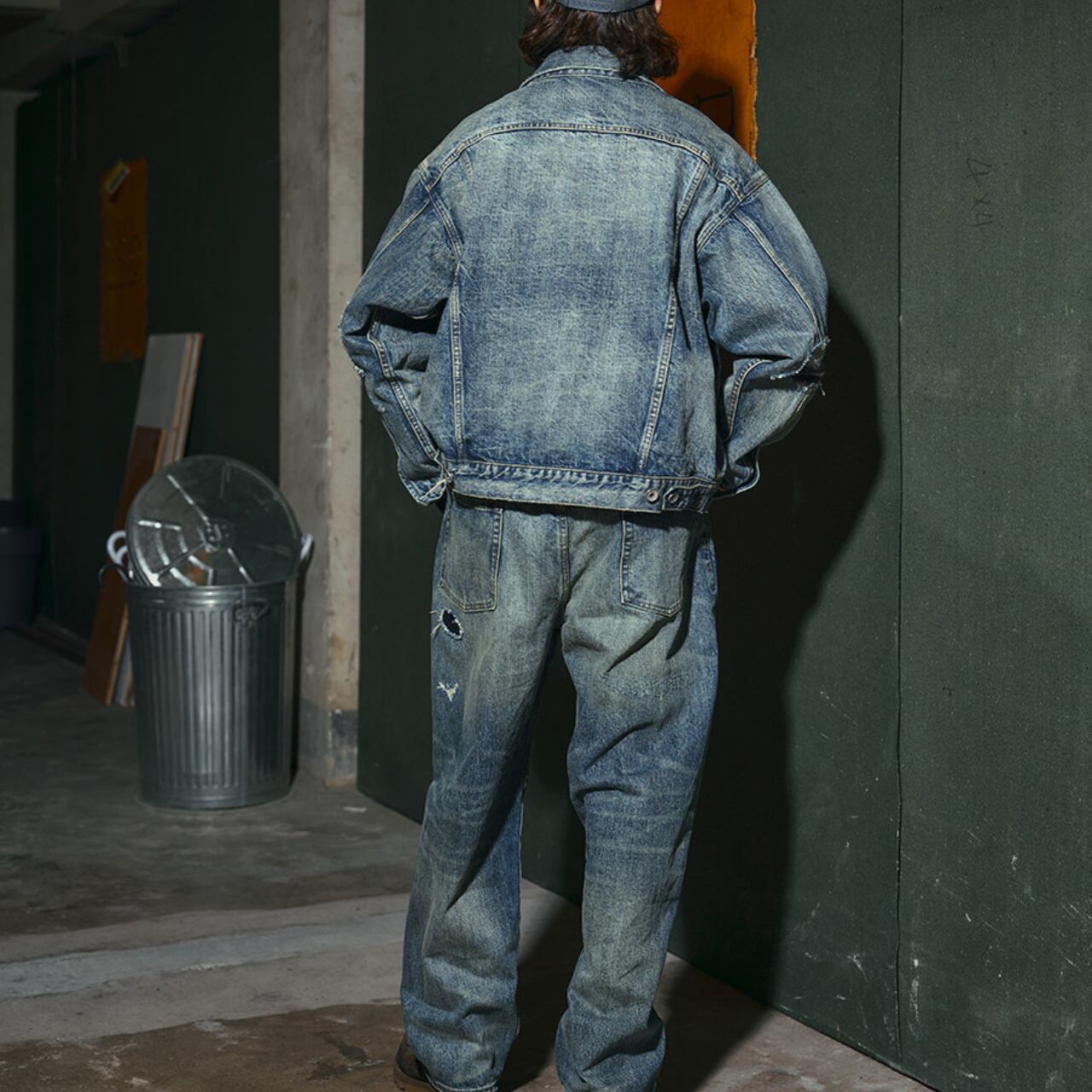 クラシックなワークデニムジャケットをベースに、ナバホ調のパッチワークと手作業によるクラッシュ加工を施した存在感のある一着。洗いをかけた15.5ozのヘビーオンスデニムにより、着込んだようなフェード感と無骨さを表現しています。随所に配された補丁やダメージが一点物のような表情を生み、シンプルなカットソーやスウェットに羽織るだけでスタイリングが完成。デニムオンデニムやワークパンツとの相性も抜群です。