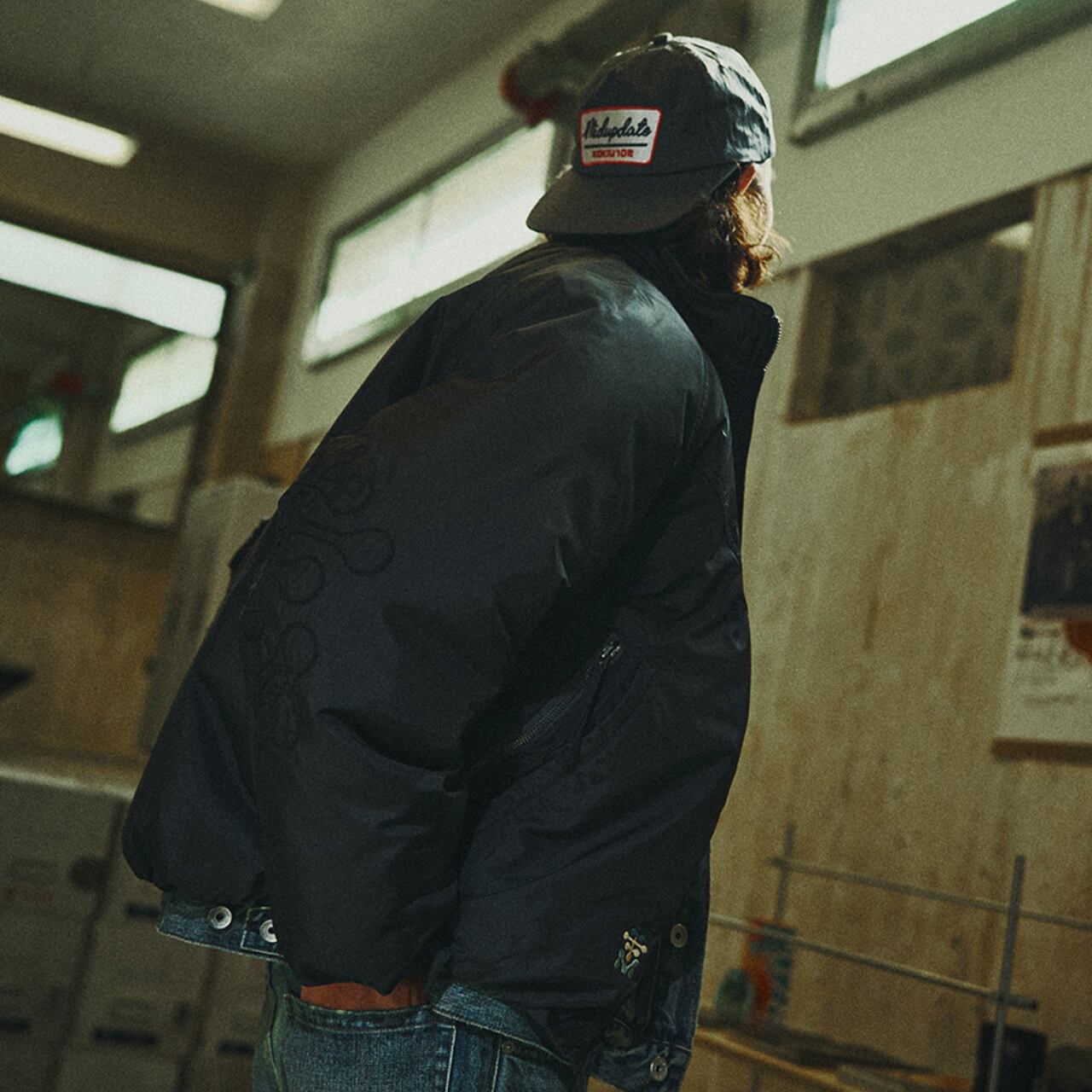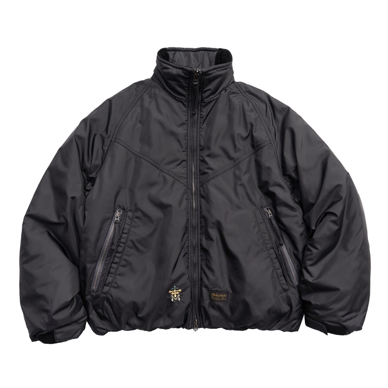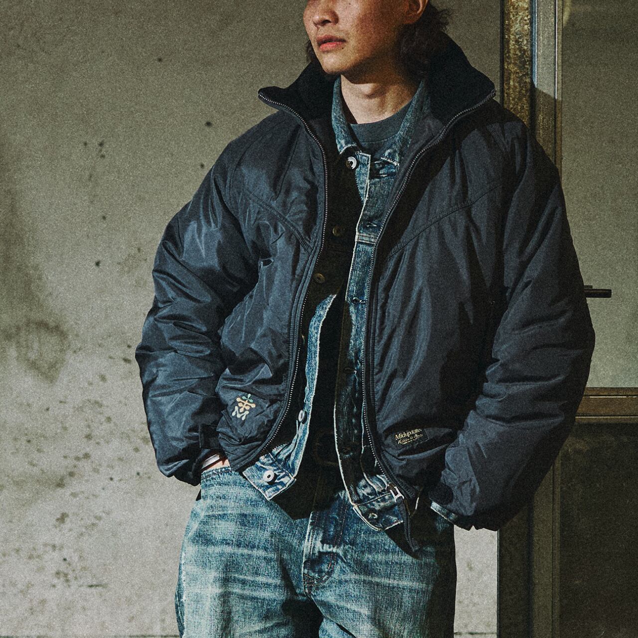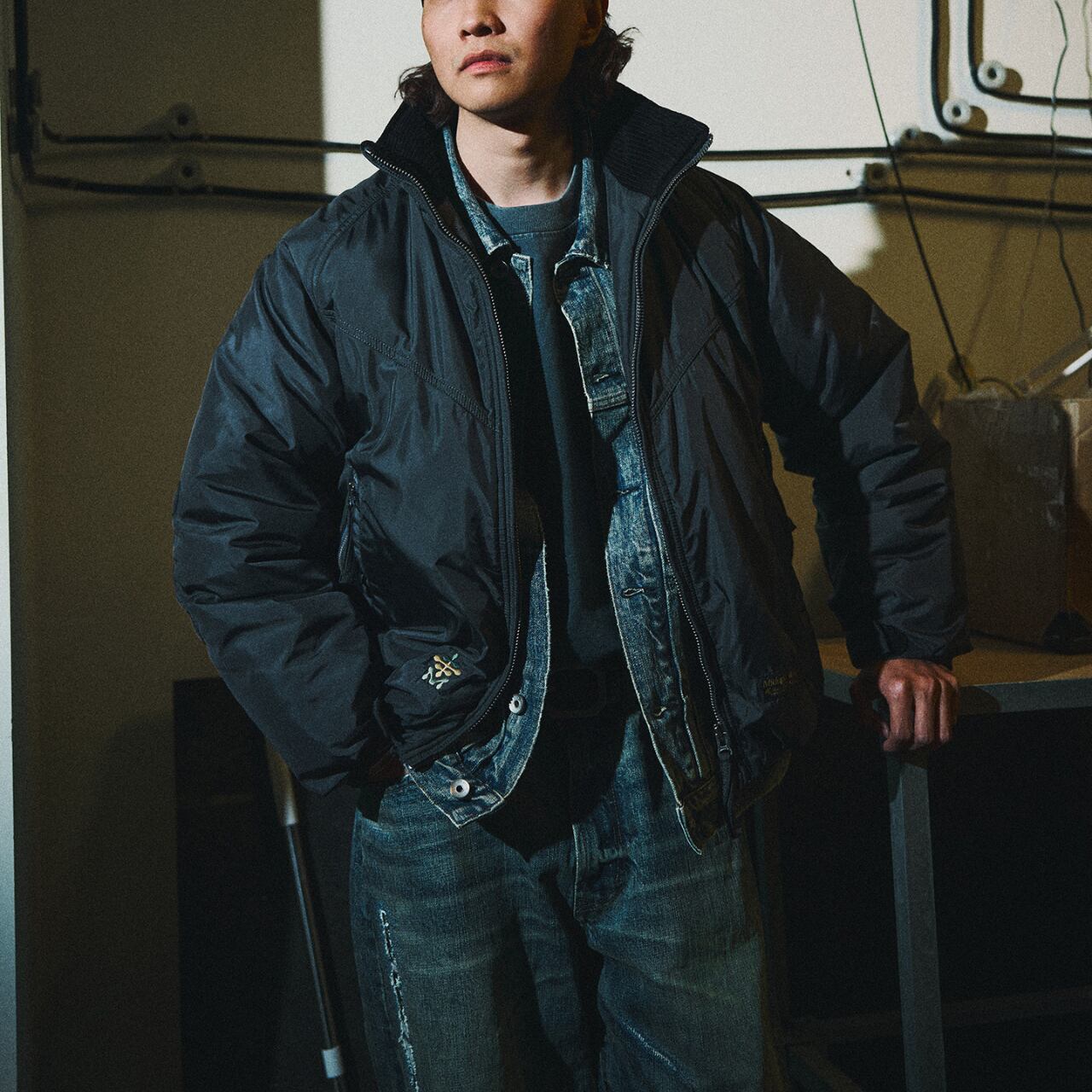 丸みのあるショート丈シルエットとワイドな身幅が特徴の、都会派ファンクショナルジャケット。立体的なスタンドカラーと中綿入りのボリューム感が、防寒性と存在感を両立します。袖部分には精密な刺繍ディテールを施し、ミリタリーやアウトドアの要素をさりげなくプラス。デニムやワークパンツはもちろん、シティスタイルにも自然に溶け込む一着です。