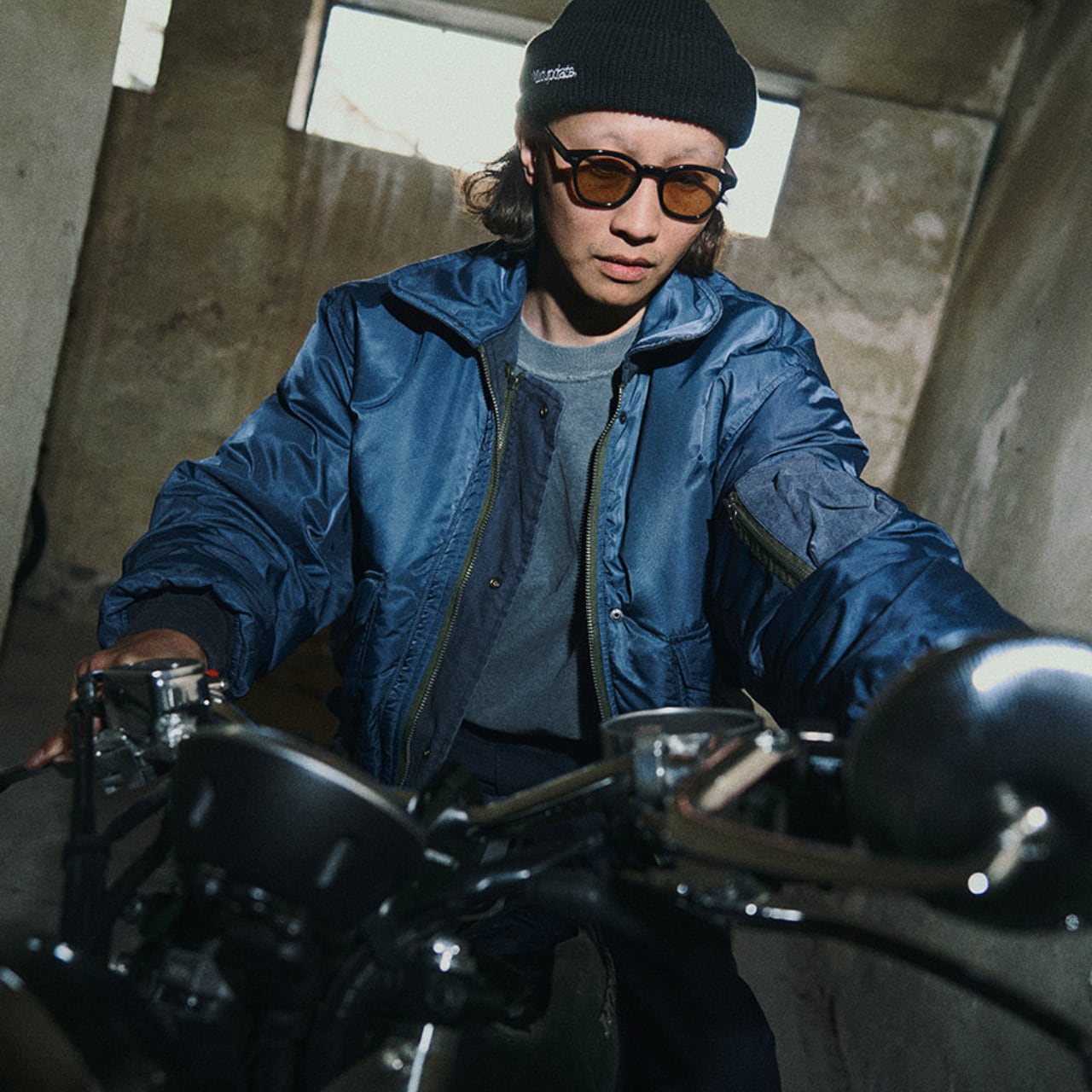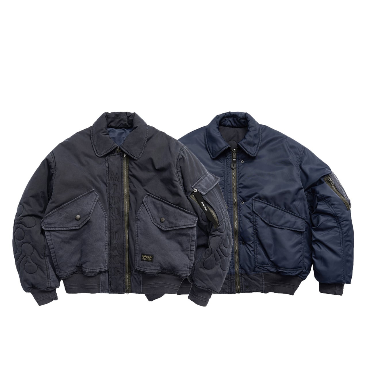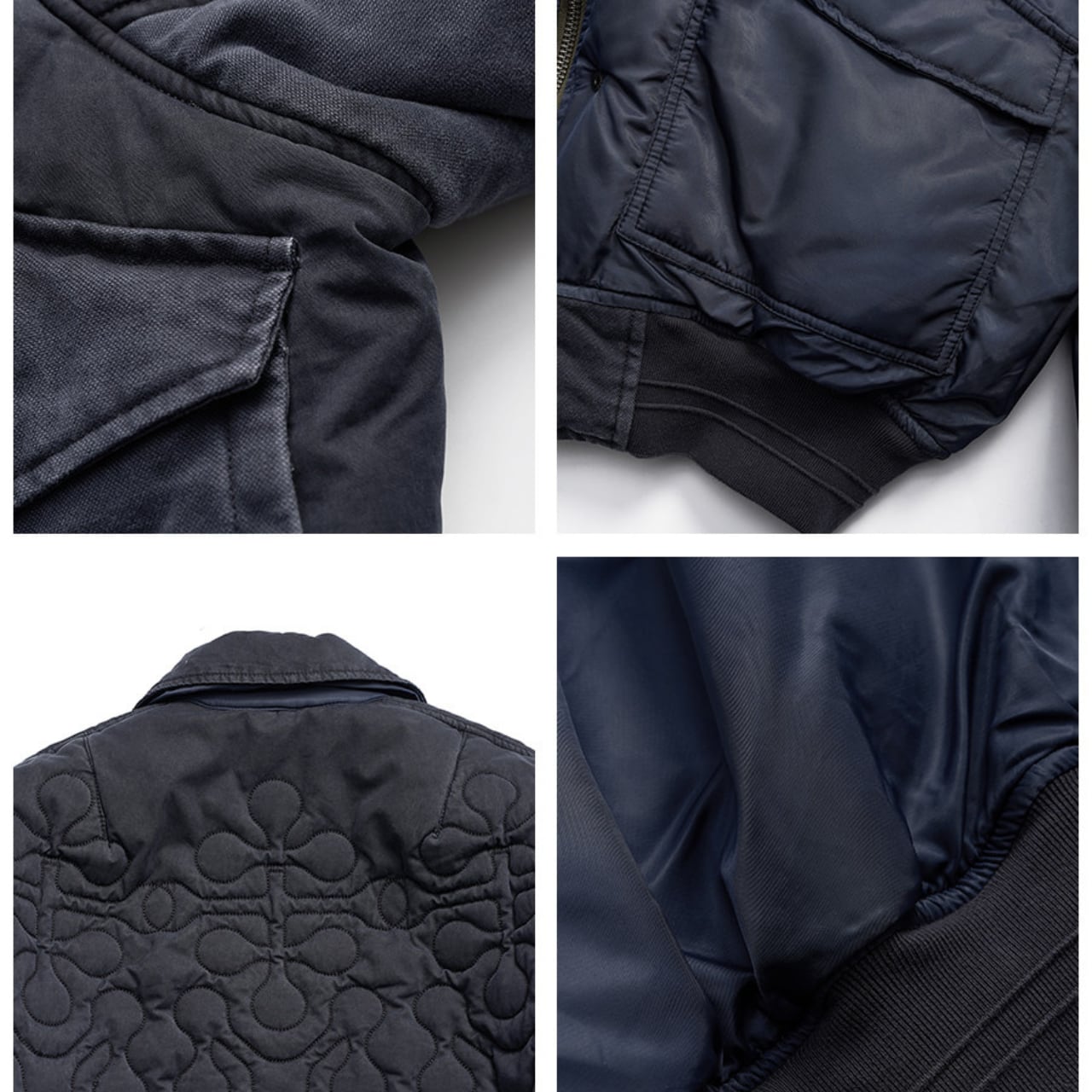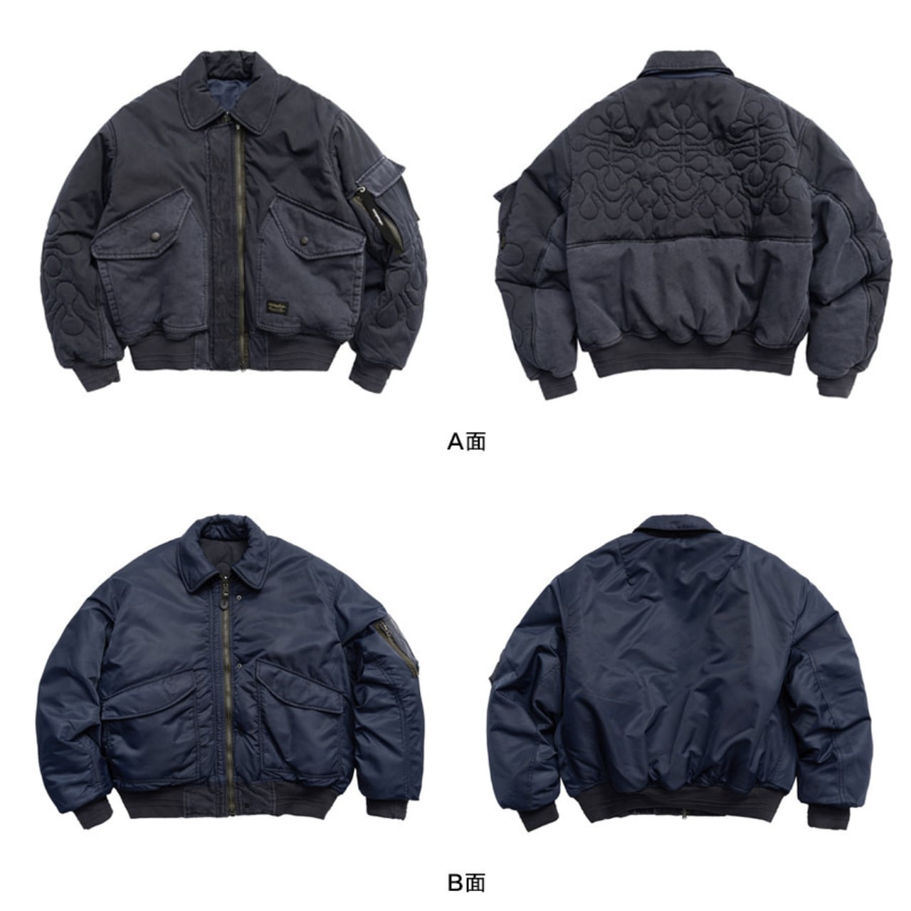 米軍CWU-45Pフライトジャケットを原型に、再解釈を加えたリバーシブル仕様の一着。A面はフェード加工を施したコットン素材に高密度刺繍を配し、無骨で奥行きのあるヴィンテージミリタリースタイルを表現。B面はナイロン素材を用いた軽快な表情で、都会的かつアウトドアにも対応する機能美を備えています。中綿には3Mシンサレートを使用し、防寒性と軽さを両立。デニムやワークパンツ、ブーツとの相性も抜群で、街からフィールドまで活躍するジャケットです。