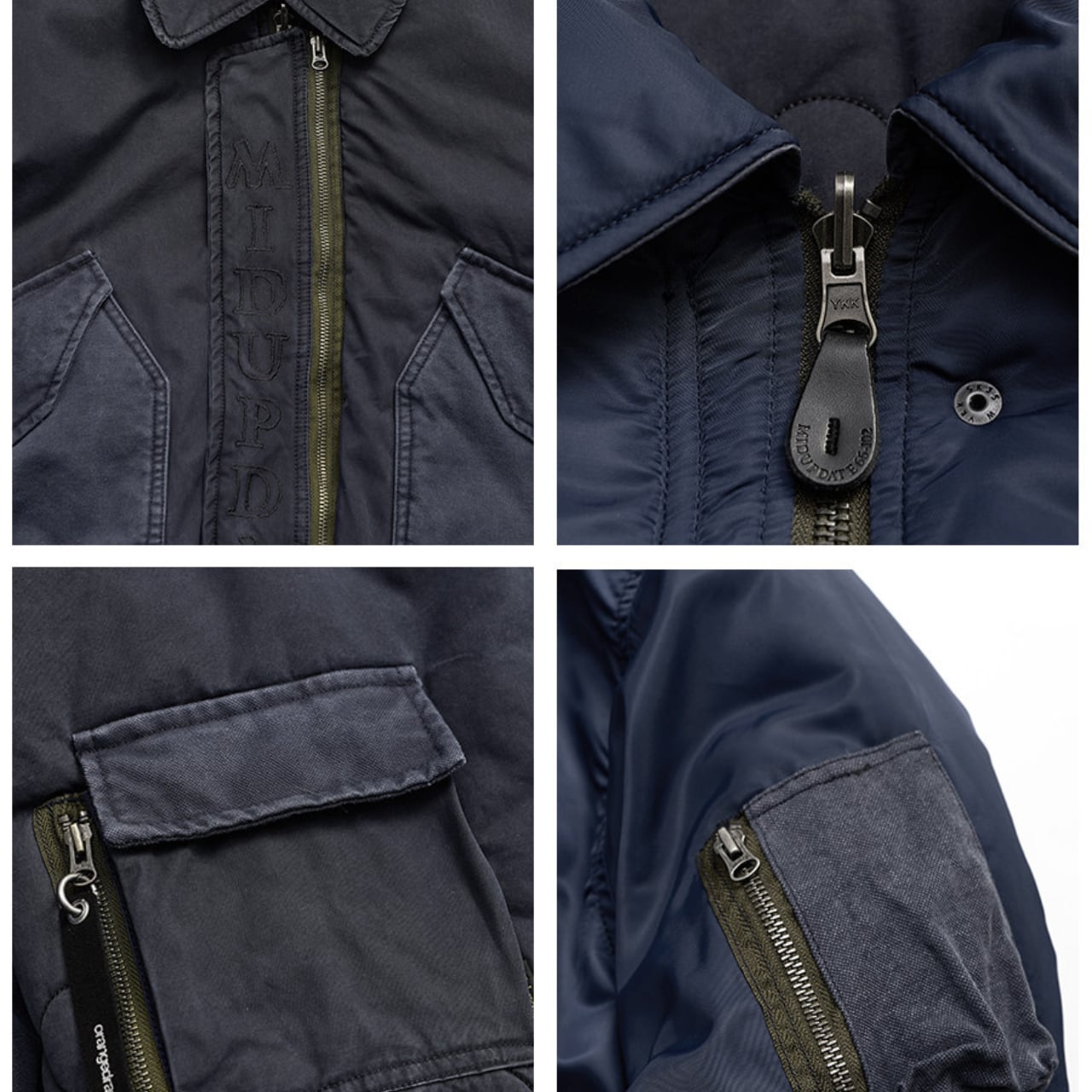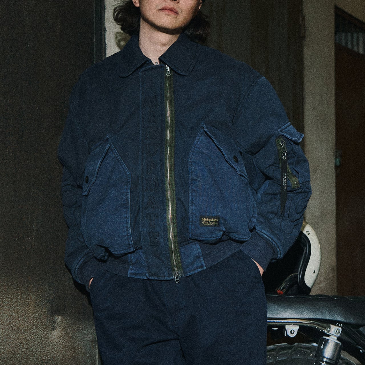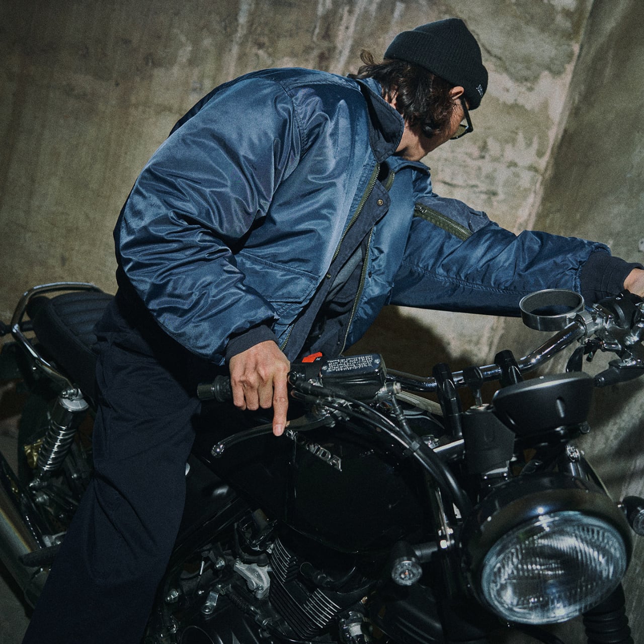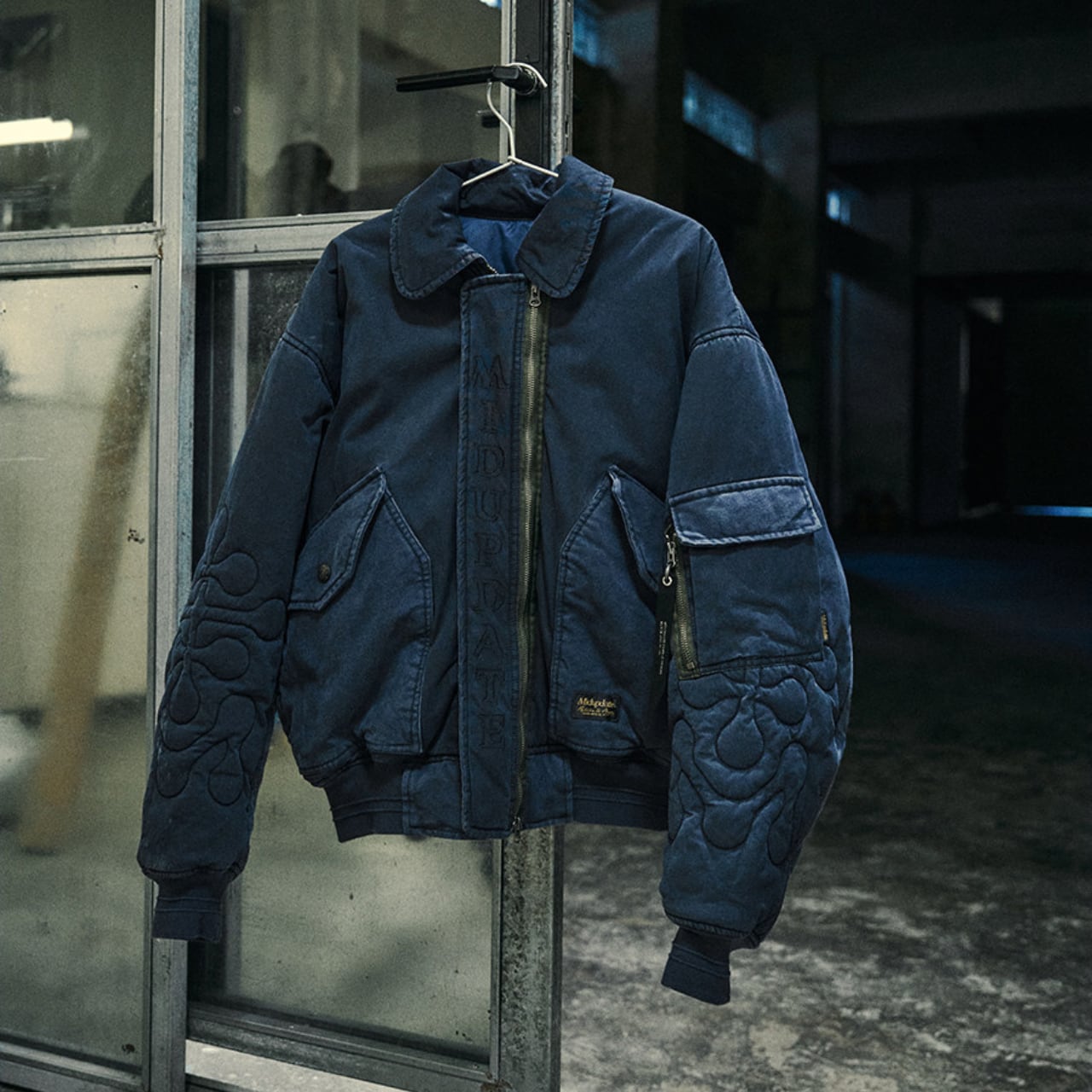 米軍CWU-45Pフライトジャケットを原型に、再解釈を加えたリバーシブル仕様の一着。A面はフェード加工を施したコットン素材に高密度刺繍を配し、無骨で奥行きのあるヴィンテージミリタリースタイルを表現。B面はナイロン素材を用いた軽快な表情で、都会的かつアウトドアにも対応する機能美を備えています。中綿には3Mシンサレートを使用し、防寒性と軽さを両立。デニムやワークパンツ、ブーツとの相性も抜群で、街からフィールドまで活躍するジャケットです。